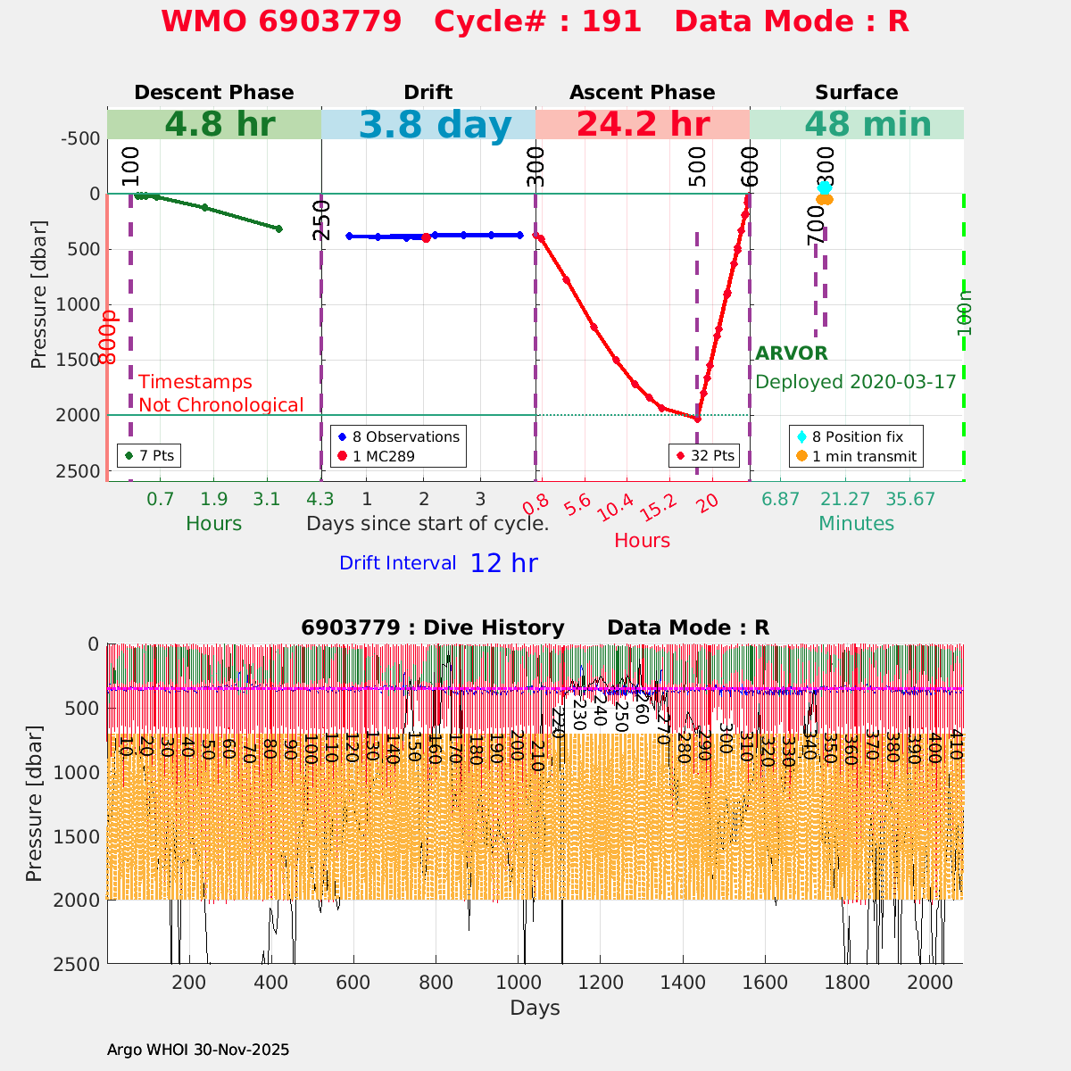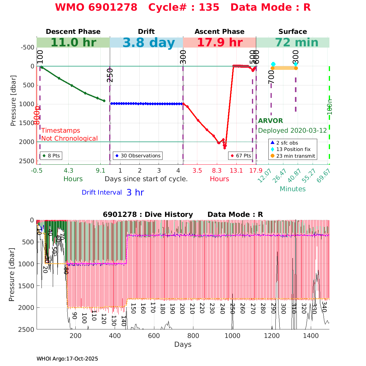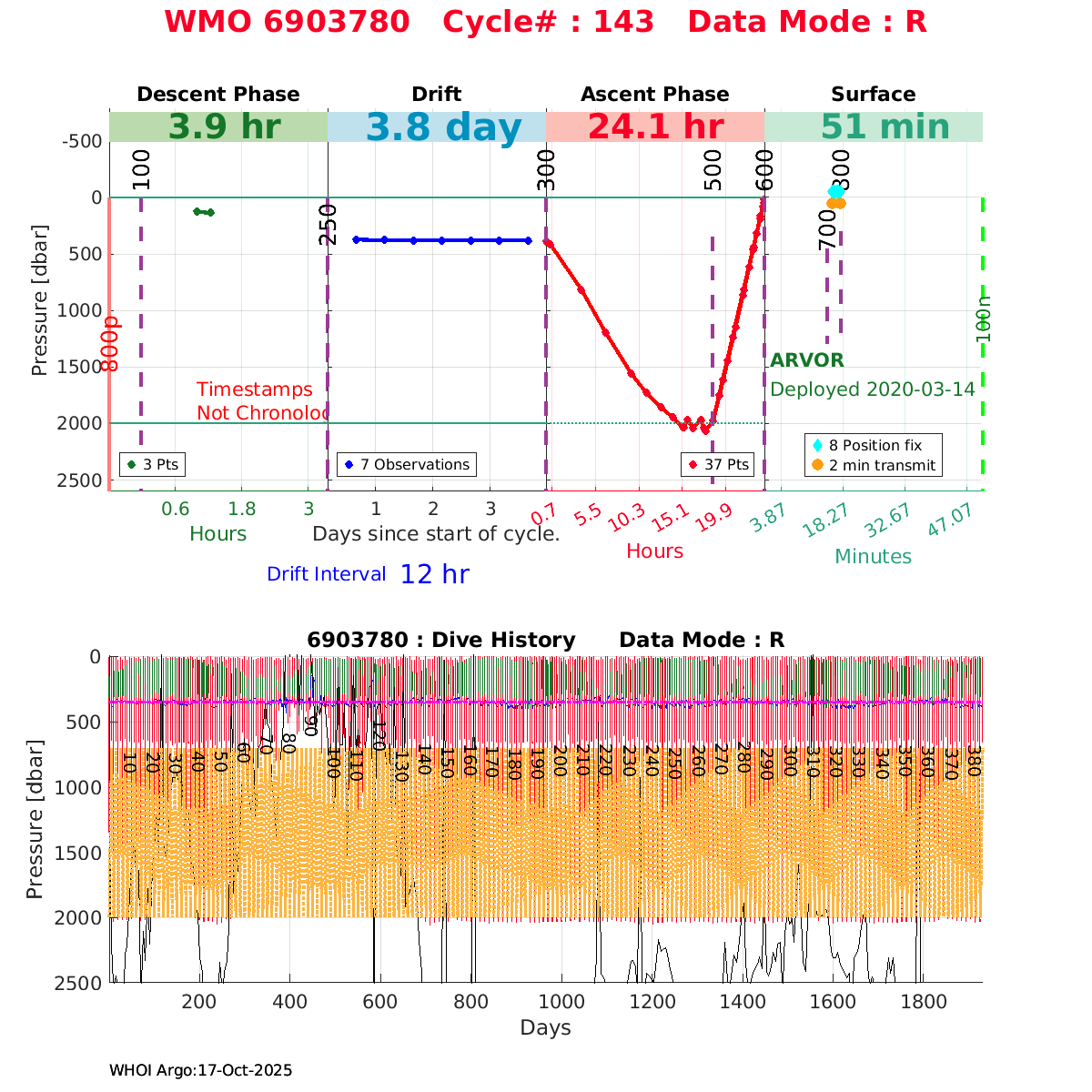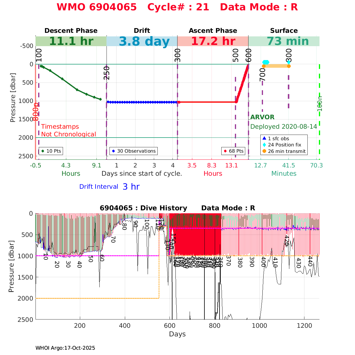 | WMO: #6903784 DAC: coriolis PI: Pierre-Marie POULAIN ARVOR: # FLOATCLOCK: # DRUCK_2900PSIA: #11162136 SBE41CP: #11711 Altimeter Comparison (IFREMER) EuroArgo Link | ![]() |