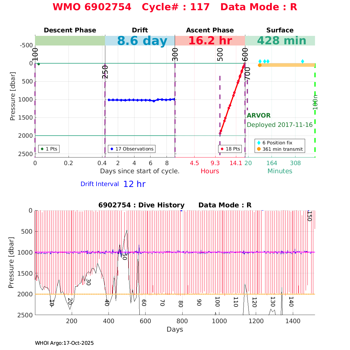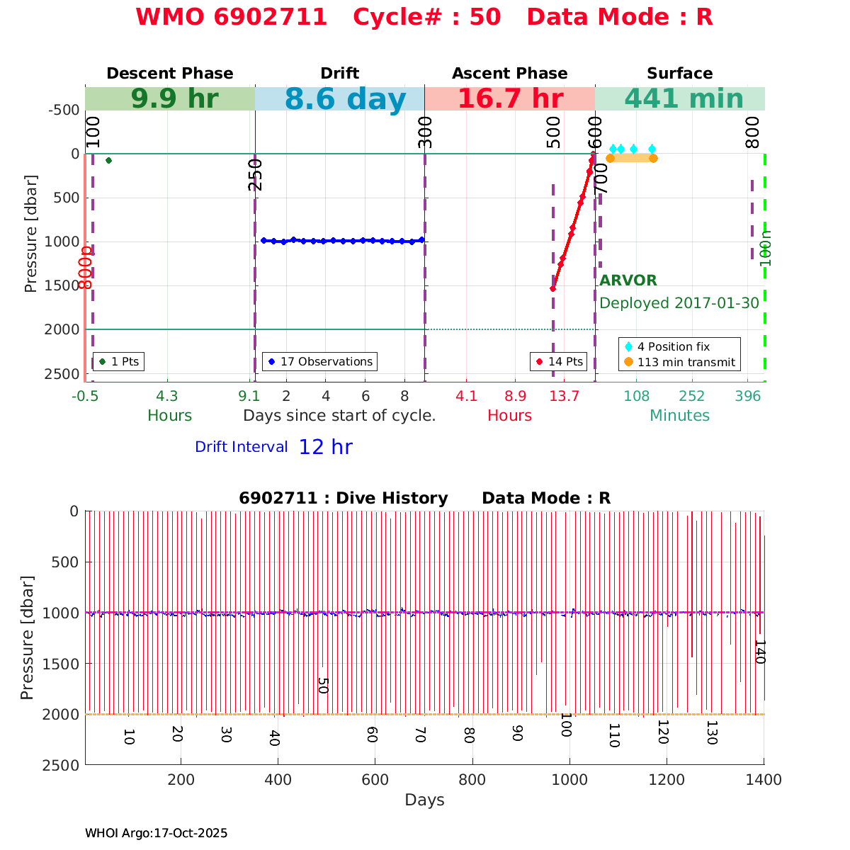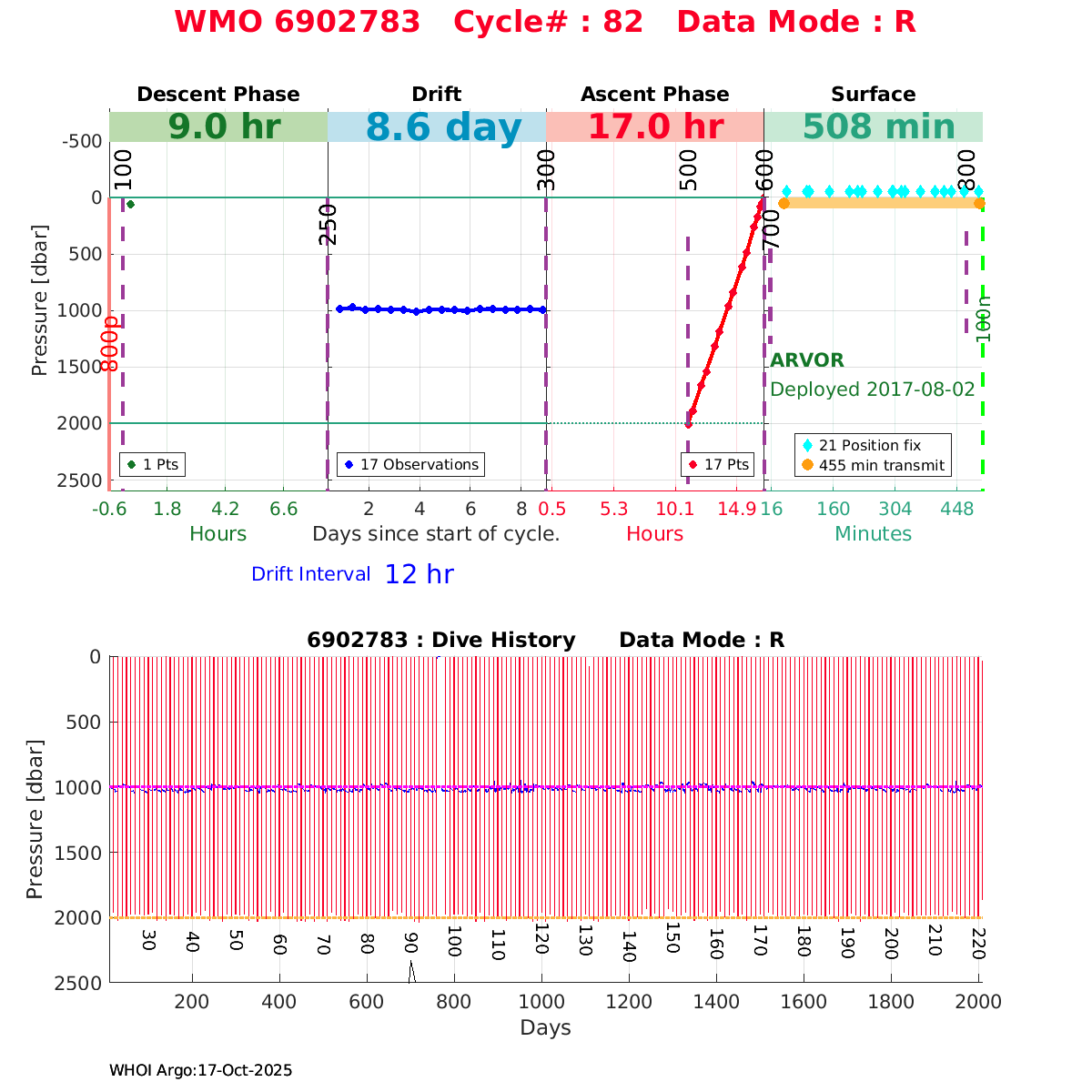 | WMO: #6902711 DAC: coriolis PI: Christine COATANOAN ARVOR: # KISTLER_2900PSIA: #4780002 SBE41CP_V7.2.5: #8214 Altimeter Comparison (IFREMER) EuroArgo Link | ![]() |