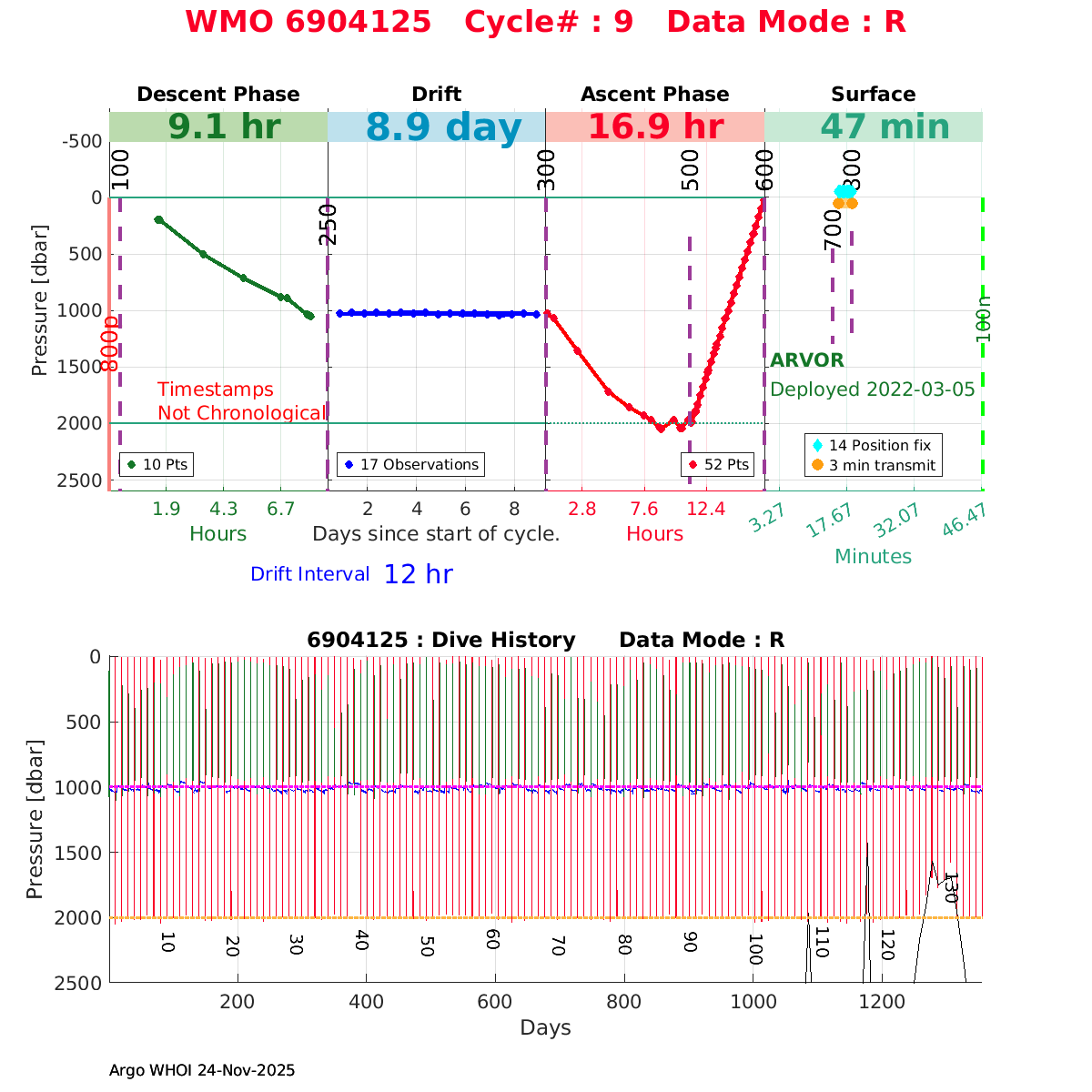 | WMO: #6904125 DAC: coriolis PI: Birgit KLEIN ARVOR: # FLOATCLOCK: # DRUCK_2900PSIA: #11829155 SBE41CP: #14279 Altimeter Comparison (IFREMER) EuroArgo Link | ![]() |
