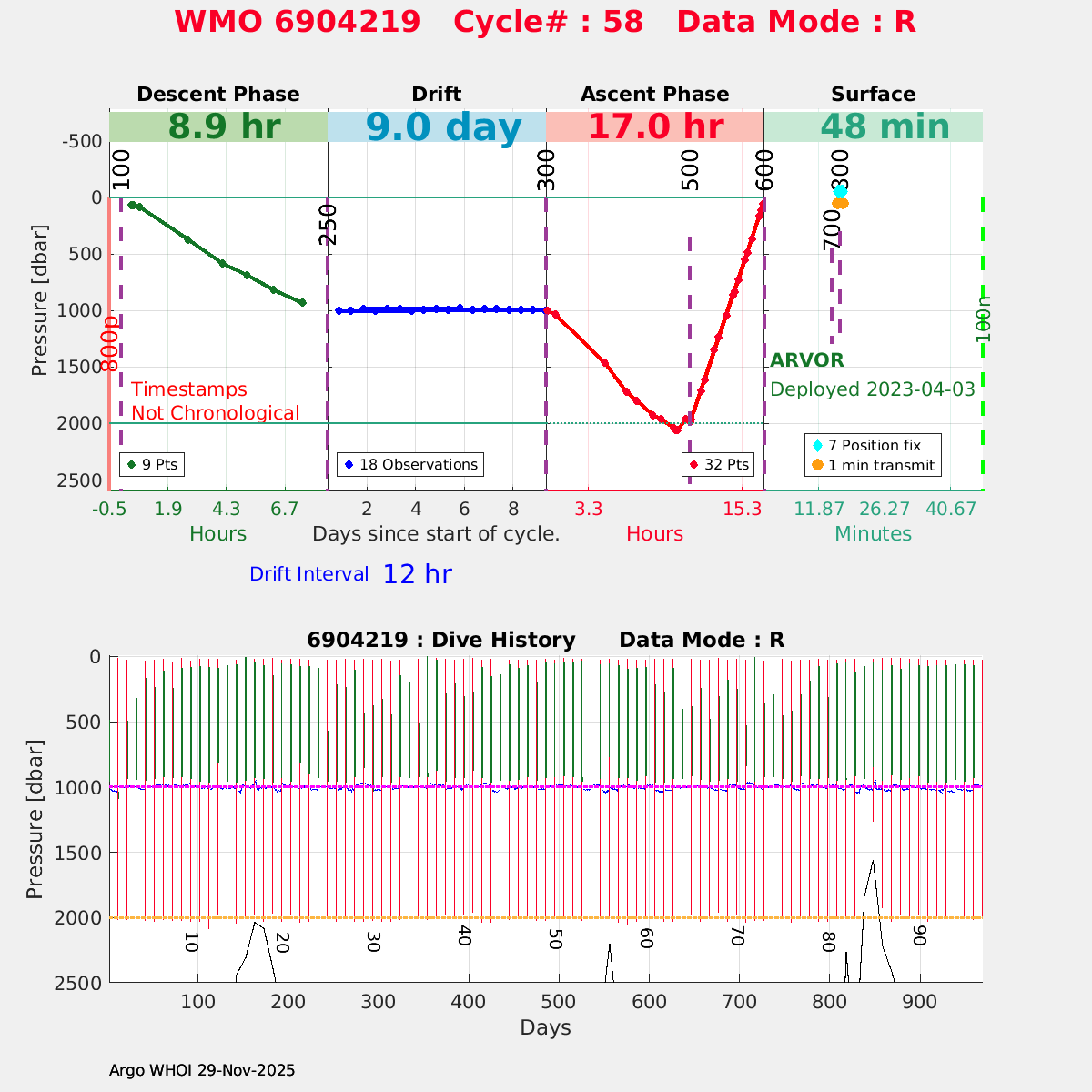 | WMO: #6904219 DAC: coriolis PI: Birgit KLEIN ARVOR: # FLOATCLOCK: # DRUCK: #12119255 SBE41CP: #17530 Altimeter Comparison (IFREMER) EuroArgo Link | ![]() |