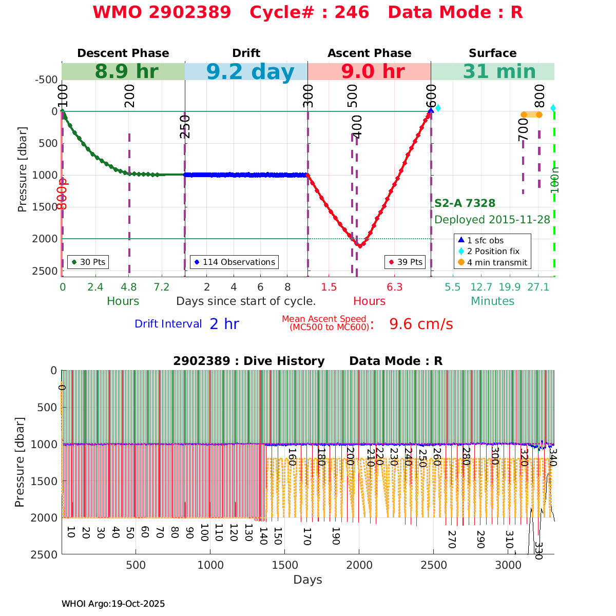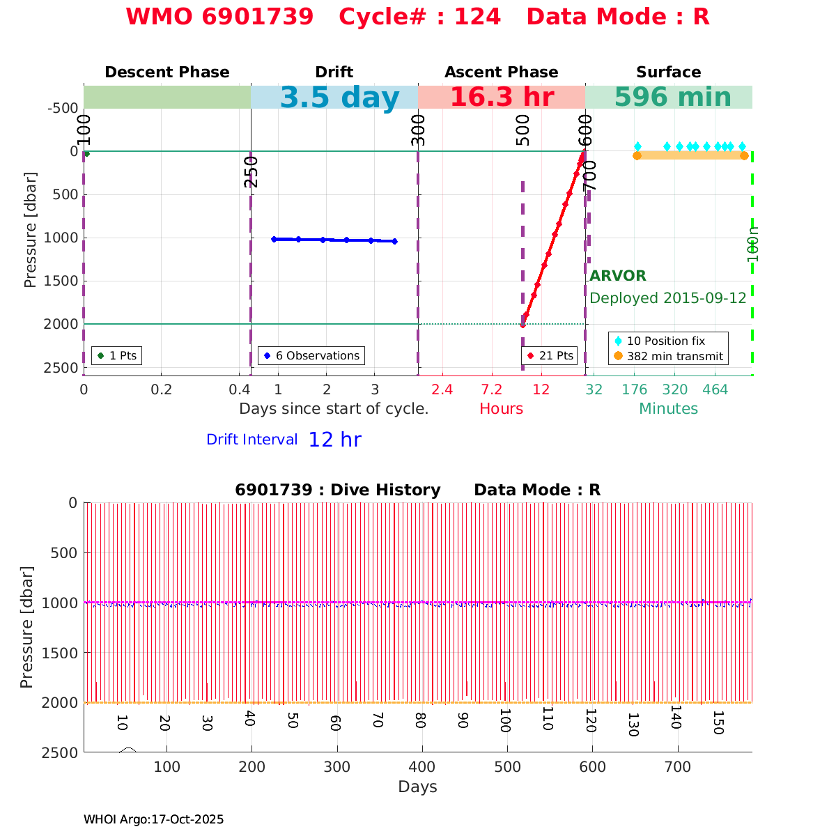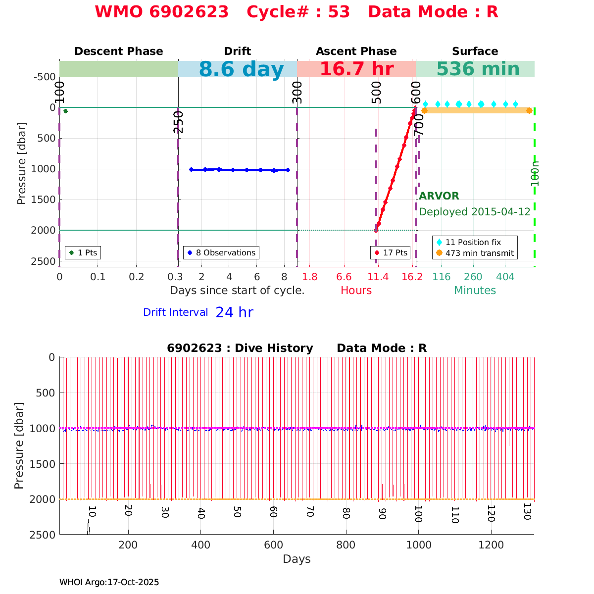 | WMO: #6901739 DAC: coriolis PI: Fabien DURAND ARVOR: # FLOATCLOCK: # KISTLER_2900PSIA: #2157430 SBE41CP_V2: #6382 Altimeter Comparison (IFREMER) EuroArgo Link | ![]() |
