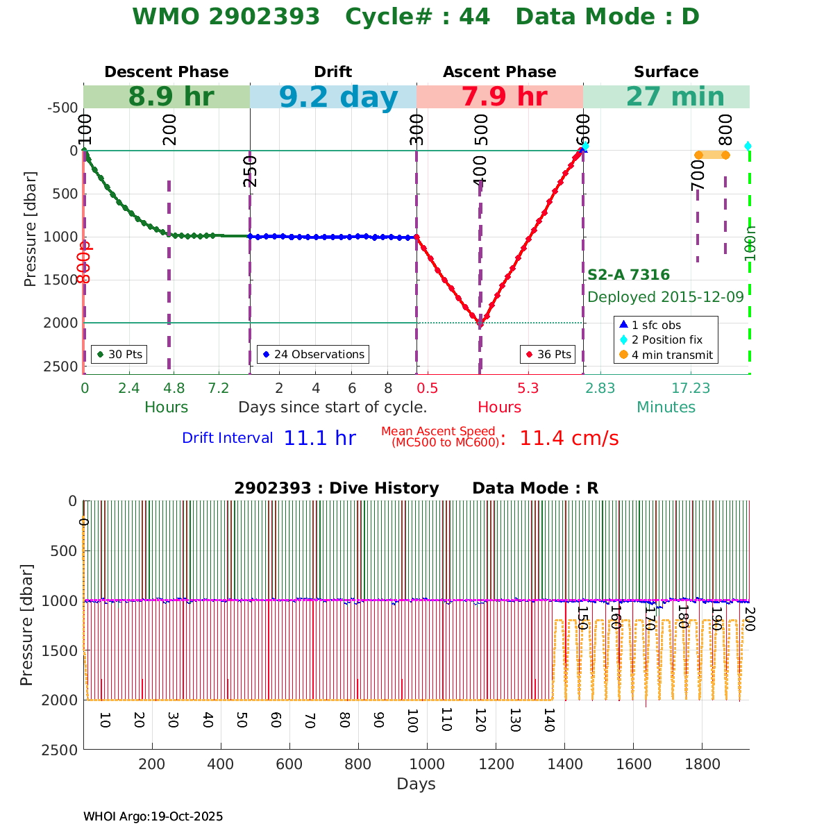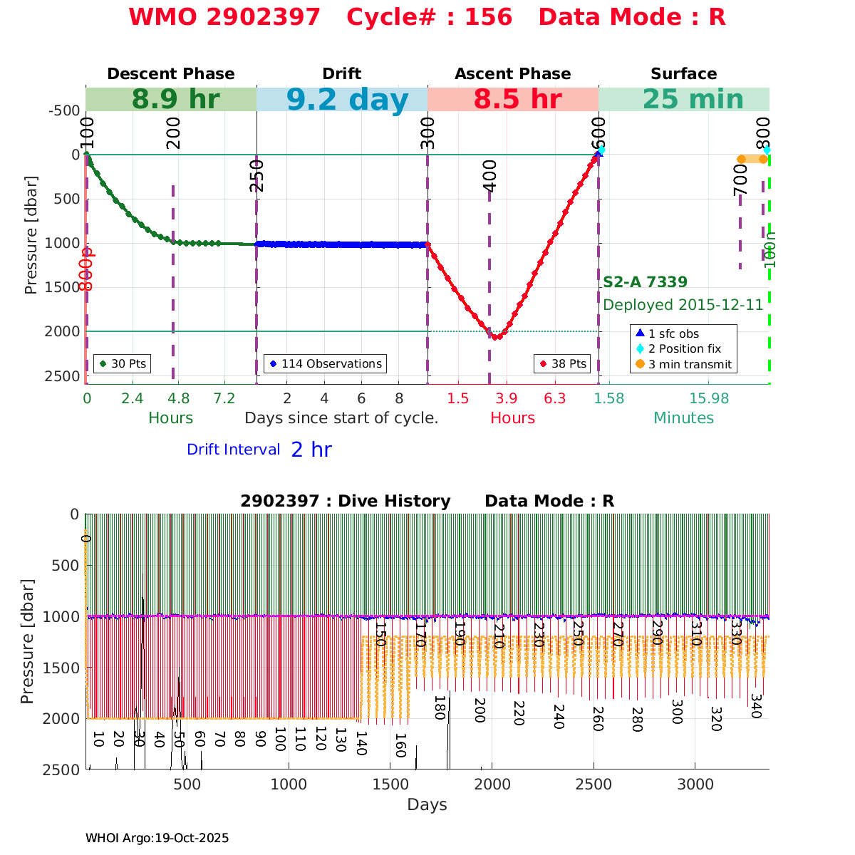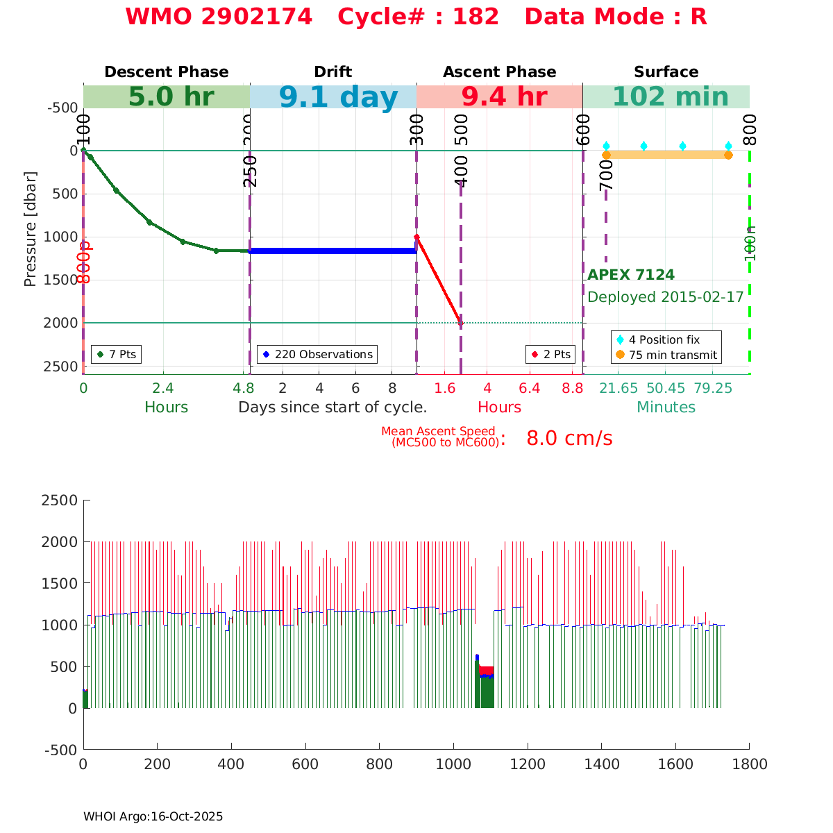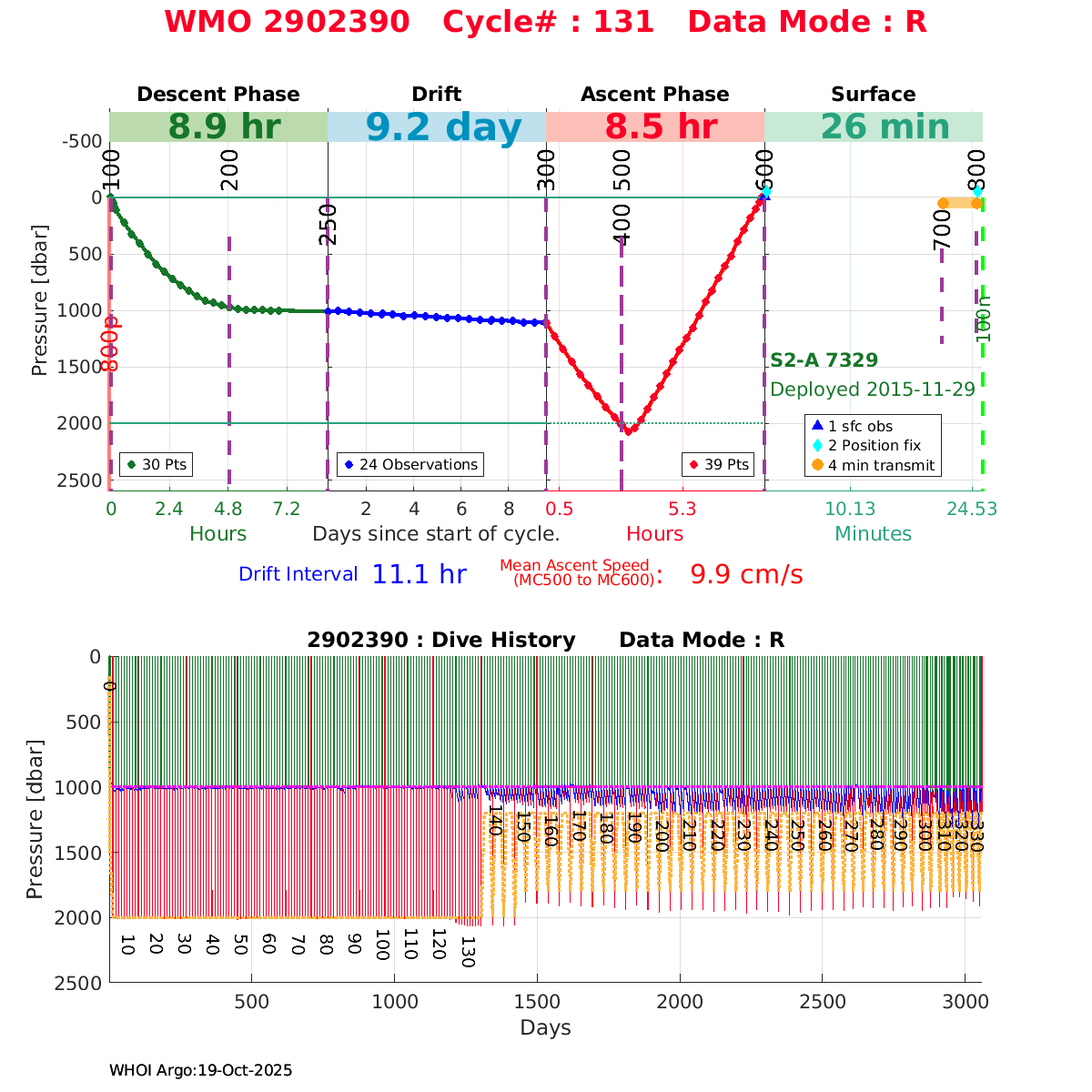 | WMO: #6901739 DAC: coriolis PI: Fabien DURAND ARVOR: # FLOATCLOCK: # KISTLER_2900PSIA: #2157430 SBE41CP_V2: #6382 Altimeter Comparison (IFREMER) EuroArgo Link | ![]() |