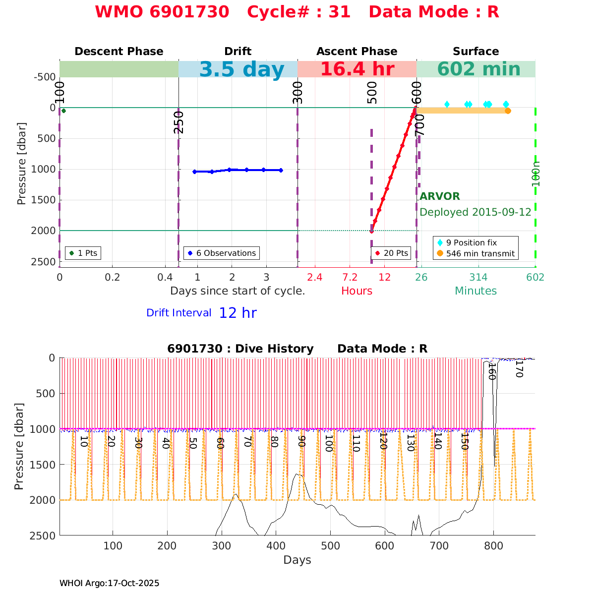 | WMO: #6901730 DAC: coriolis PI: Fabien DURAND ARVOR: # FLOATCLOCK: # KISTLER_2900PSIA: #2152080 SBE41CP_V2: #6217 Altimeter Comparison (IFREMER) EuroArgo Link | ![]() |