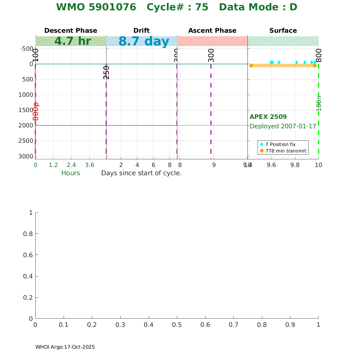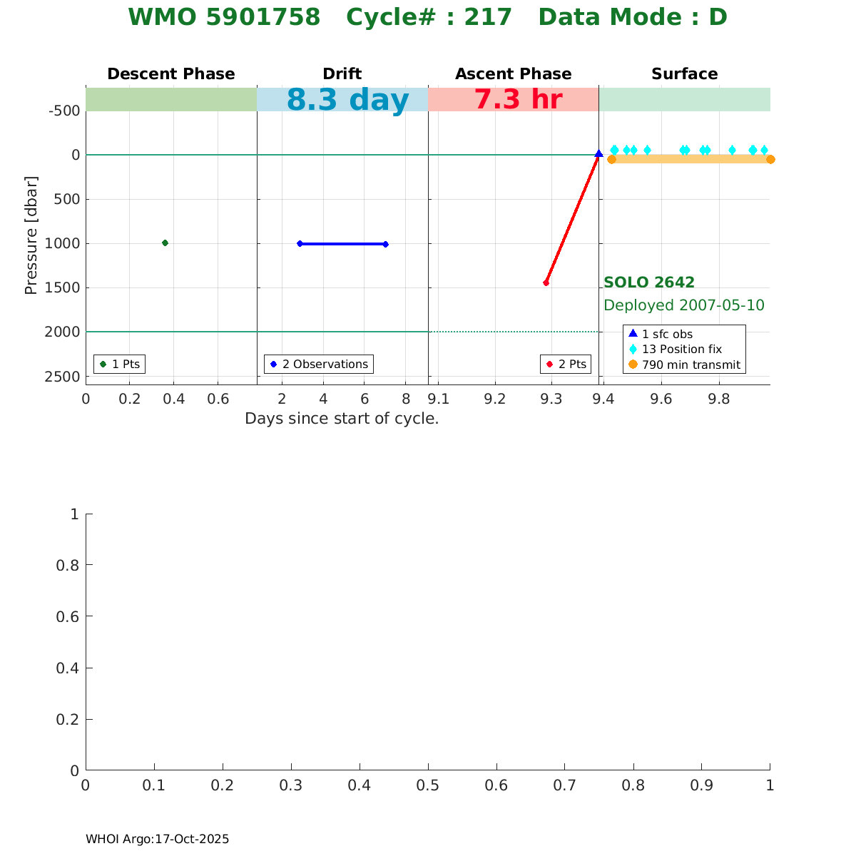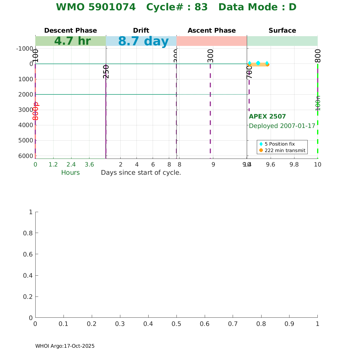 | WMO: #2900688 DAC: jma PI: JAMSTEC APEX: #3032 DRUCK: #2317526 SBE41: #3083 Altimeter Comparison (IFREMER) EuroArgo Link | ![]() |