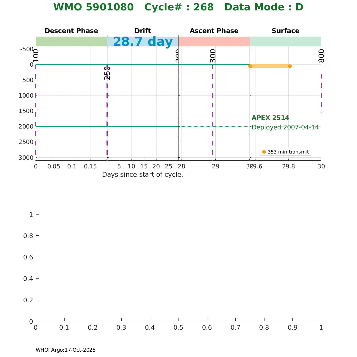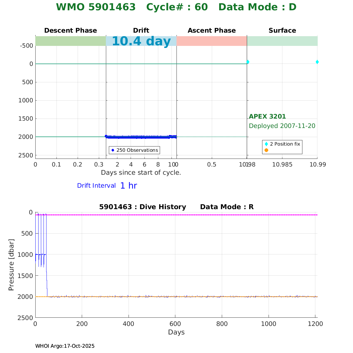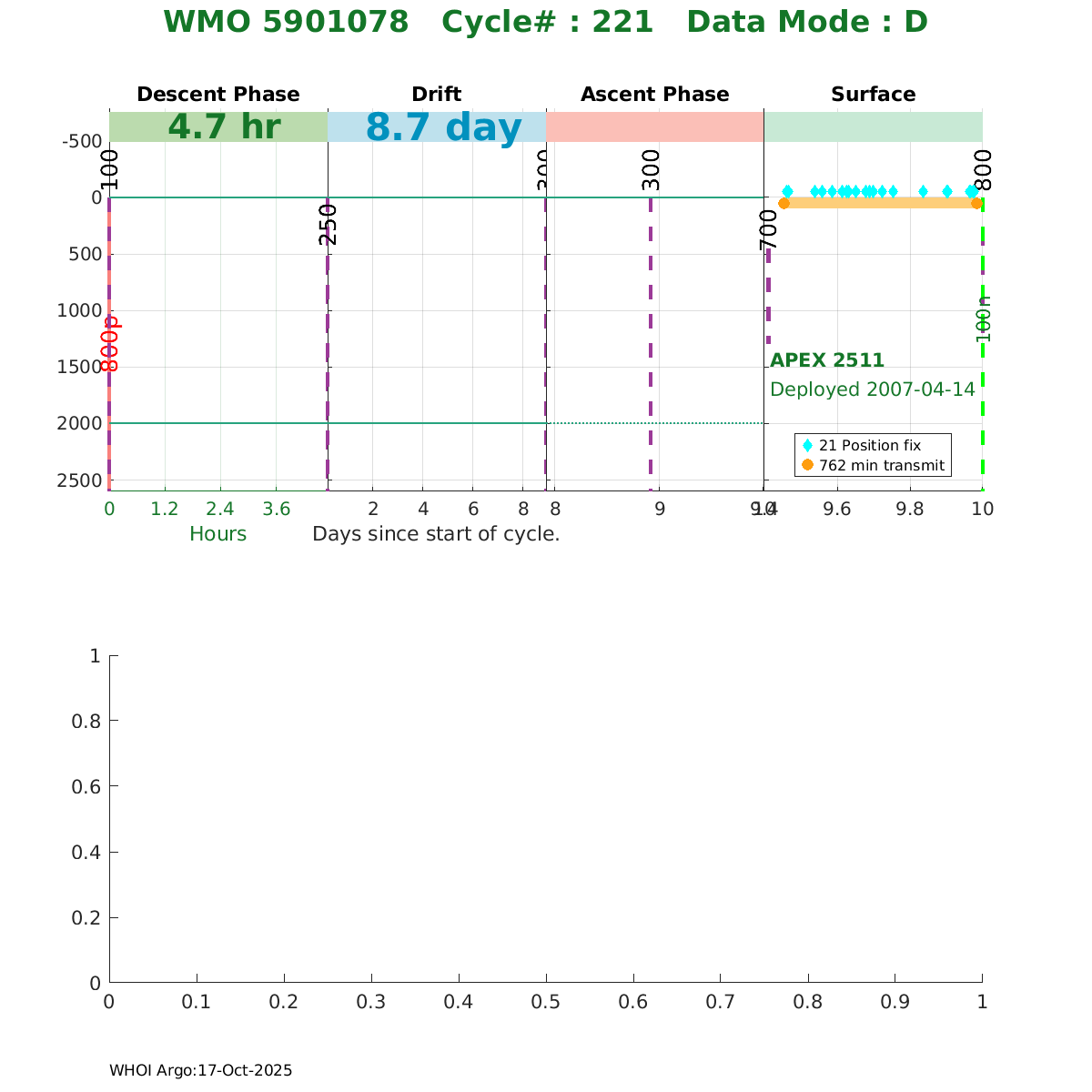 | WMO: #2900688 DAC: jma PI: JAMSTEC APEX: #3032 DRUCK: #2317526 SBE41: #3083 Altimeter Comparison (IFREMER) EuroArgo Link | ![]() |