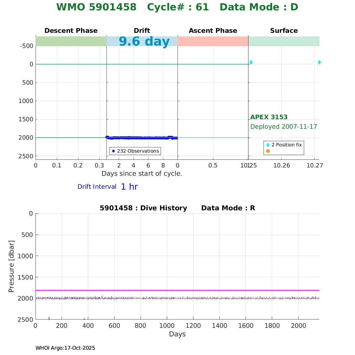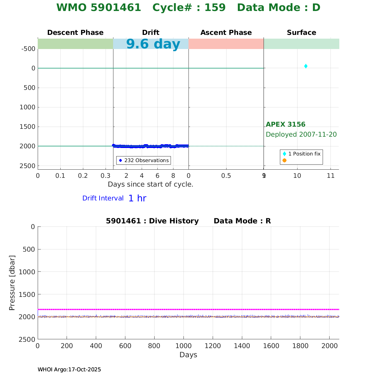 | WMO: #5901461 DAC: aoml PI: STEPHEN RISER APEX: #3156 SBE41CP: #1979 DRUCK_2900PSIA: #2432184 SBE43F_IDO: #0231 Altimeter Comparison (IFREMER) EuroArgo Link | ![]() |