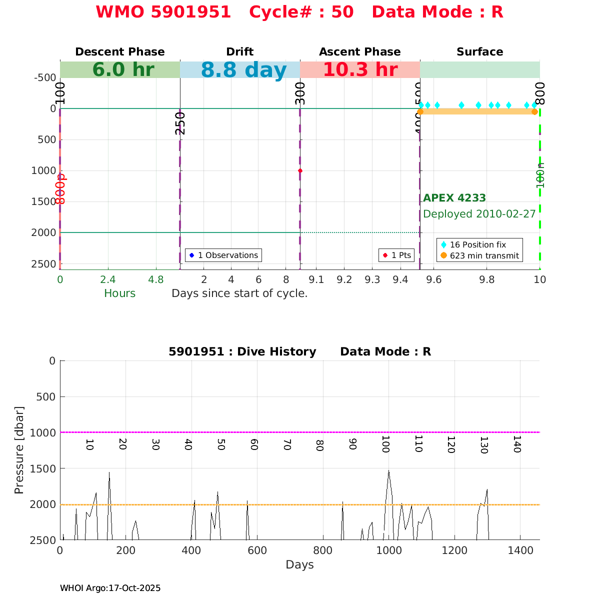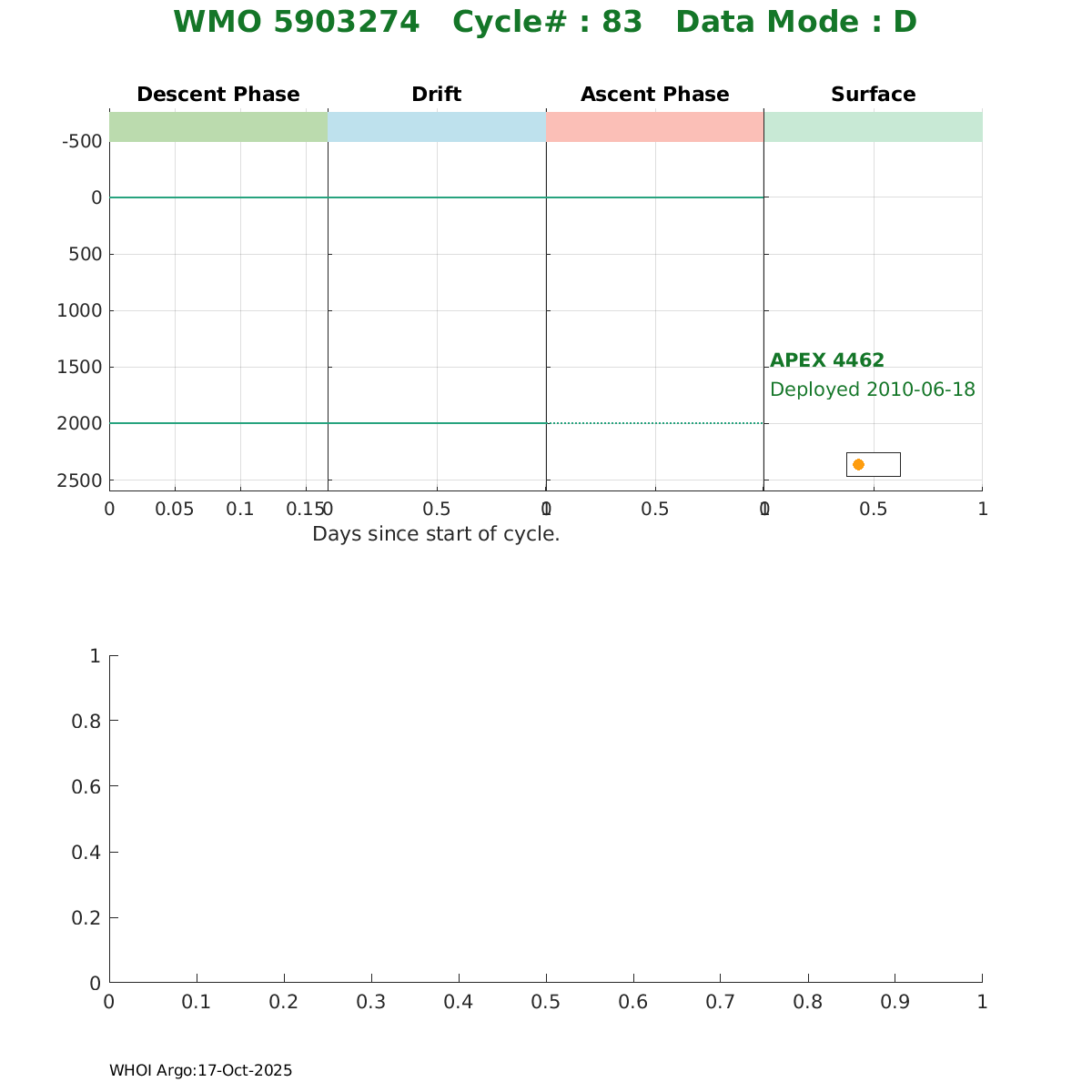 | WMO: #5901951 DAC: jma PI: JAMSTEC APEX: #4233 KISTLER: #2074728 SBE41: #4226 Altimeter Comparison (IFREMER) EuroArgo Link | ![]() |