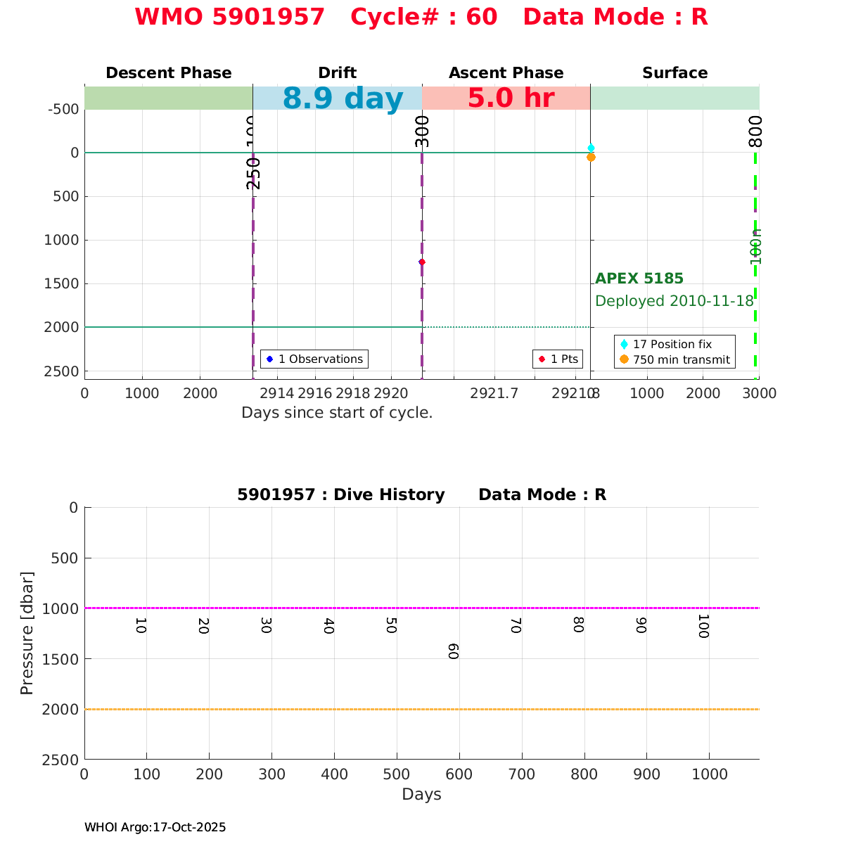 | WMO: #5901957 DAC: jma PI: JAMSTEC APEX: #5185 KISTLER: #2080579 SBE41: #5061 Altimeter Comparison (IFREMER) EuroArgo Link | ![]() |