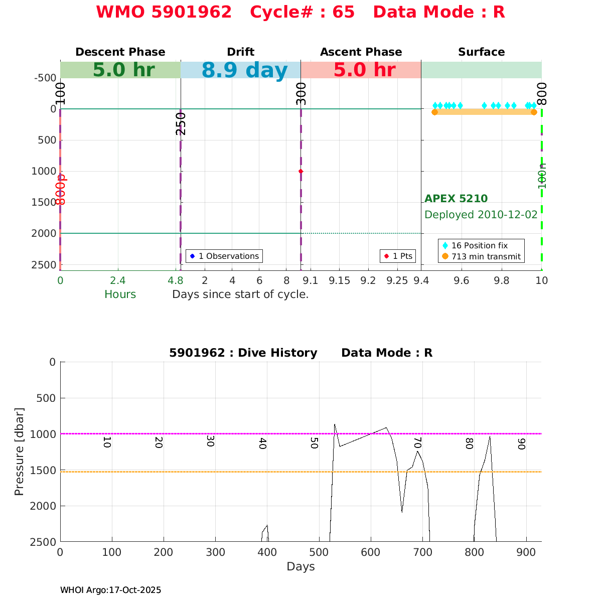 | WMO: #5901962 DAC: jma PI: JAMSTEC APEX: #5210 KISTLER: #2080560 SBE41: #5041 Altimeter Comparison (IFREMER) EuroArgo Link | ![]() |