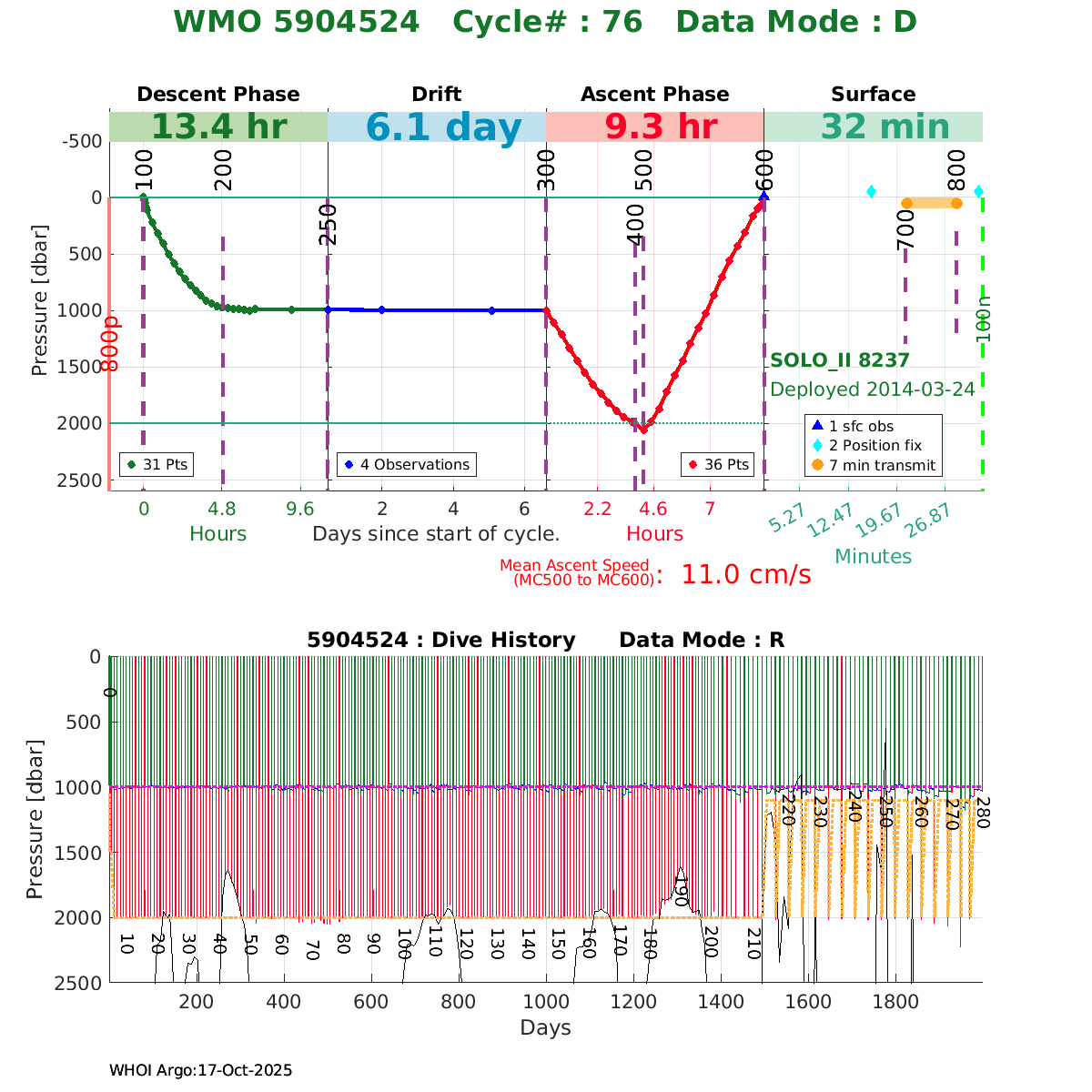 | WMO: #5904527 DAC: aoml PI: Dean ROEMMICH SOLO_II: #8240 DRUCK_2900PSIA: #3809766 SBE41CP: #5302 Altimeter Comparison (IFREMER) EuroArgo Link | ![]() |