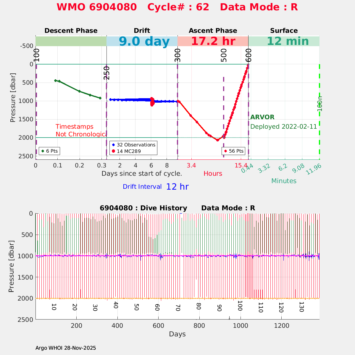 | WMO: #6904208 DAC: coriolis PI: Birgit KLEIN ARVOR: # FLOATCLOCK: # DRUCK: #11894205 SBE41CP: #16688 Altimeter Comparison (IFREMER) EuroArgo Link | ![]() |