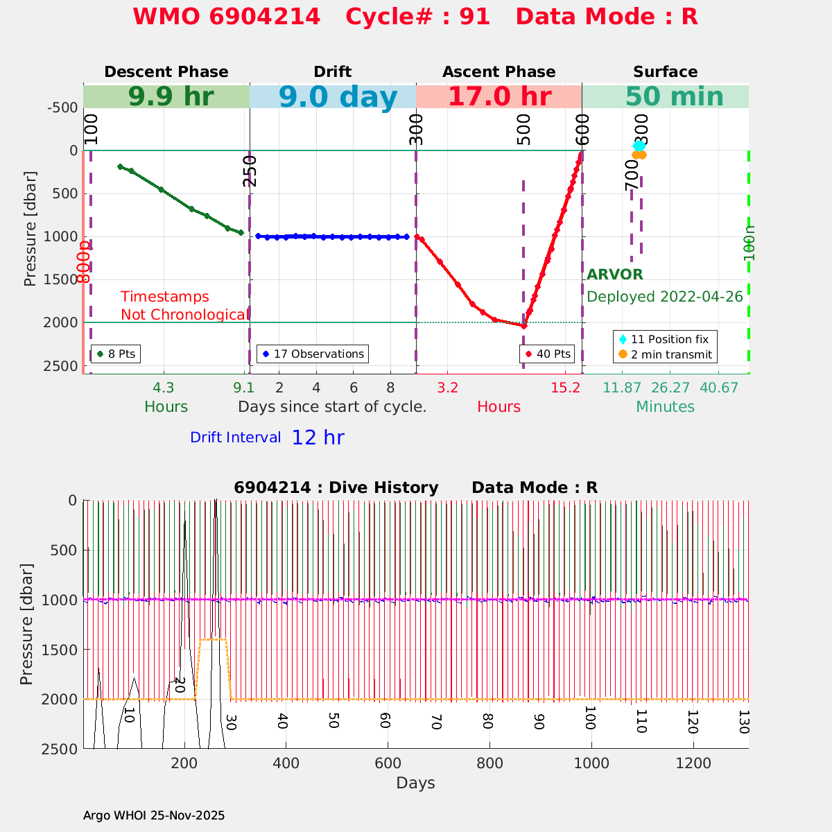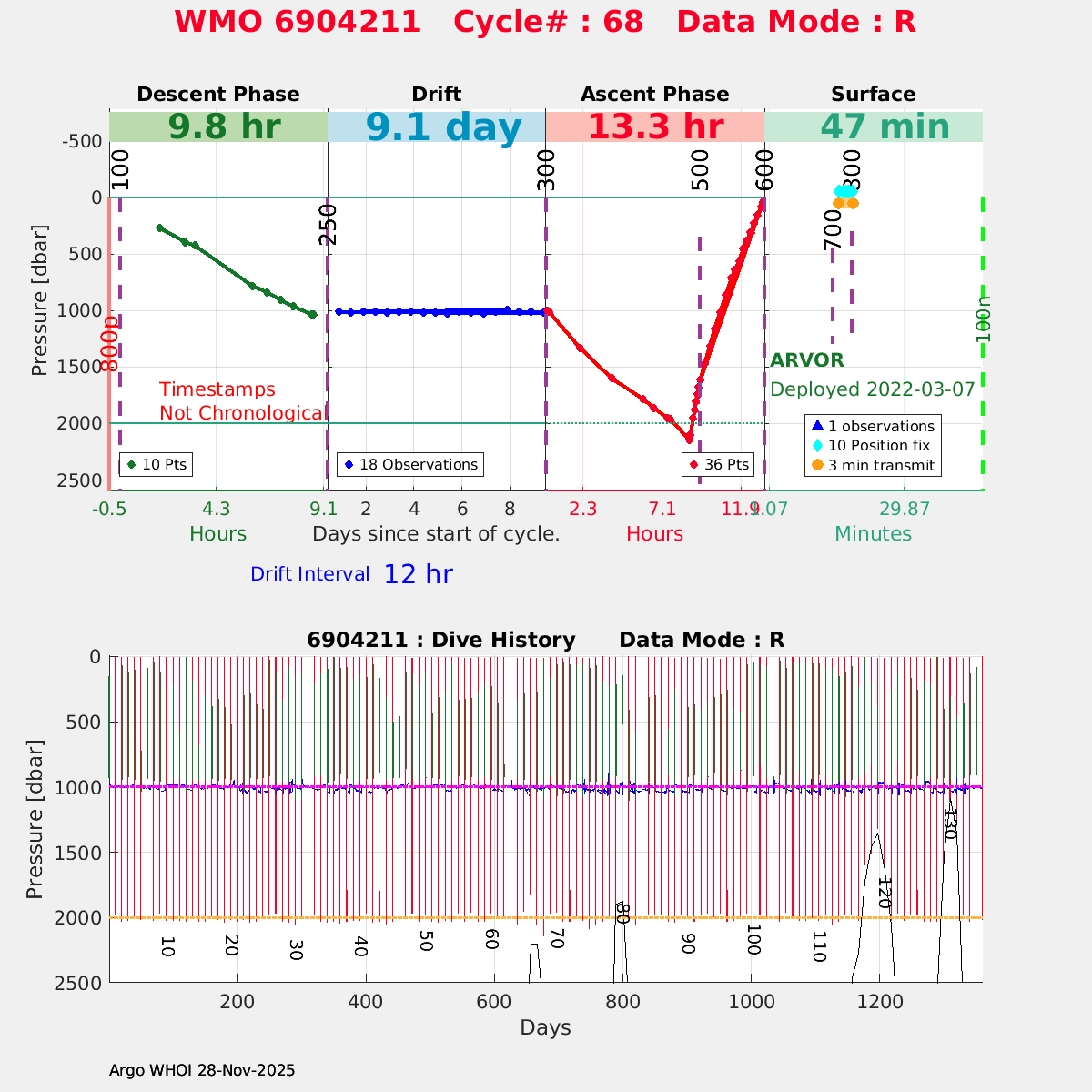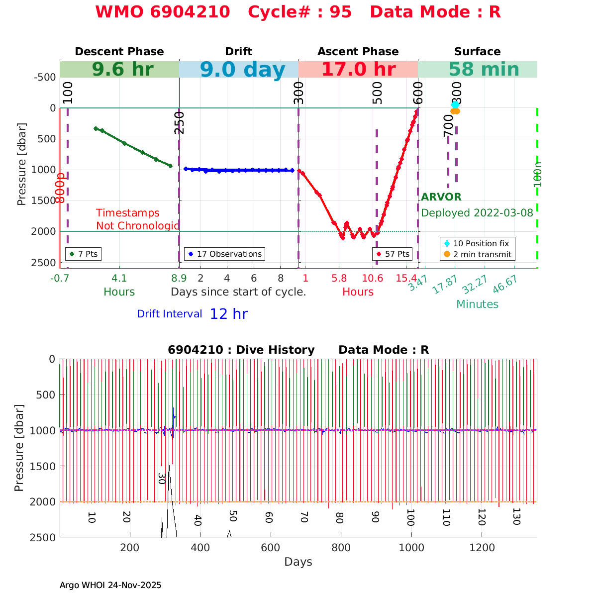| WMO: #6904213 DAC: coriolis PI: Birgit KLEIN ARVOR: # FLOATCLOCK: # DRUCK_2900PSIA: #11962985 SBE41CP: #16553 Altimeter Comparison (IFREMER) EuroArgo Link | ![]() |