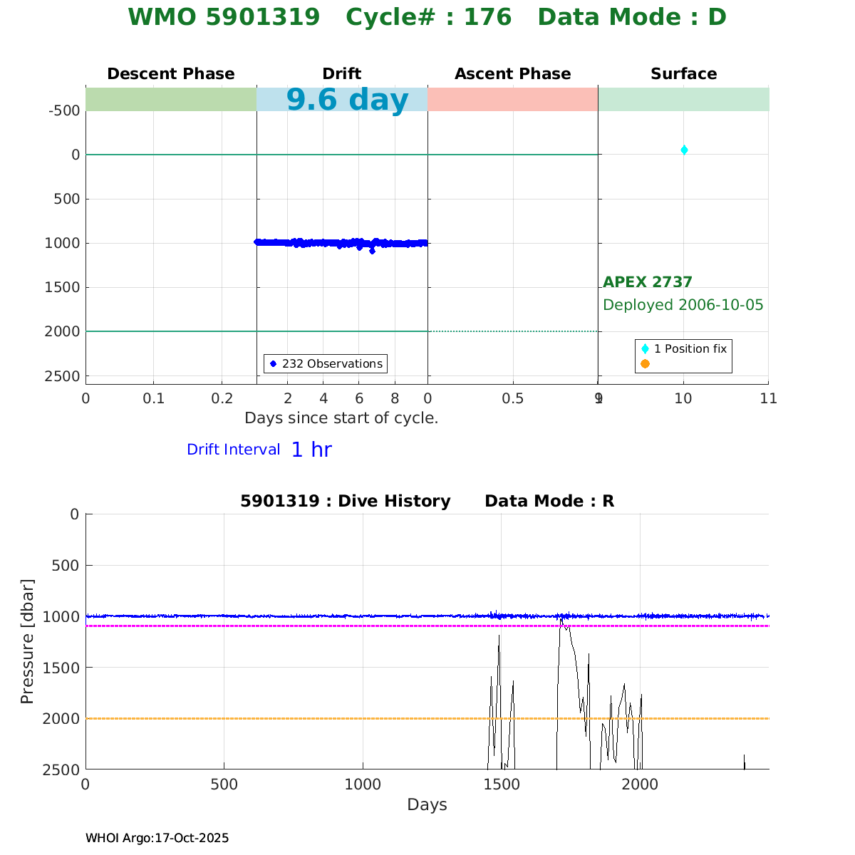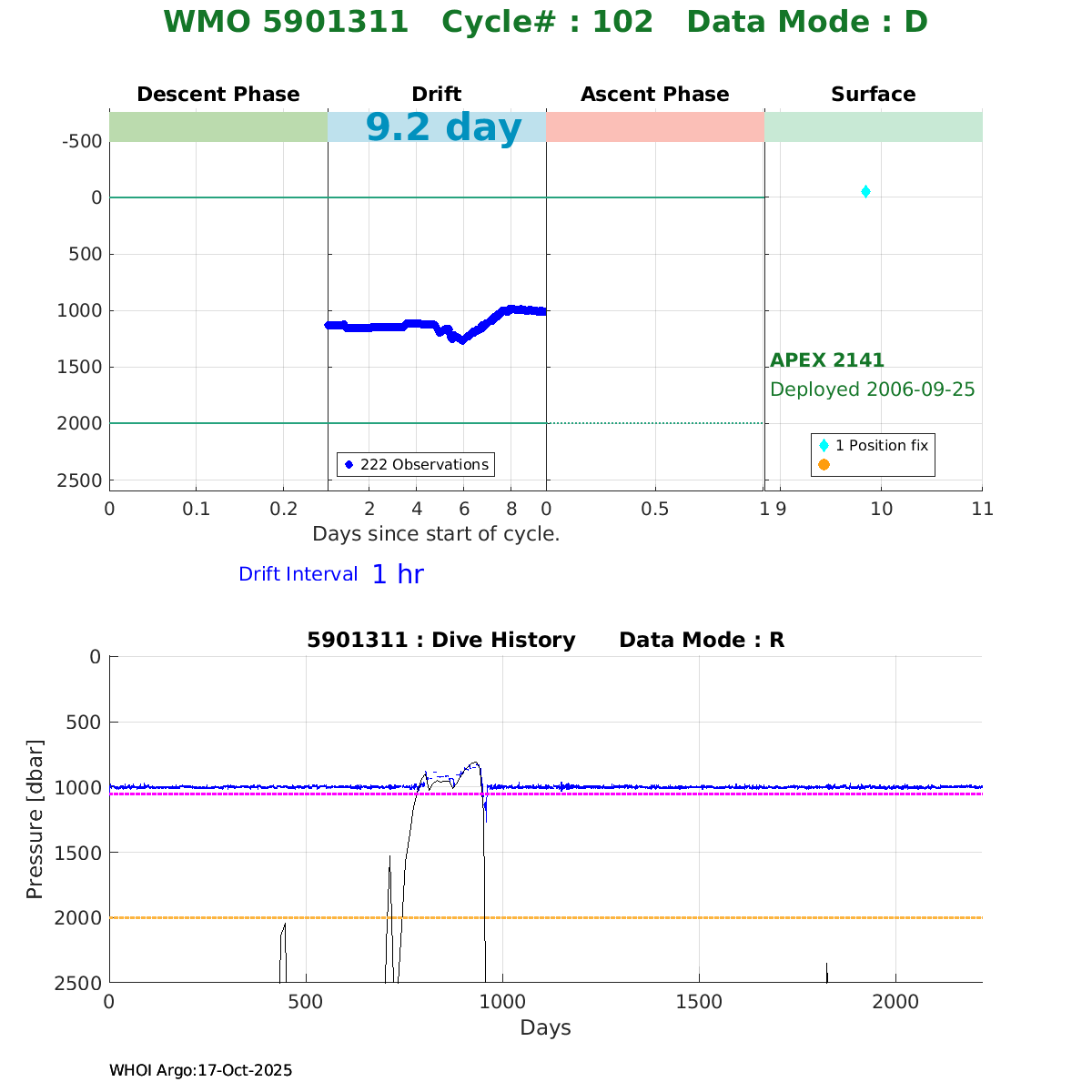 | WMO: #5901100 DAC: aoml PI: STEPHEN RISER APEX: #2586 SBE41: #2628 DRUCK_2900PSIA: #9237 Altimeter Comparison (IFREMER) EuroArgo Link | ![]() |