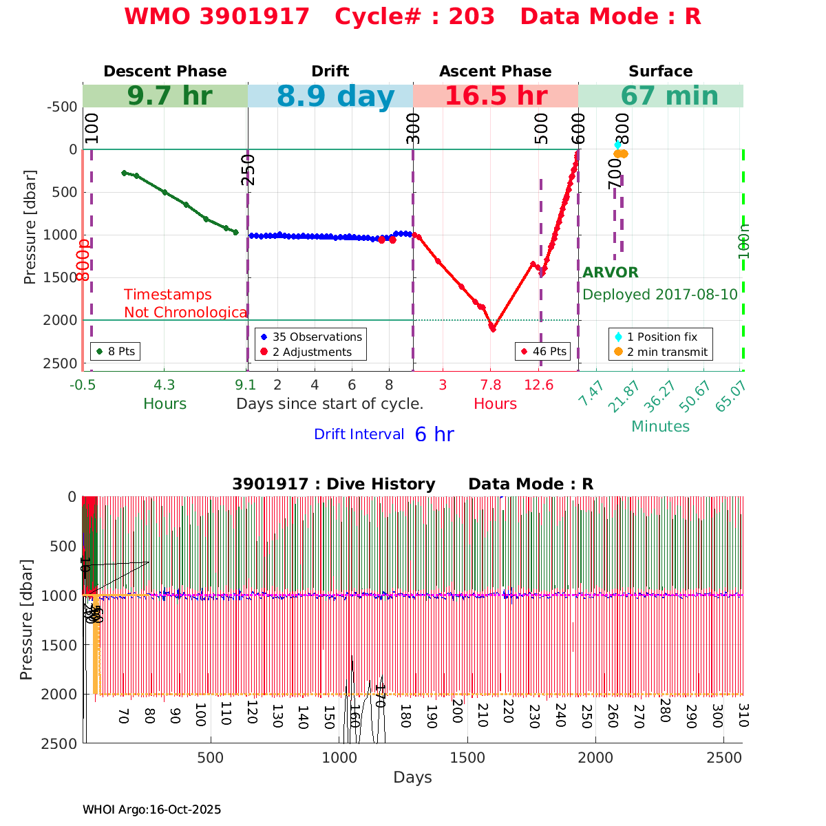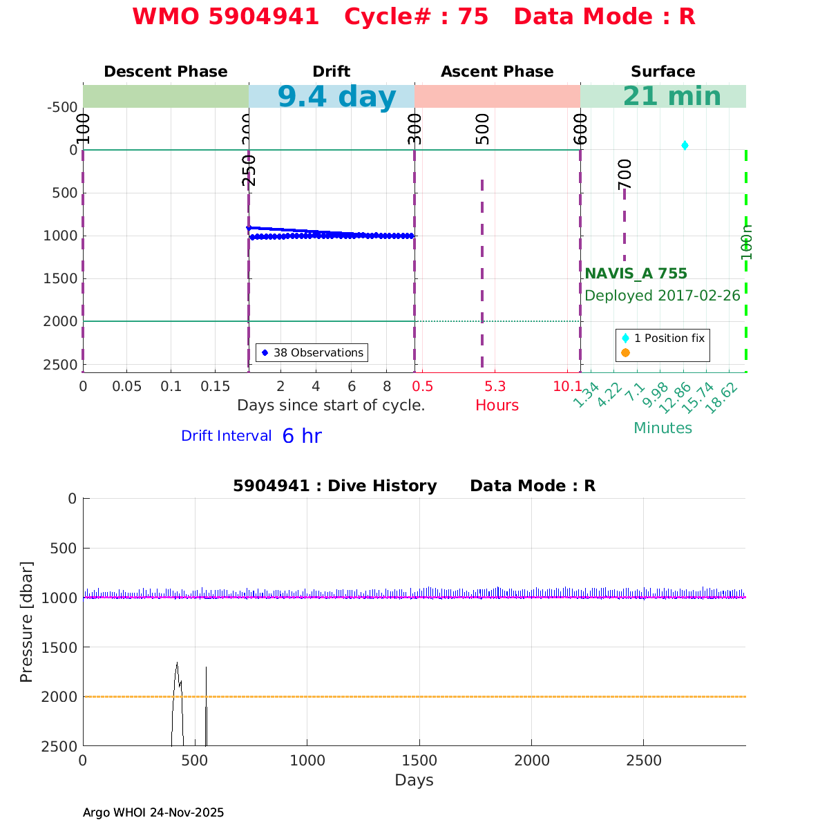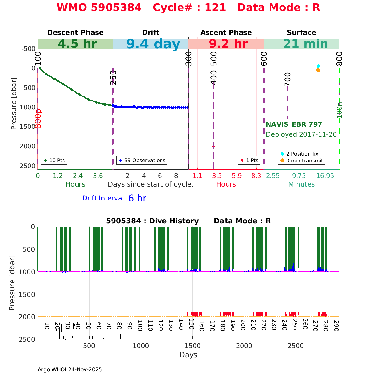 | WMO: #5905069 DAC: aoml PI: STEPHEN RISER, KENNETH JOHNSON APEX: #7760 SBE41CP: #7946 DRUCK_2900PSIA: #10229340 AANDERAA_OPTODE_4330: #1909 ISUS: #0750 DURA: #0750 ECO_FLBB_AP2: #4347 Altimeter Comparison (IFREMER) EuroArgo Link | ![]() |