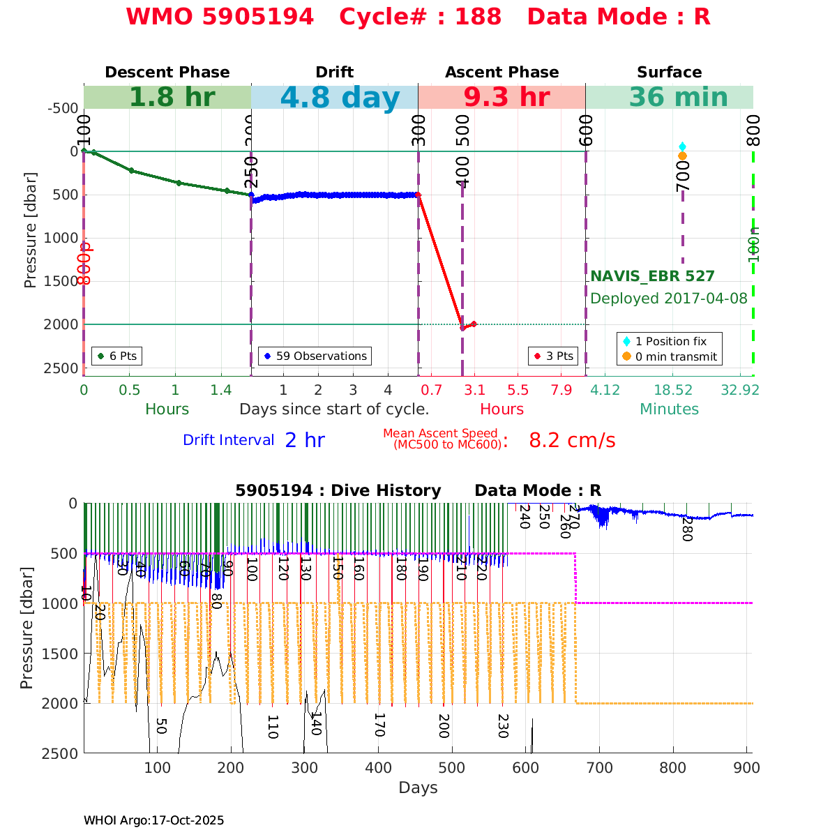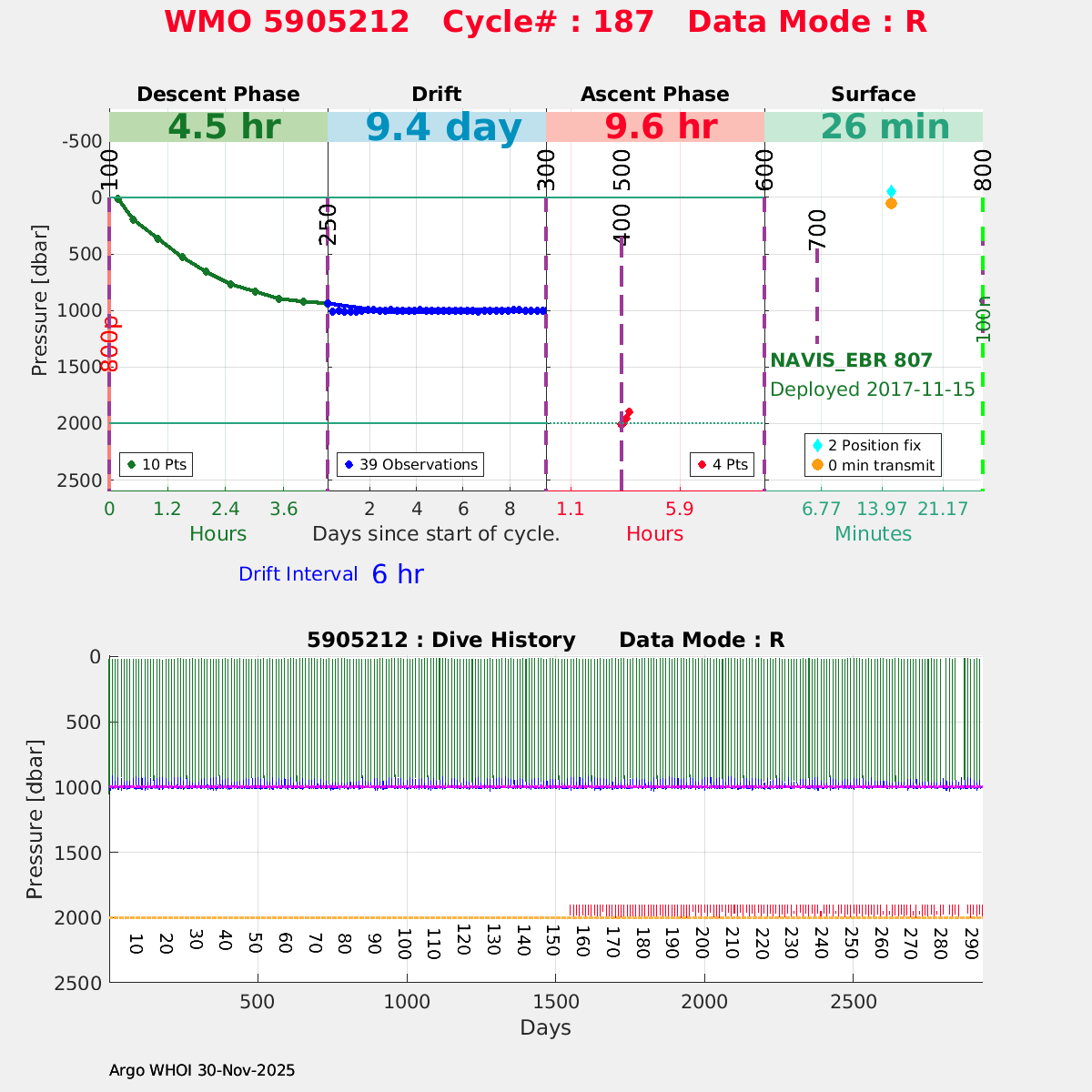 | WMO: #5905212 DAC: csiro PI: Peter OKE NAVIS_EBR: #807 DRUCK: #10461166 SBE41CP: #9283 Altimeter Comparison (IFREMER) EuroArgo Link | ![]() |