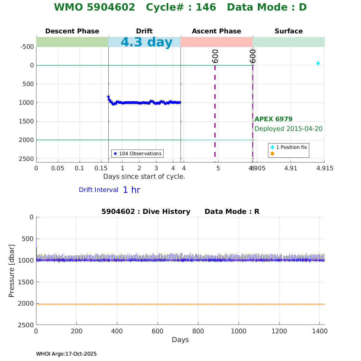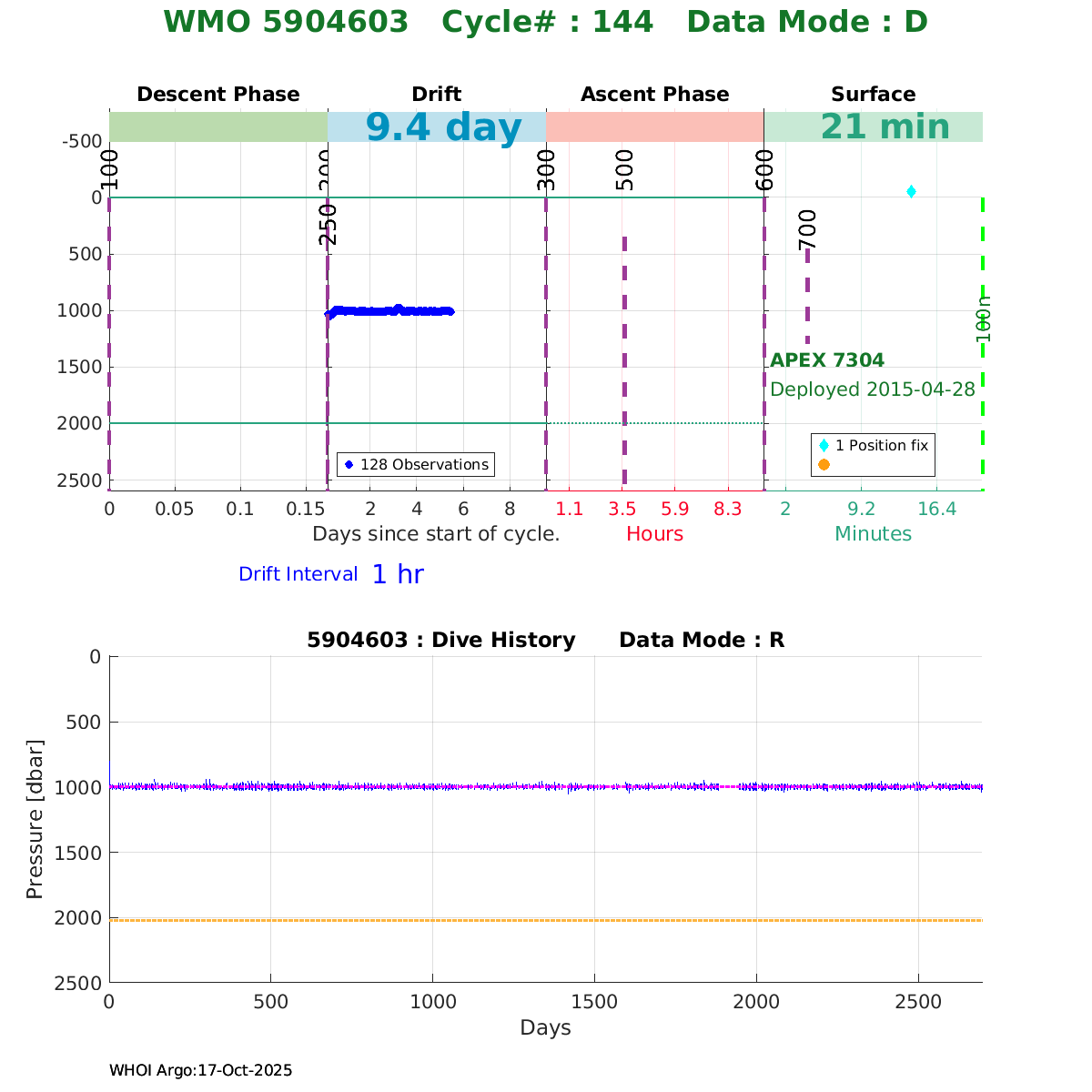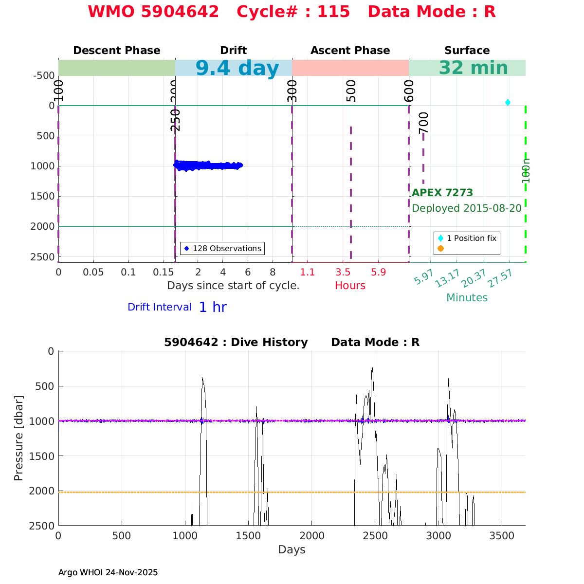 | WMO: #6901666 DAC: coriolis PI: Christophe MAES ARVOR: # FLOATCLOCK: # KISTLER_2900PSIA: #2149188 SBE41CP_V2: #6053 Altimeter Comparison (IFREMER) EuroArgo Link | ![]() |