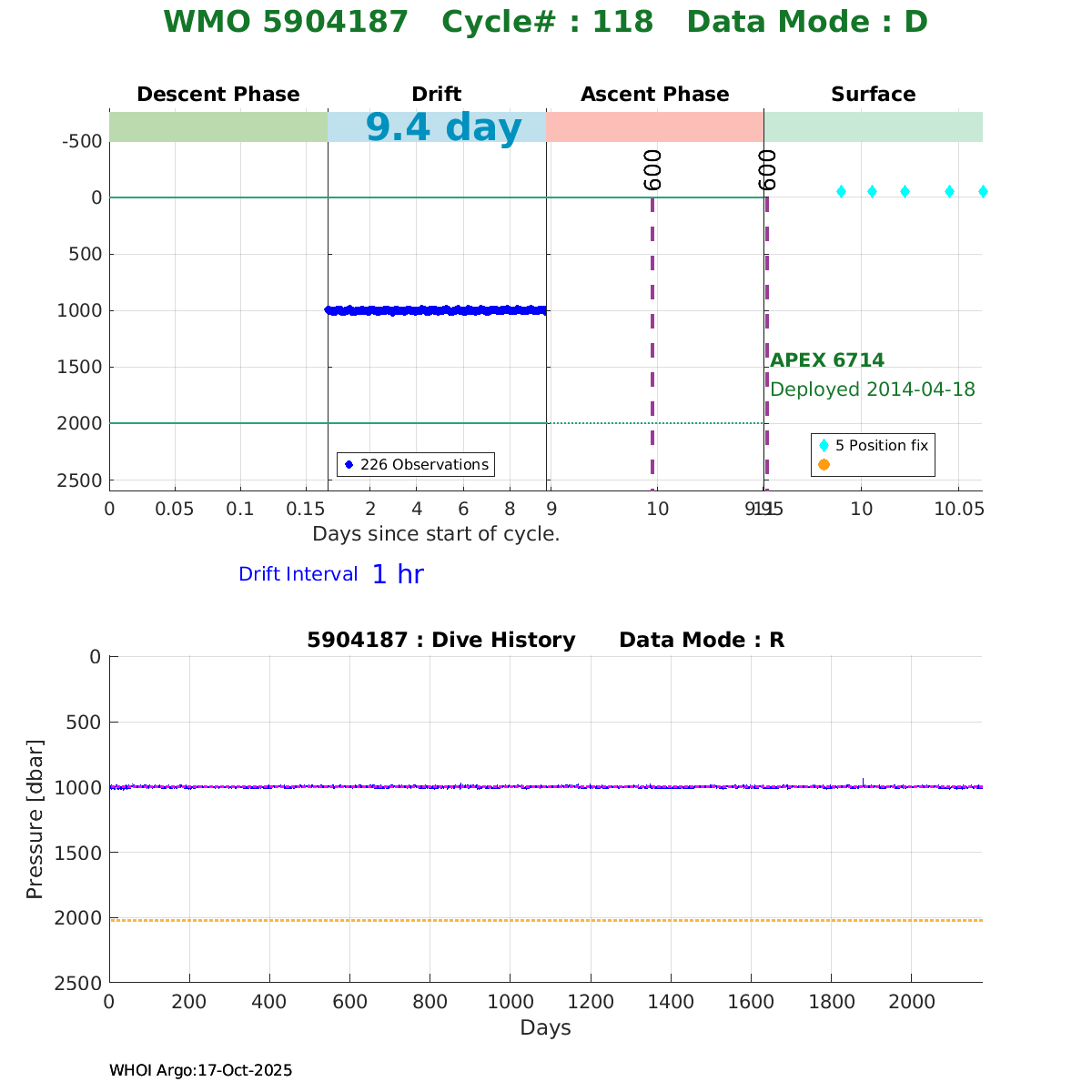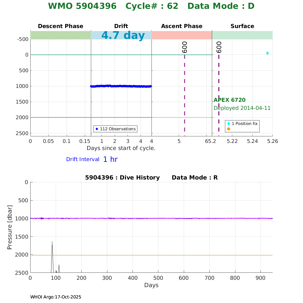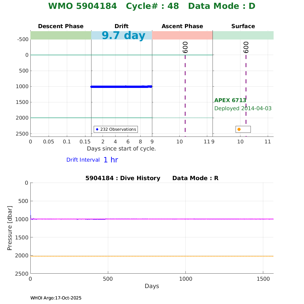 | WMO: #5904184 DAC: aoml PI: STEPHEN RISER, KENNETH JOHNSON APEX: #6713 SBE41CP: #5380 DRUCK_2900PSIA: #3816350 AANDERAA_OPTODE_4330: #1379 ISUS: #0104 DURA: #0104 ECO_FLBB_AP2: #3308 Altimeter Comparison (IFREMER) EuroArgo Link | ![]() |