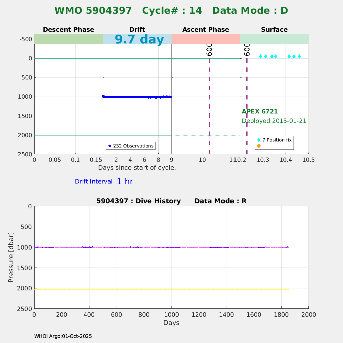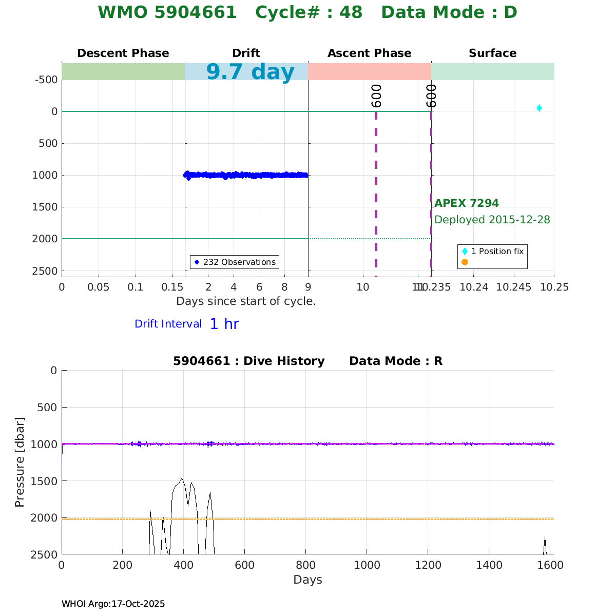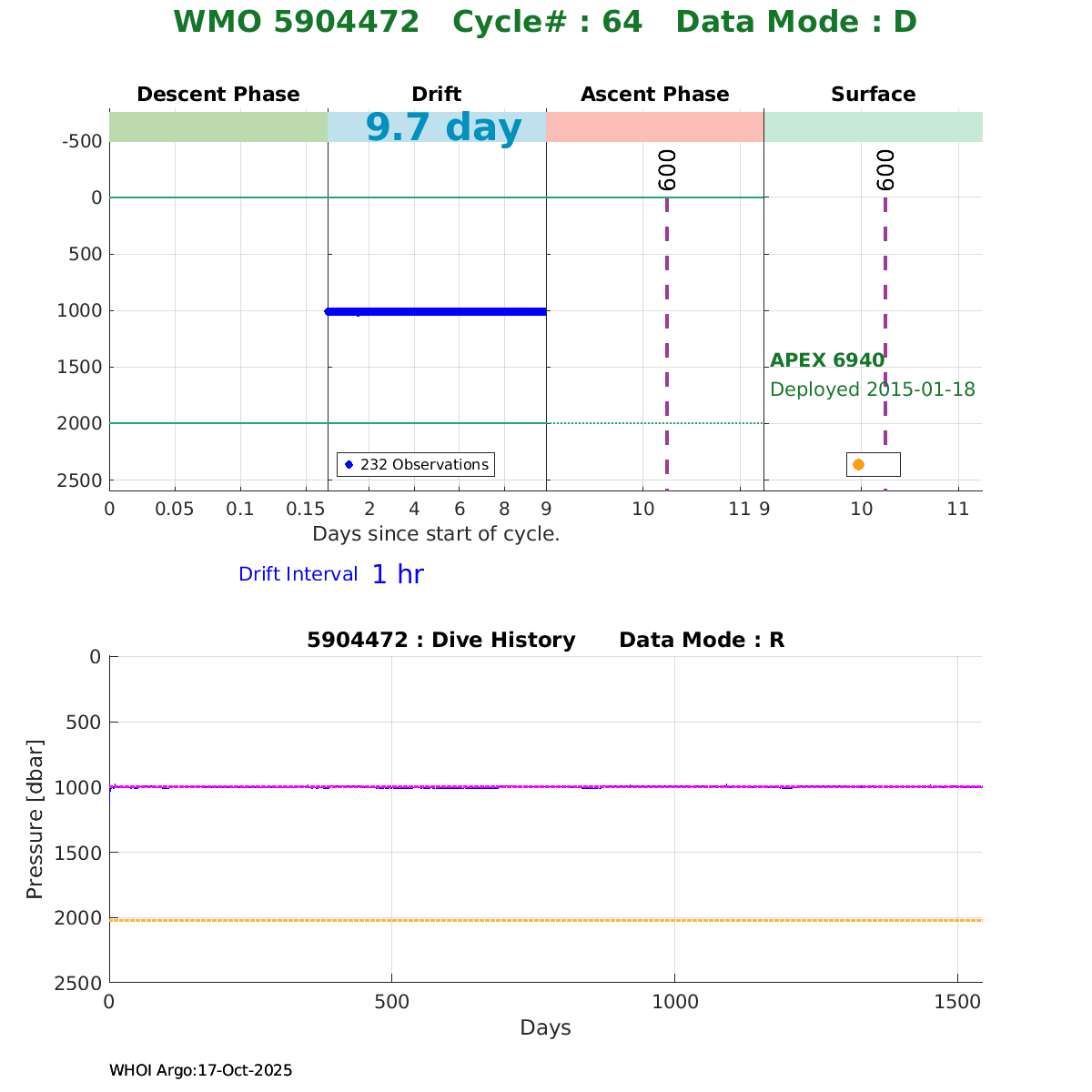 | WMO: #5904468 DAC: aoml PI: STEPHEN RISER, KENNETH JOHNSON APEX: #6716 SBE41CP: #5378 DRUCK_2900PSIA: #3809767 AANDERAA_OPTODE_4330: #1248 ISUS: #0106 DURA: #0106 ECO_FLBB_AP2: #3178 Altimeter Comparison (IFREMER) EuroArgo Link | ![]() |