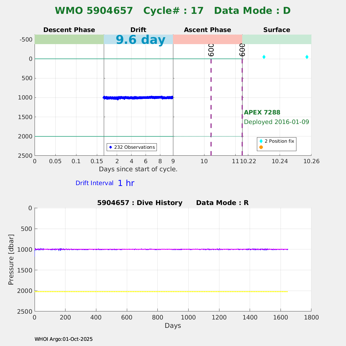 | WMO: #5904657 DAC: aoml PI: STEPHEN RISER, KENNETH JOHNSON APEX: #7288 SBE41CP: #6721 DRUCK_2900PSIA: #4219009 AANDERAA_OPTODE_4330: #1902 ISUS: #0704 DURA: #0704 Altimeter Comparison (IFREMER) EuroArgo Link | ![]() |