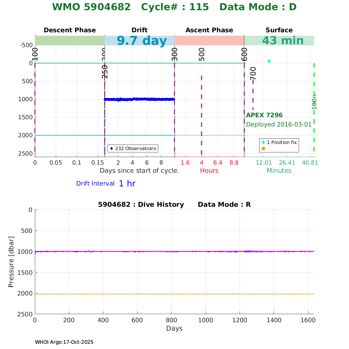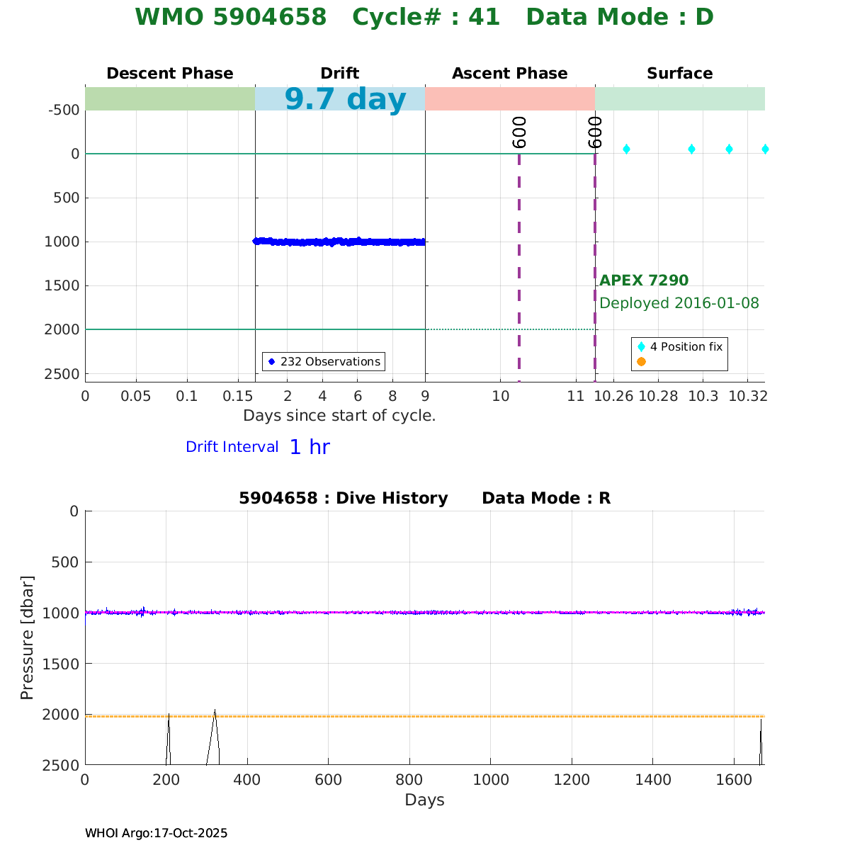 | WMO: #5904860 DAC: aoml PI: STEPHEN RISER, KENNETH JOHNSON APEX: #7766 SBE41CP: #7974 DRUCK_2900PSIA: #10174841 AANDERAA_OPTODE_4330: #2458 ISUS: #0740 DURA: #0740 ECO_FLBB_AP2: #4174 Altimeter Comparison (IFREMER) EuroArgo Link | ![]() |