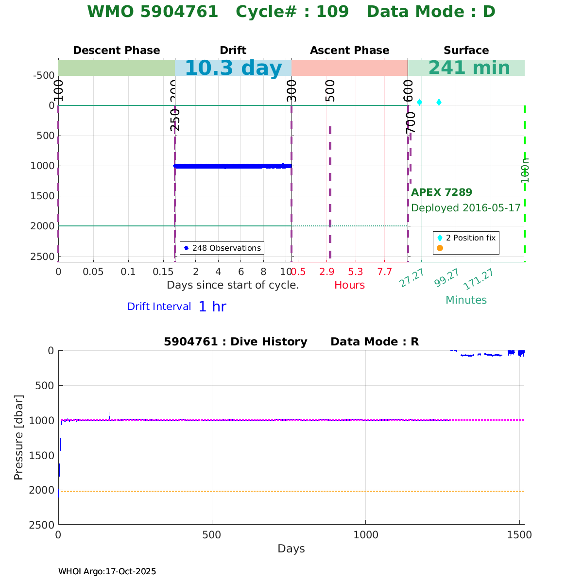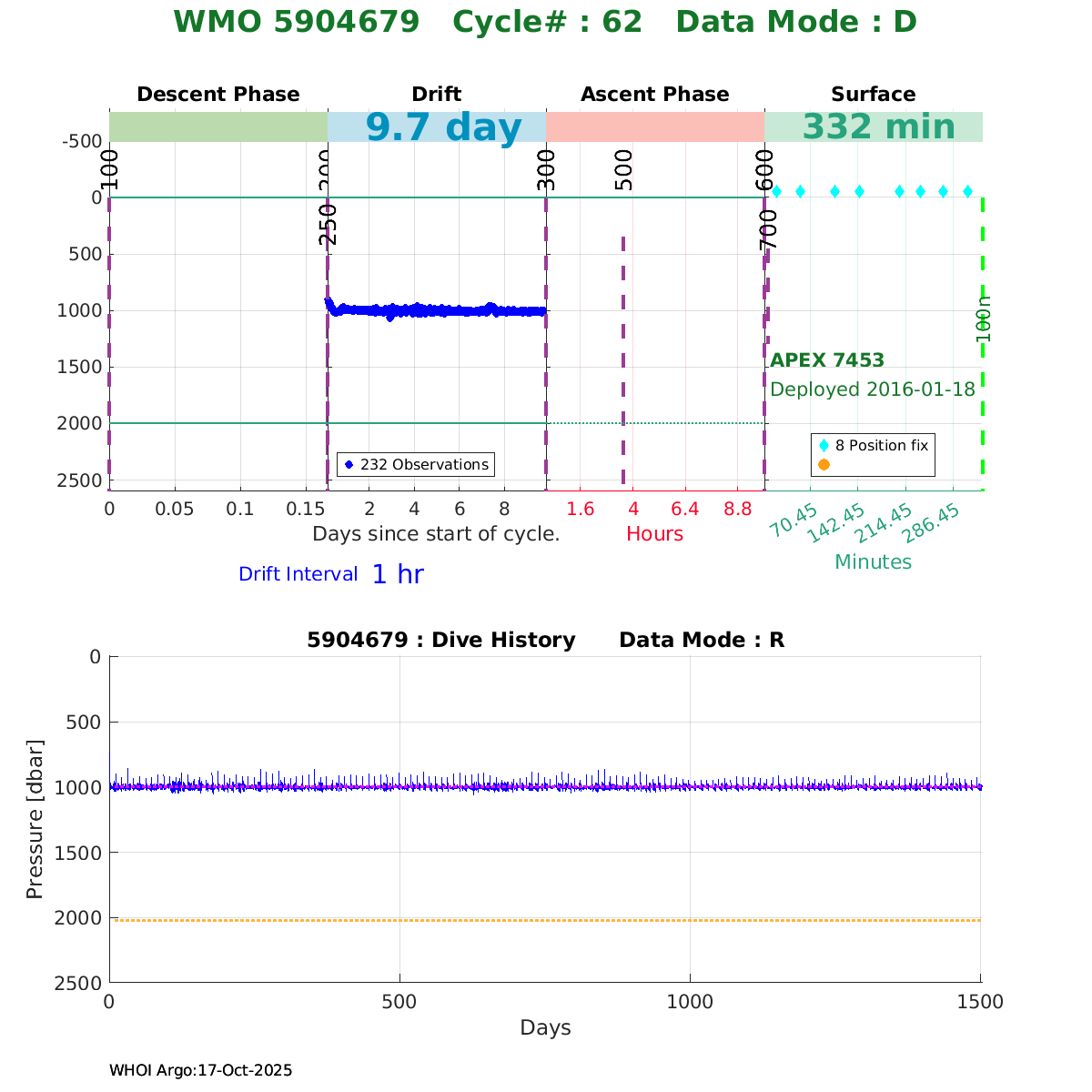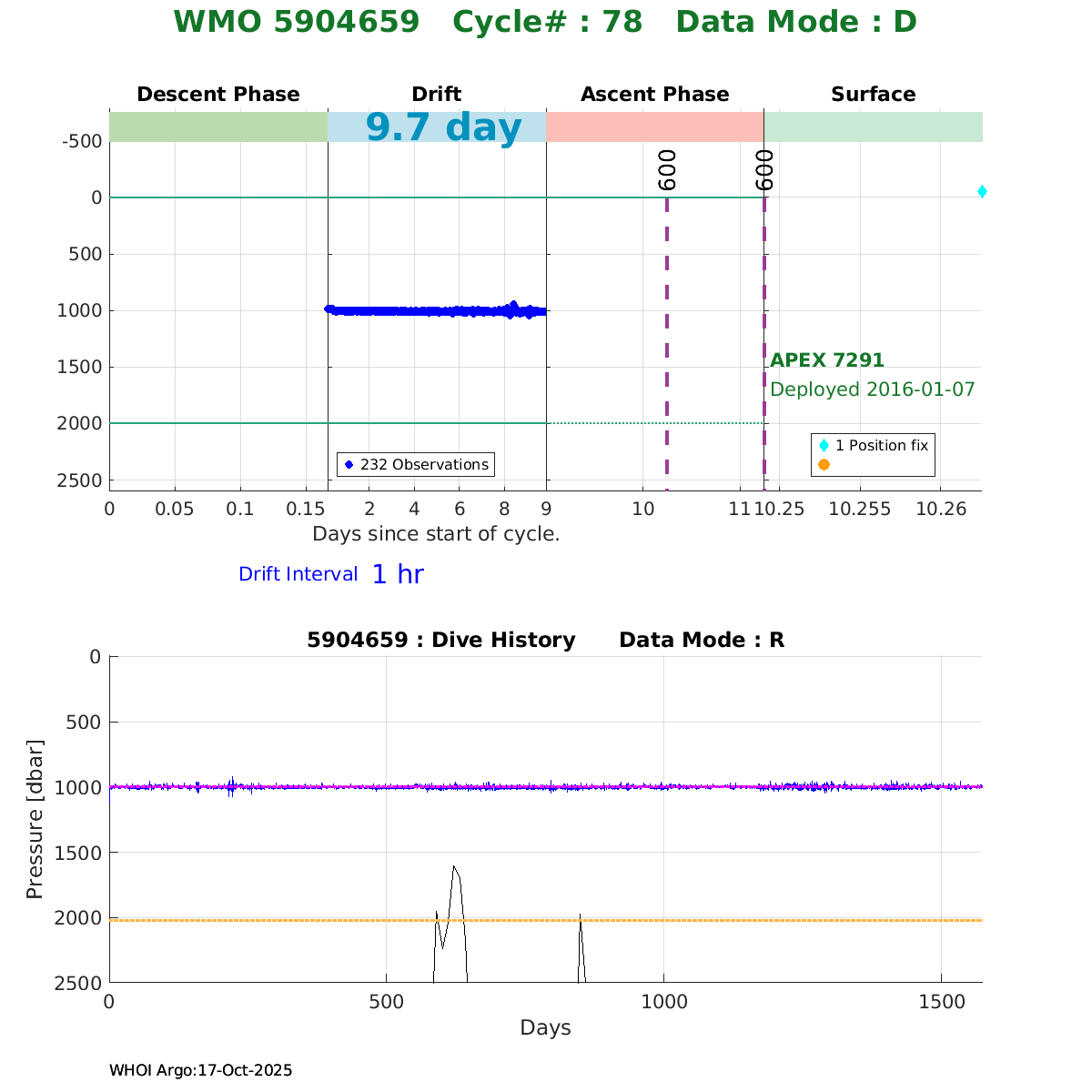 | WMO: #5904660 DAC: aoml PI: STEPHEN RISER, KENNETH JOHNSON APEX: #7295 SBE41CP: #6728 DRUCK_2900PSIA: #4171900 AANDERAA_OPTODE_4330: #1913 ISUS: #0705 DURA: #0705 ECO_FLBB_AP2: #3803 Altimeter Comparison (IFREMER) EuroArgo Link | ![]() |
