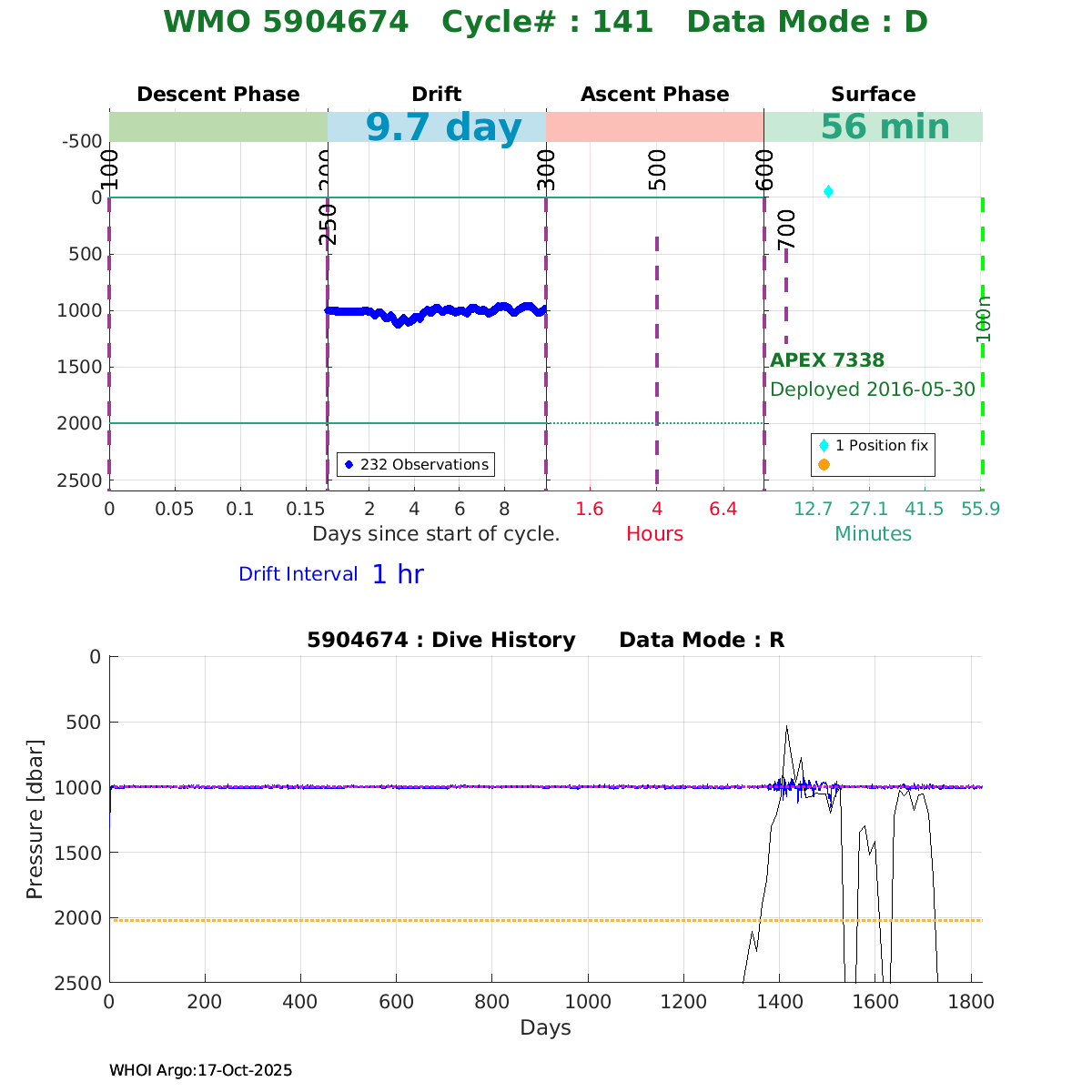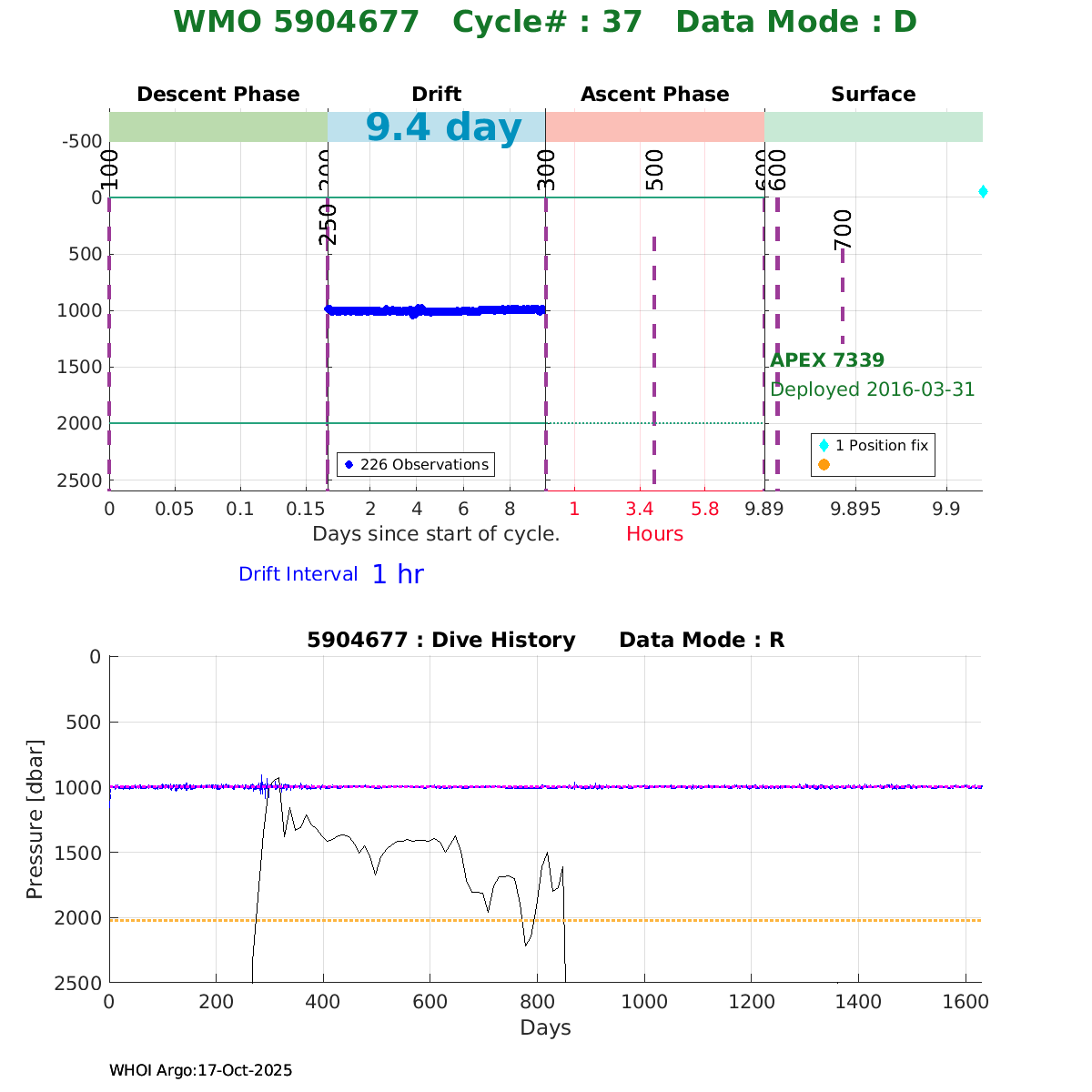 | WMO: #5904676 DAC: aoml PI: STEPHEN RISER, KENNETH JOHNSON APEX: #7335 SBE41CP: #6735 DRUCK_2900PSIA: #4268764 AANDERAA_OPTODE_4330: #1915 ISUS: #0722 DURA: #0722 ECO_FLBB_AP2: #3688 Altimeter Comparison (IFREMER) EuroArgo Link | ![]() |
