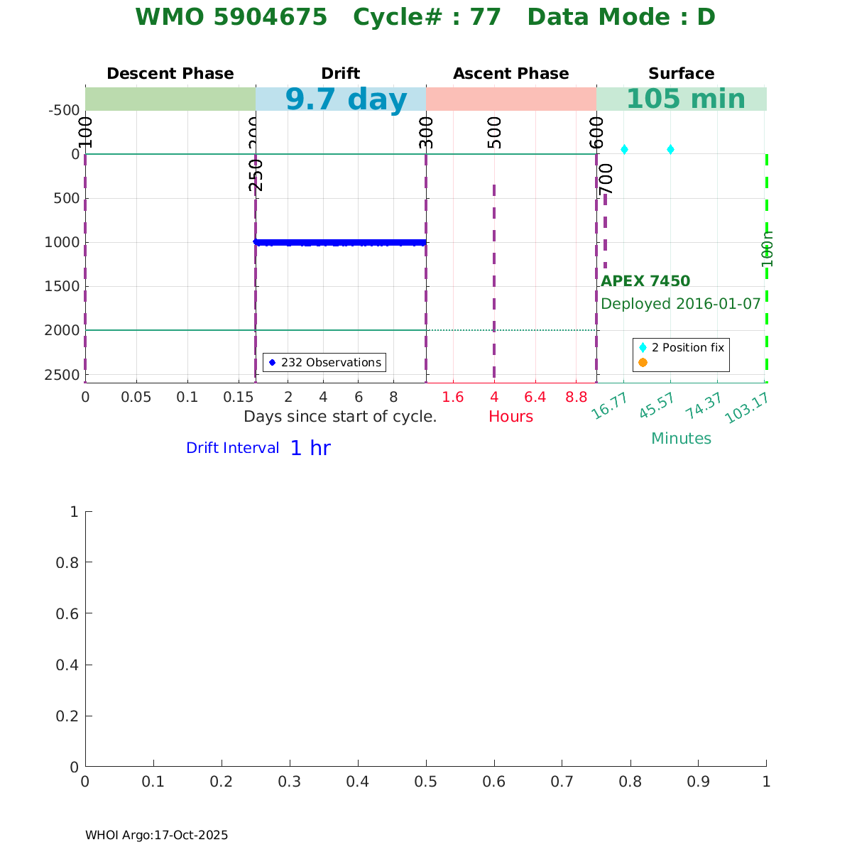 | WMO: #5904764 DAC: aoml PI: STEPHEN RISER, KENNETH JOHNSON APEX: #7455 SBE41CP: #7182 DRUCK_2900PSIA: #4200908 AANDERAA_OPTODE_4330: #2165 ISUS: #0731 DURA: #0731 ECO_FLBB_AP2: #3802 Altimeter Comparison (IFREMER) EuroArgo Link | n/a | n/a | ![]() |