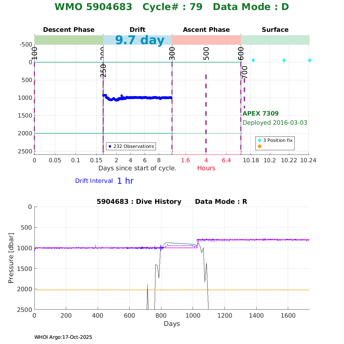 | WMO: #5904684 DAC: aoml PI: STEPHEN RISER, KENNETH JOHNSON APEX: #7333 SBE41CP: #6733 DRUCK_2900PSIA: #4196074 AANDERAA_OPTODE_4330: #1907 ISUS: #0727 DURA: #0727 ECO_FLBB_AP2: #3655 Altimeter Comparison (IFREMER) EuroArgo Link | ![]() |
