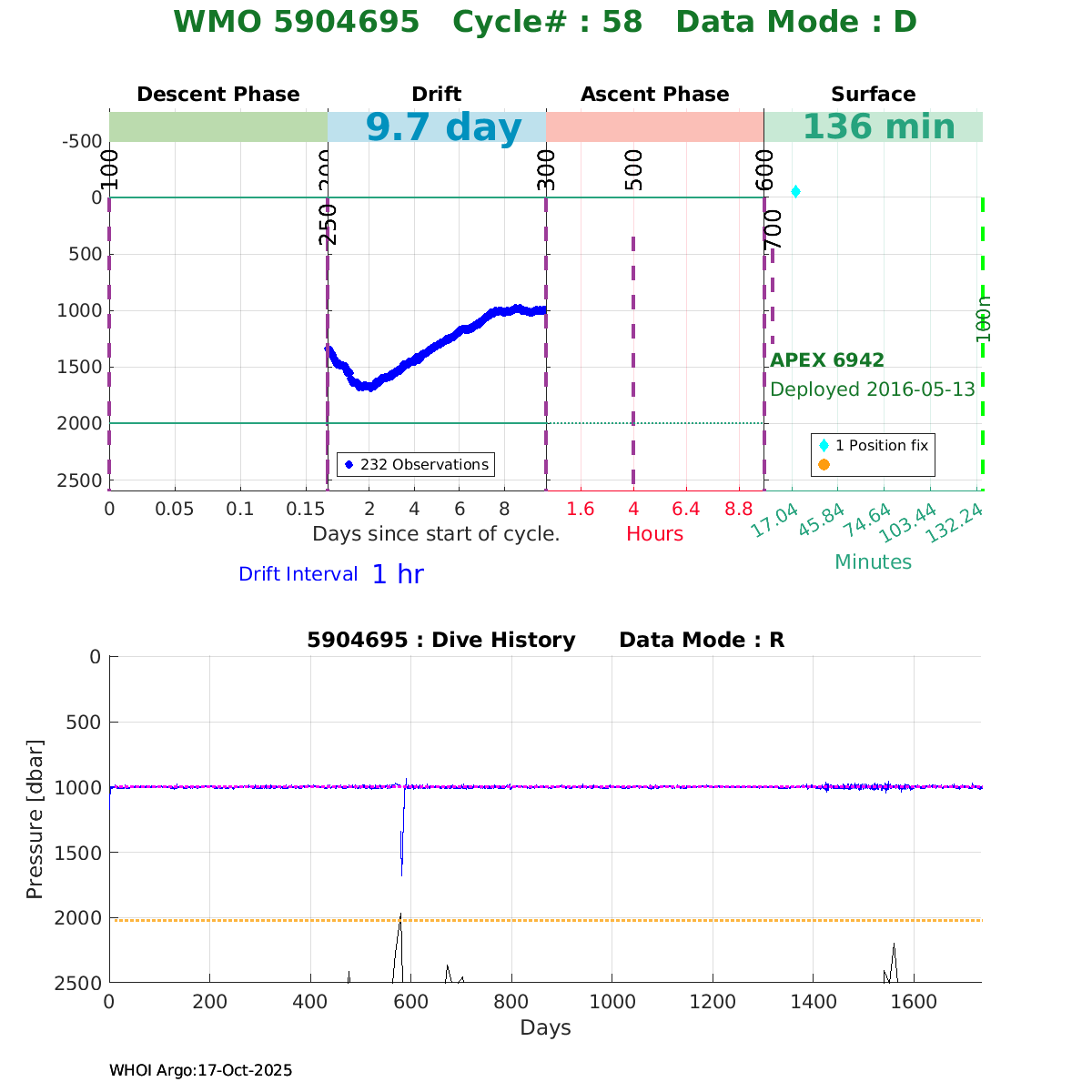 | WMO: #5904763 DAC: aoml PI: STEPHEN RISER, KENNETH JOHNSON APEX: #7340 SBE41CP: #6740 DRUCK_2900PSIA: #4268761 AANDERAA_OPTODE_4330: #1905 ISUS: #0714 DURA: #0714 ECO_FLBB_AP2: #3682 Altimeter Comparison (IFREMER) EuroArgo Link | ![]() |