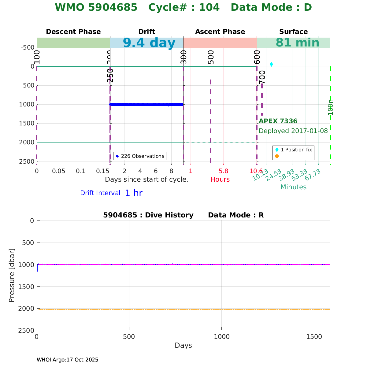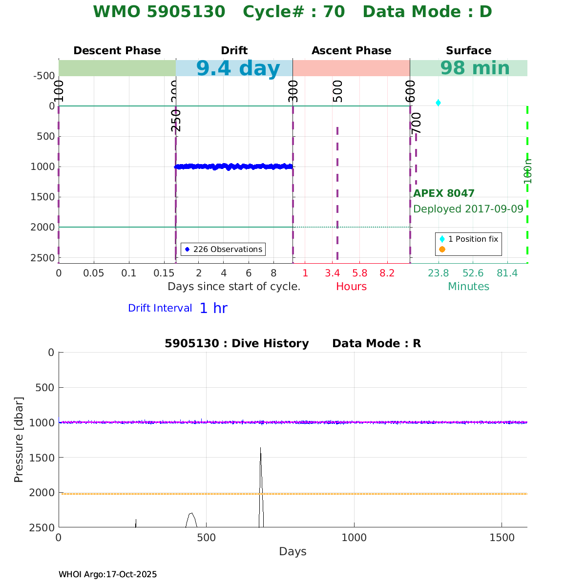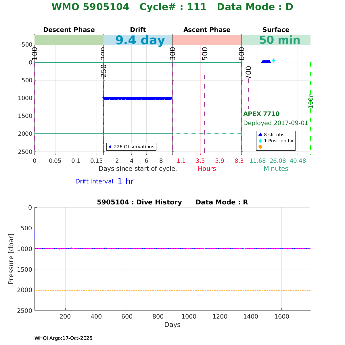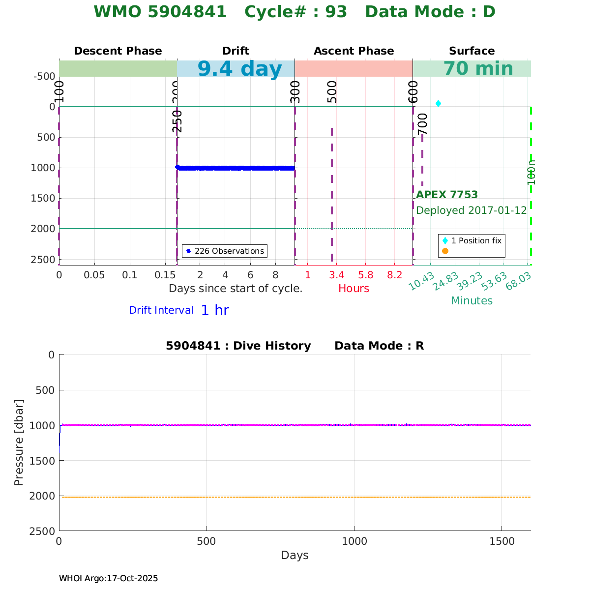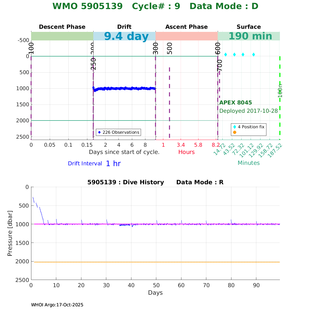 | WMO: #5905080 DAC: aoml PI: STEPHEN RISER, KENNETH JOHNSON APEX: #7703 SBE41CP: #8066 DRUCK_2900PSIA: #10225816 AANDERAA_OPTODE_4330: #1875 ISUS: #0755 DURA: #0755 ECO_FLBB_AP2: #4353 Altimeter Comparison (IFREMER) EuroArgo Link | ![]() |