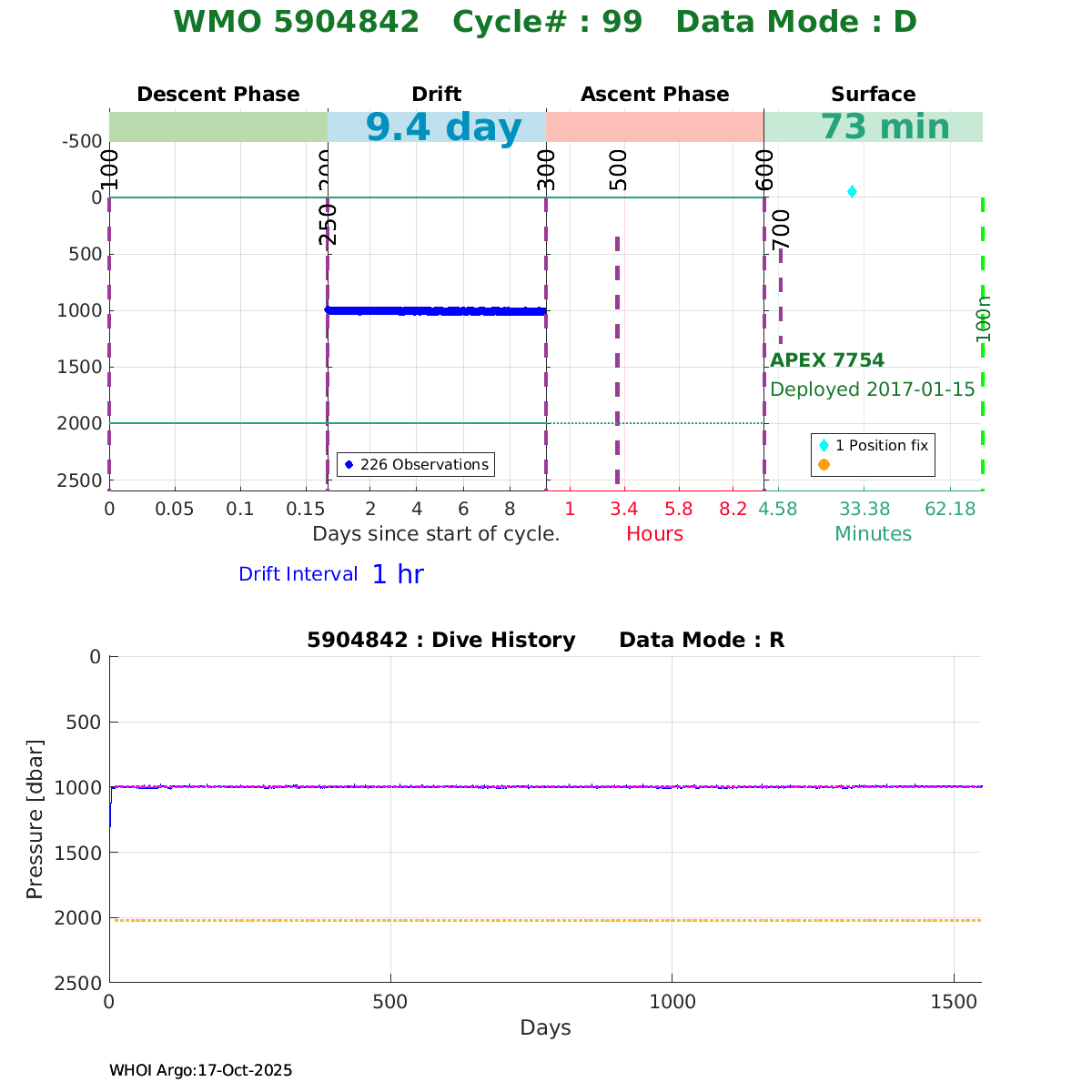 | WMO: #5904843 DAC: aoml PI: STEPHEN RISER, KENNETH JOHNSON APEX: #7332 SBE41CP: #6732 DRUCK_2900PSIA: #4268763 AANDERAA_OPTODE_4330: #1910 ISUS: #0726 DURA: #0726 ECO_FLBB_AP2: #3805 Altimeter Comparison (IFREMER) EuroArgo Link | ![]() |