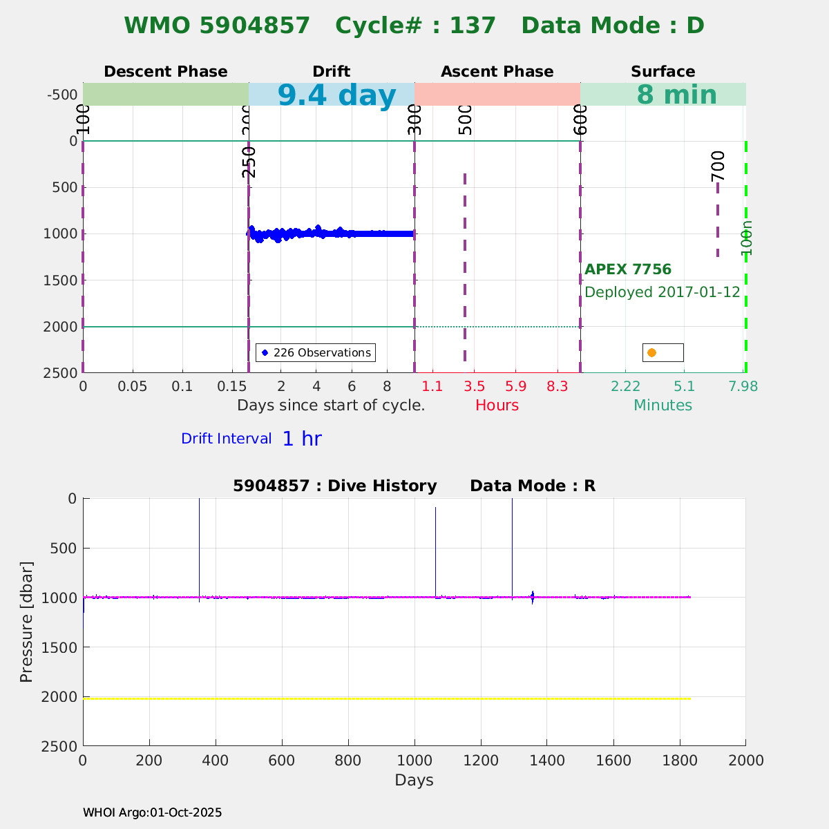 | WMO: #5905105 DAC: aoml PI: STEPHEN RISER, KENNETH JOHNSON APEX: #7755 SBE41CP: #7982 DRUCK_2900PSIA: #10225800 AANDERAA_OPTODE_4330: #2222 ISUS: #0746 DURA: #0746 ECO_FLBB_AP2: #4268 Altimeter Comparison (IFREMER) EuroArgo Link | ![]() |
