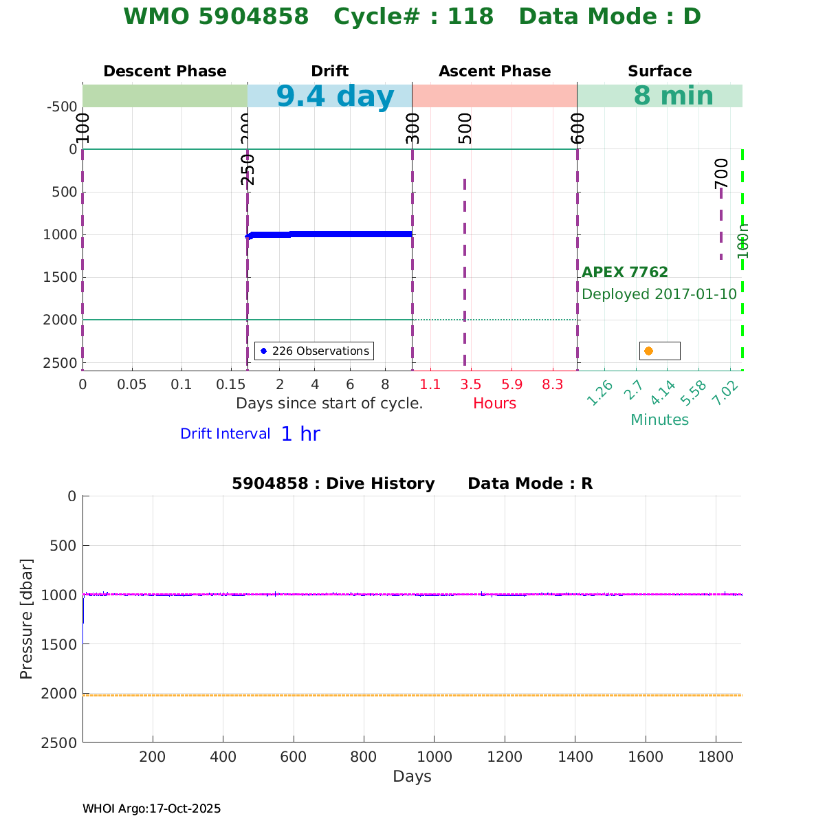 | WMO: #5904859 DAC: aoml PI: STEPHEN RISER, KENNETH JOHNSON APEX: #7764 SBE41CP: #8062 DRUCK_2900PSIA: #10225812 AANDERAA_OPTODE_4330: #2456 ISUS: #0749 DURA: #0749 ECO_FLBB_AP2: #4172 Altimeter Comparison (IFREMER) EuroArgo Link | ![]() |