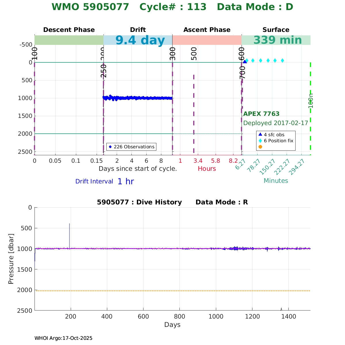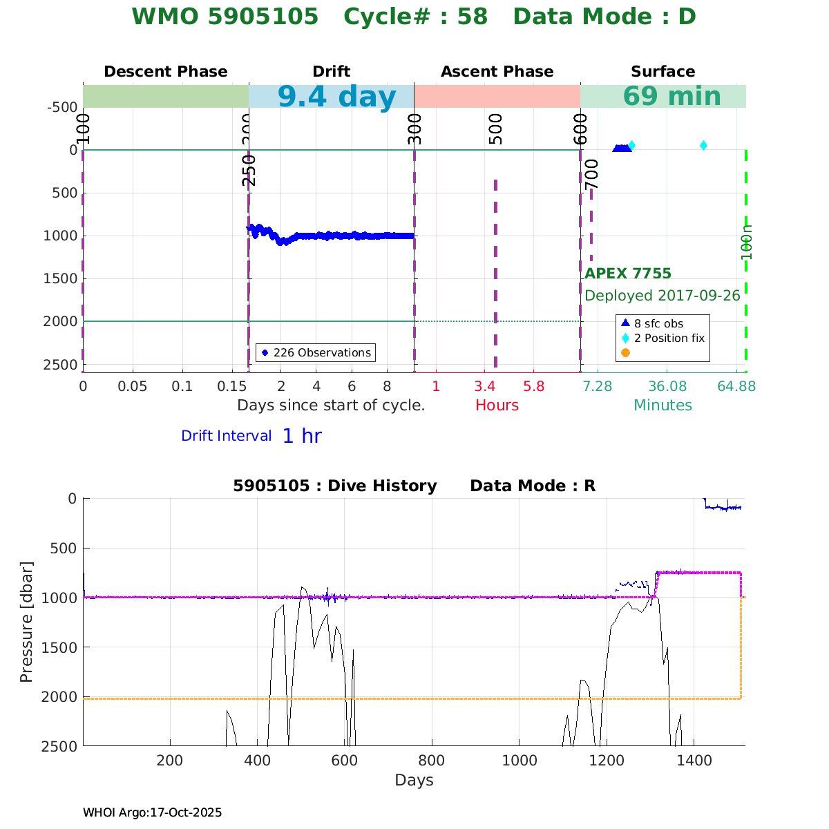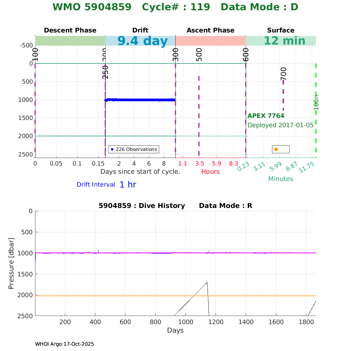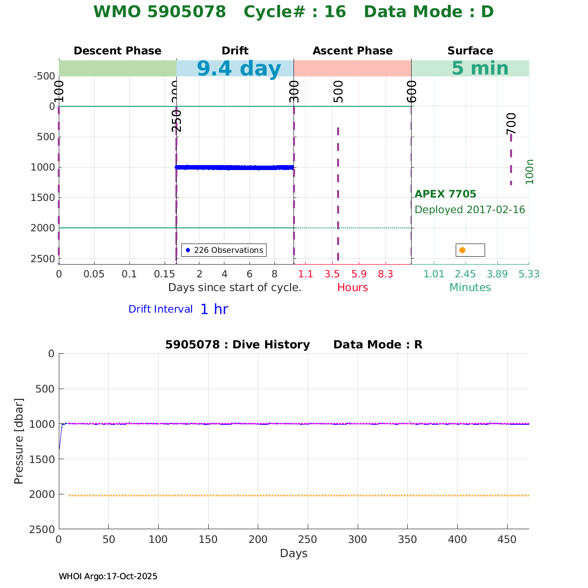 | WMO: #5905077 DAC: aoml PI: STEPHEN RISER, KENNETH JOHNSON APEX: #7763 SBE41CP: #7949 DRUCK_2900PSIA: #10174249 AANDERAA_OPTODE_4330: #2455 ISUS: #0747 DURA: #0747 ECO_FLBB_AP2: #4219 Altimeter Comparison (IFREMER) EuroArgo Link | ![]() |