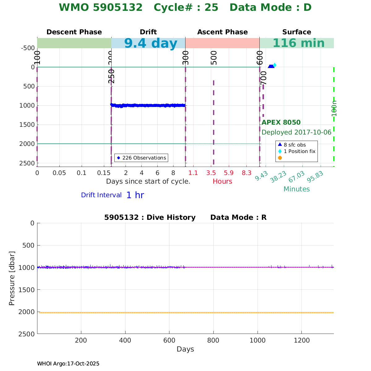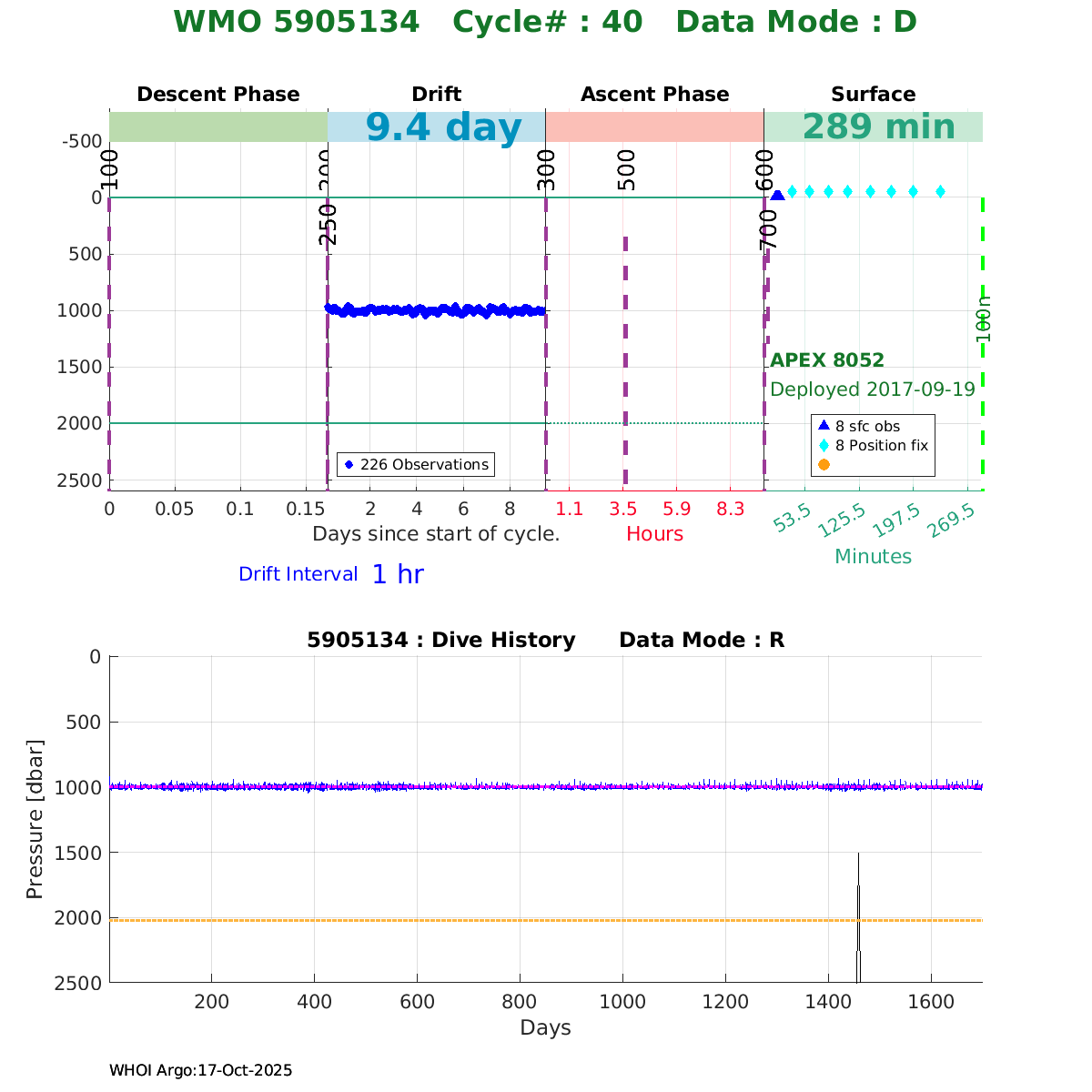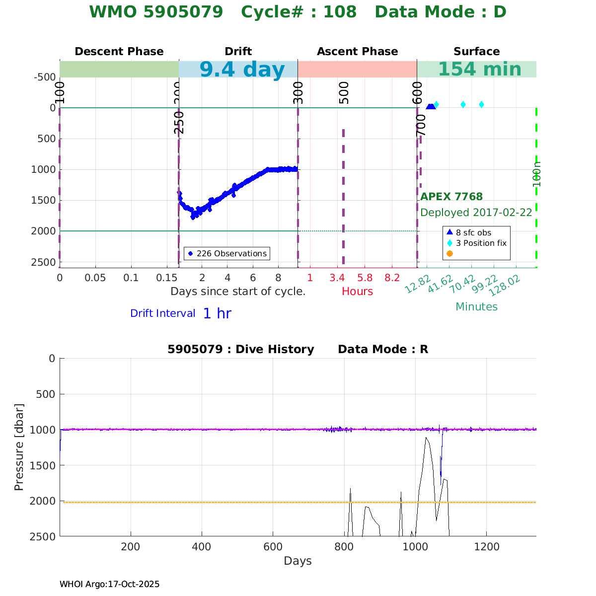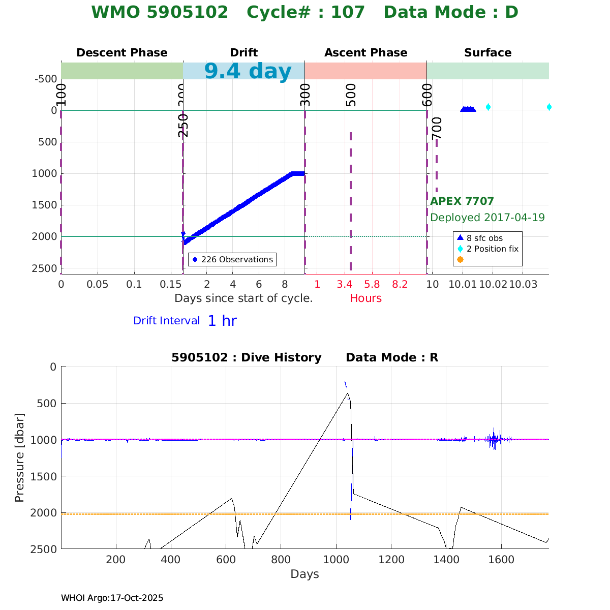 | WMO: #5905077 DAC: aoml PI: STEPHEN RISER, KENNETH JOHNSON APEX: #7763 SBE41CP: #7949 DRUCK_2900PSIA: #10174249 AANDERAA_OPTODE_4330: #2455 ISUS: #0747 DURA: #0747 ECO_FLBB_AP2: #4219 Altimeter Comparison (IFREMER) EuroArgo Link | ![]() |
