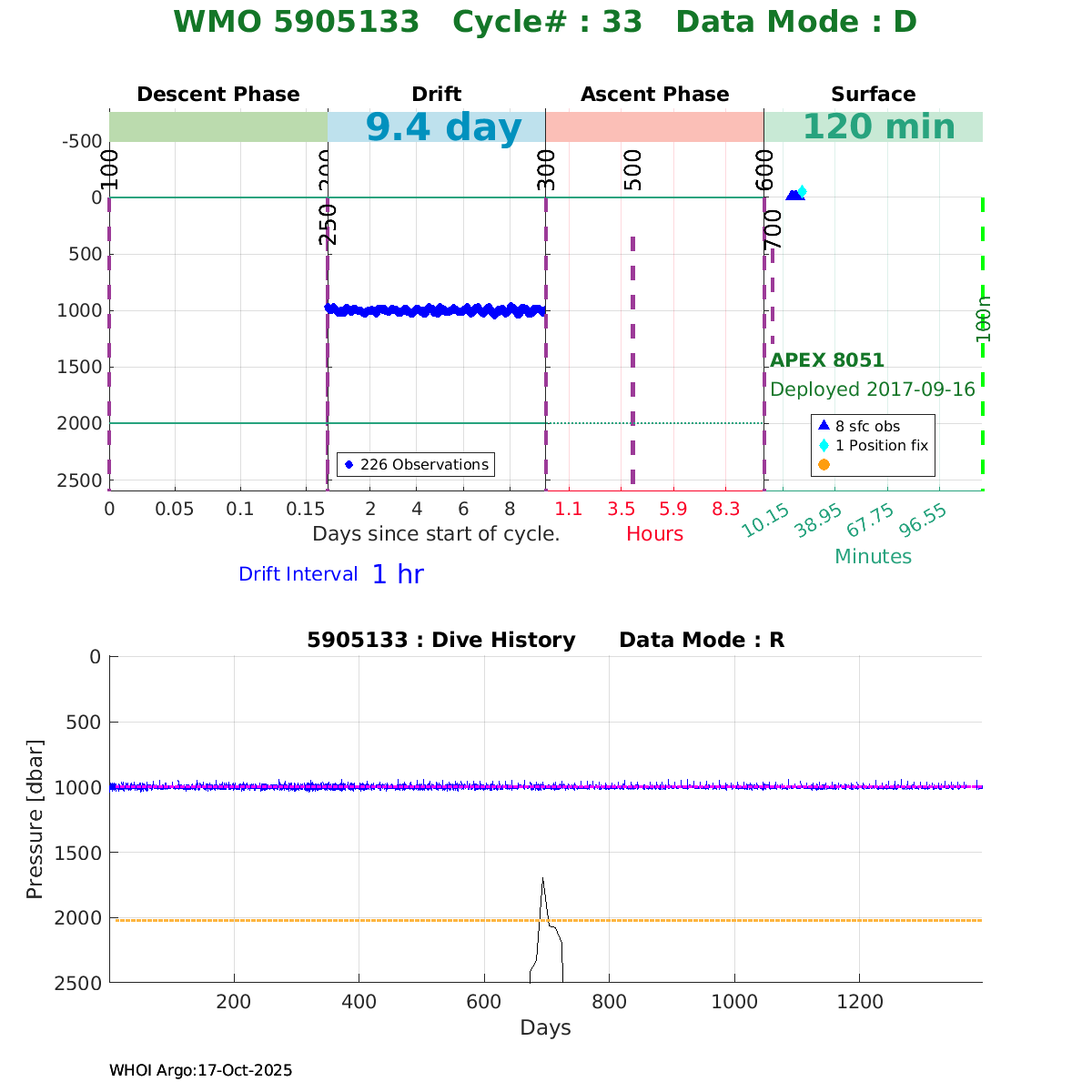 | WMO: #5905133 DAC: aoml PI: STEPHEN RISER, KENNETH JOHNSON APEX: #8051 SBE41CP: #9269 DRUCK_2900PSIA: #10466487 AANDERAA_OPTODE_4330: #2727 ISUS: #0781 DURA: #0781 ECO_FLBB_AP2: #4433 Altimeter Comparison (IFREMER) EuroArgo Link | ![]() |