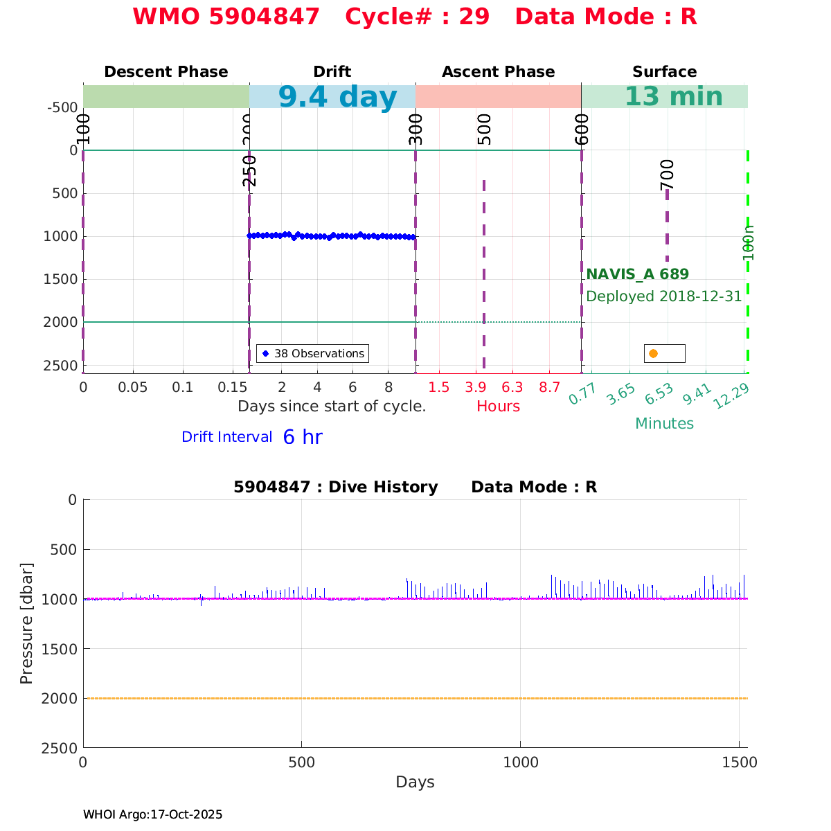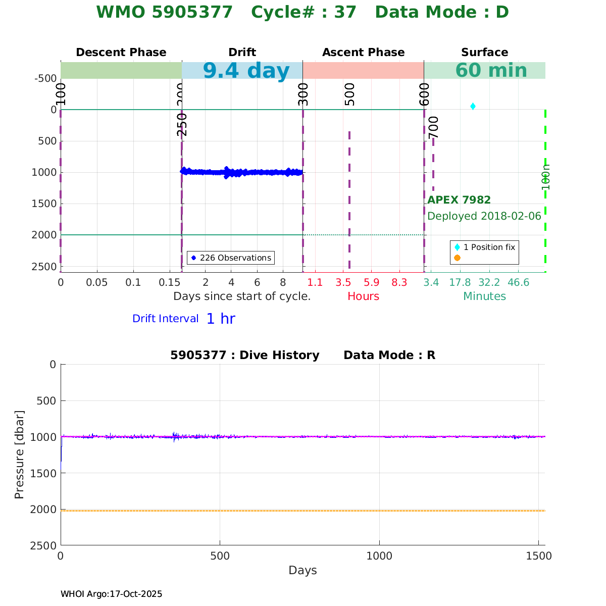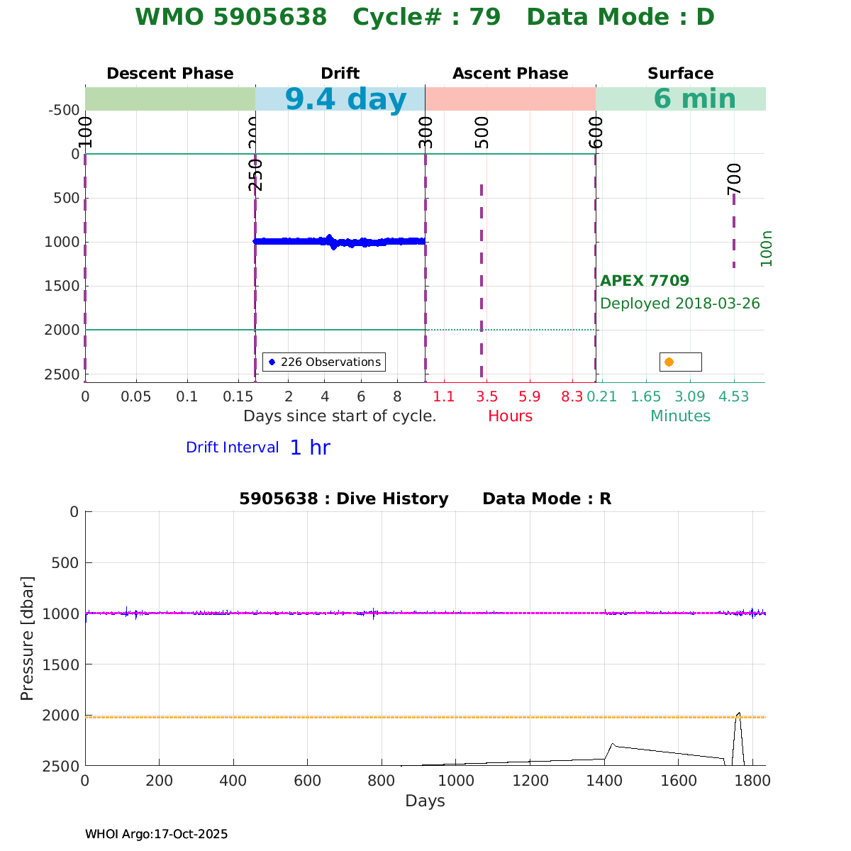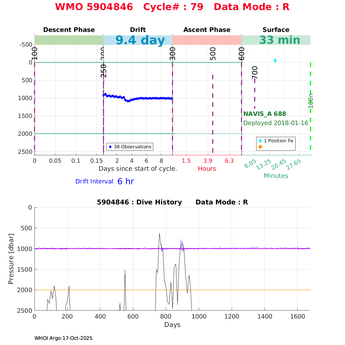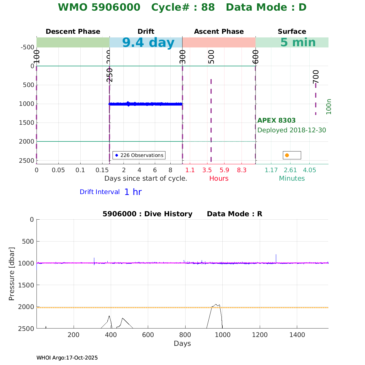 | WMO: #5906001 DAC: aoml PI: STEPHEN RISER, KENNETH JOHNSON APEX: #8359 SBE41CP: #10450 DRUCK_2900PSIA: #10820445 AANDERAA_OPTODE_4330: #2861 ISUS: #0810 DURA: #0810 ECO_FLBB_AP2: #4685 Altimeter Comparison (IFREMER) EuroArgo Link | ![]() |