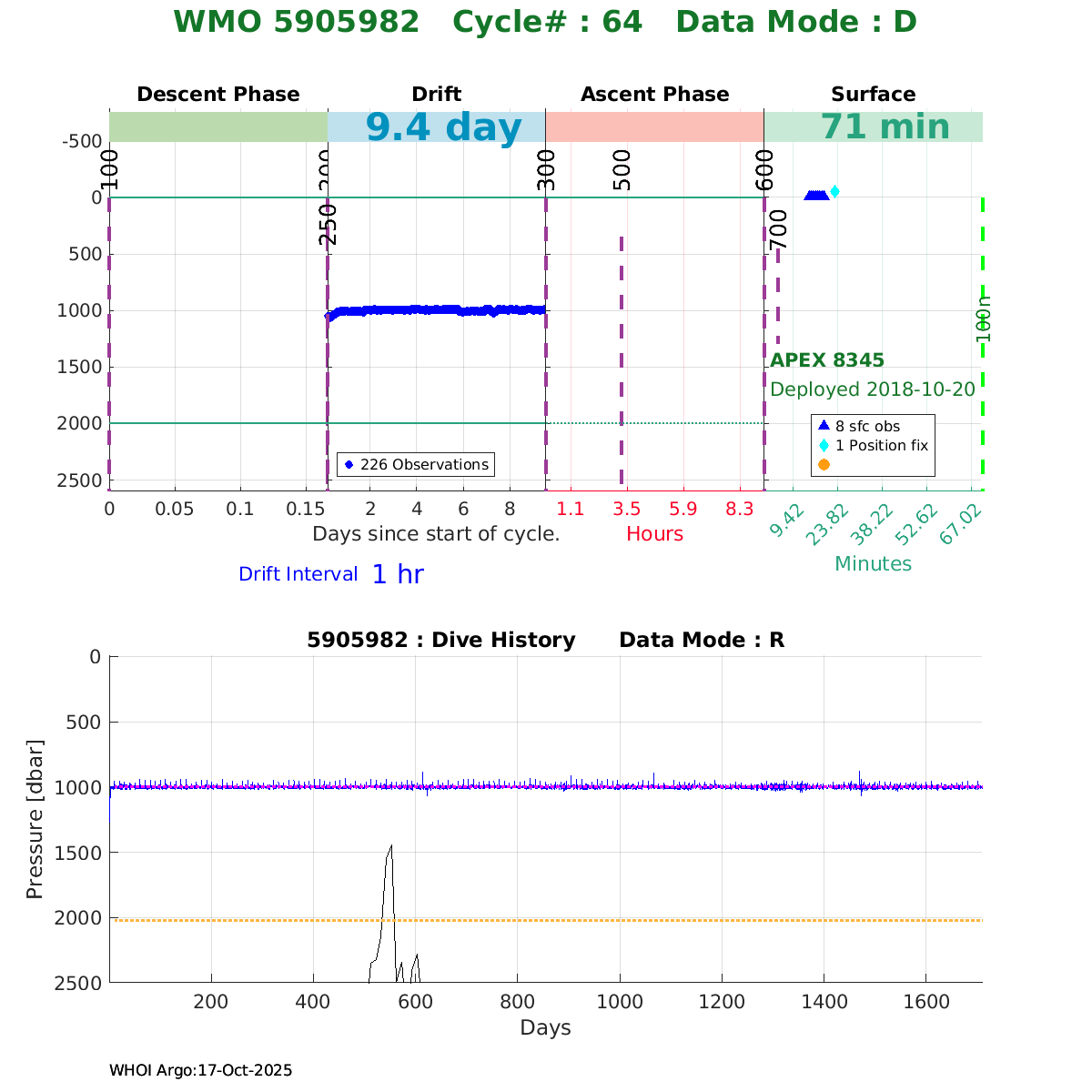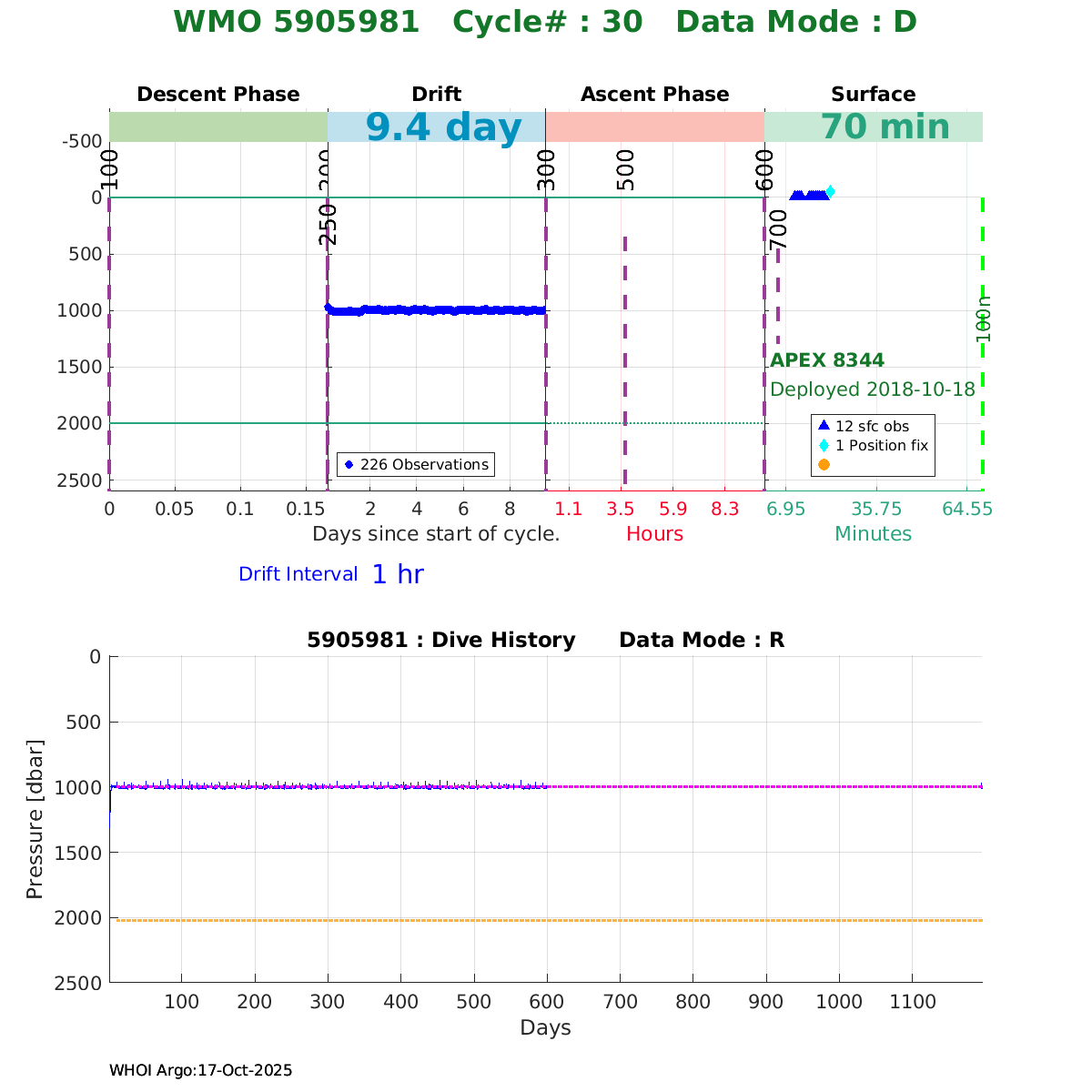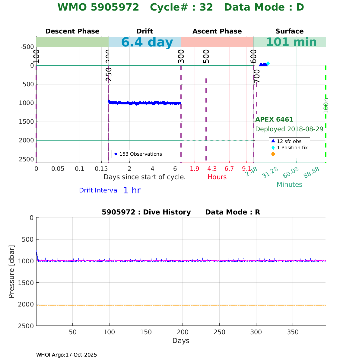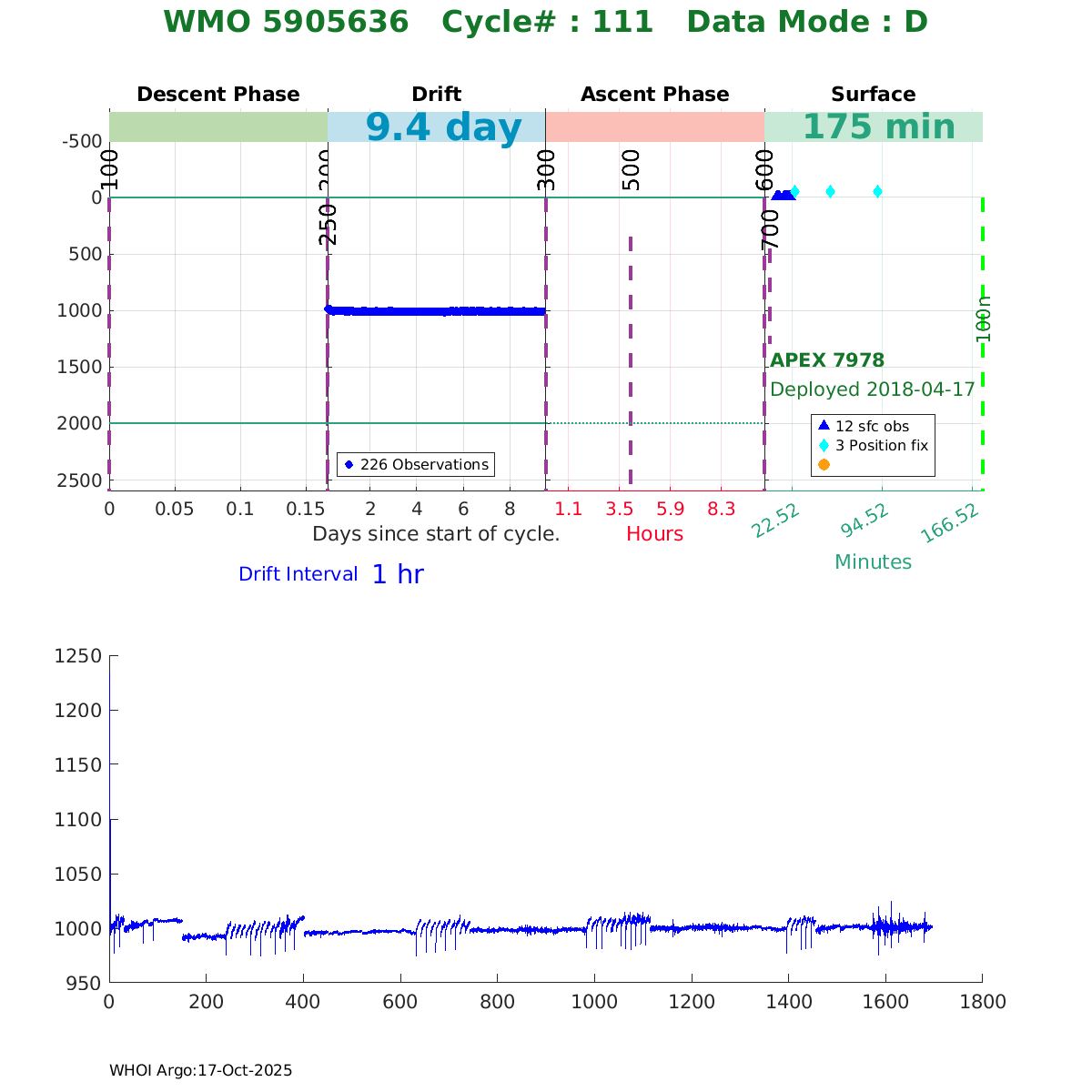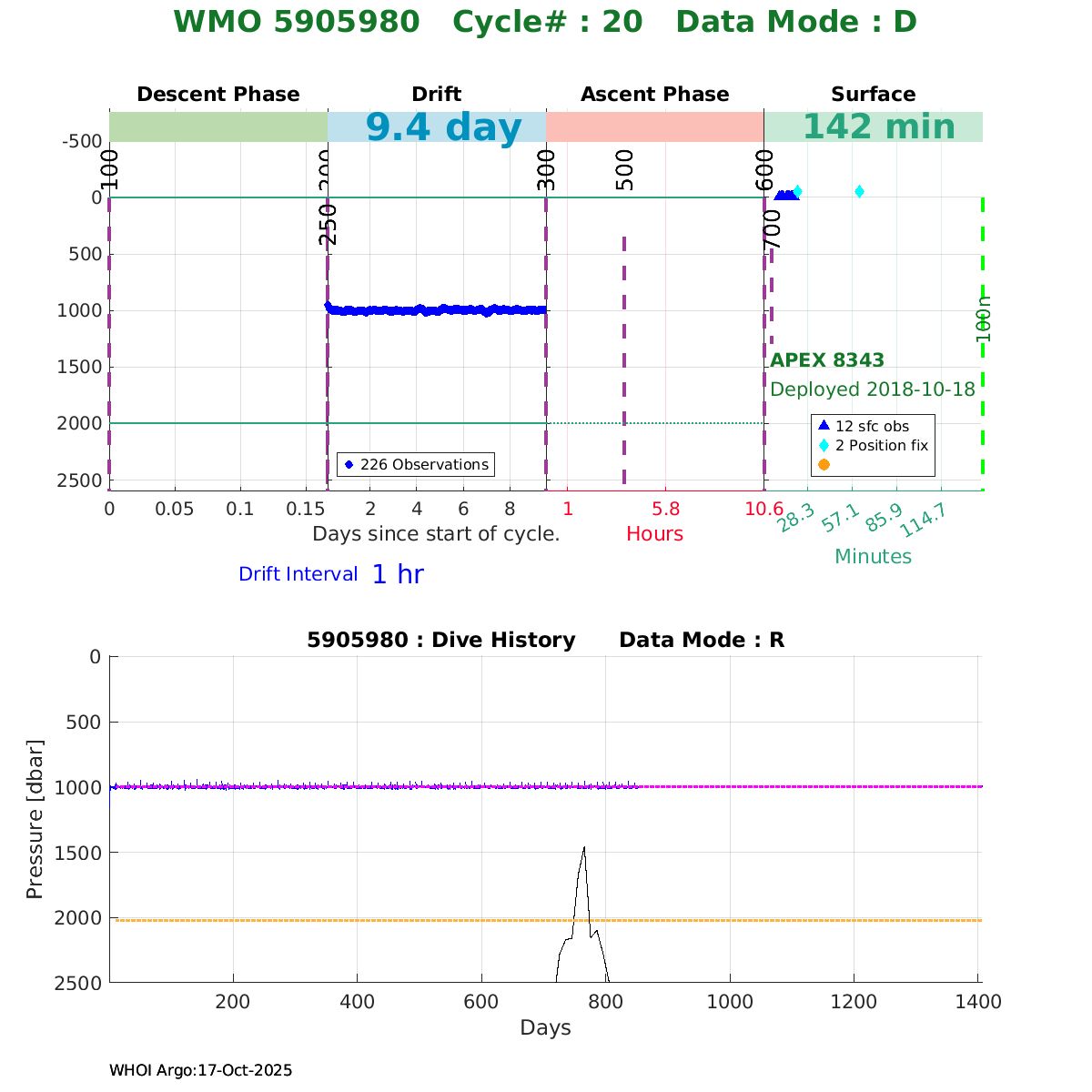 | WMO: #5906001 DAC: aoml PI: STEPHEN RISER, KENNETH JOHNSON APEX: #8359 SBE41CP: #10450 DRUCK_2900PSIA: #10820445 AANDERAA_OPTODE_4330: #2861 ISUS: #0810 DURA: #0810 ECO_FLBB_AP2: #4685 Altimeter Comparison (IFREMER) EuroArgo Link | ![]() |