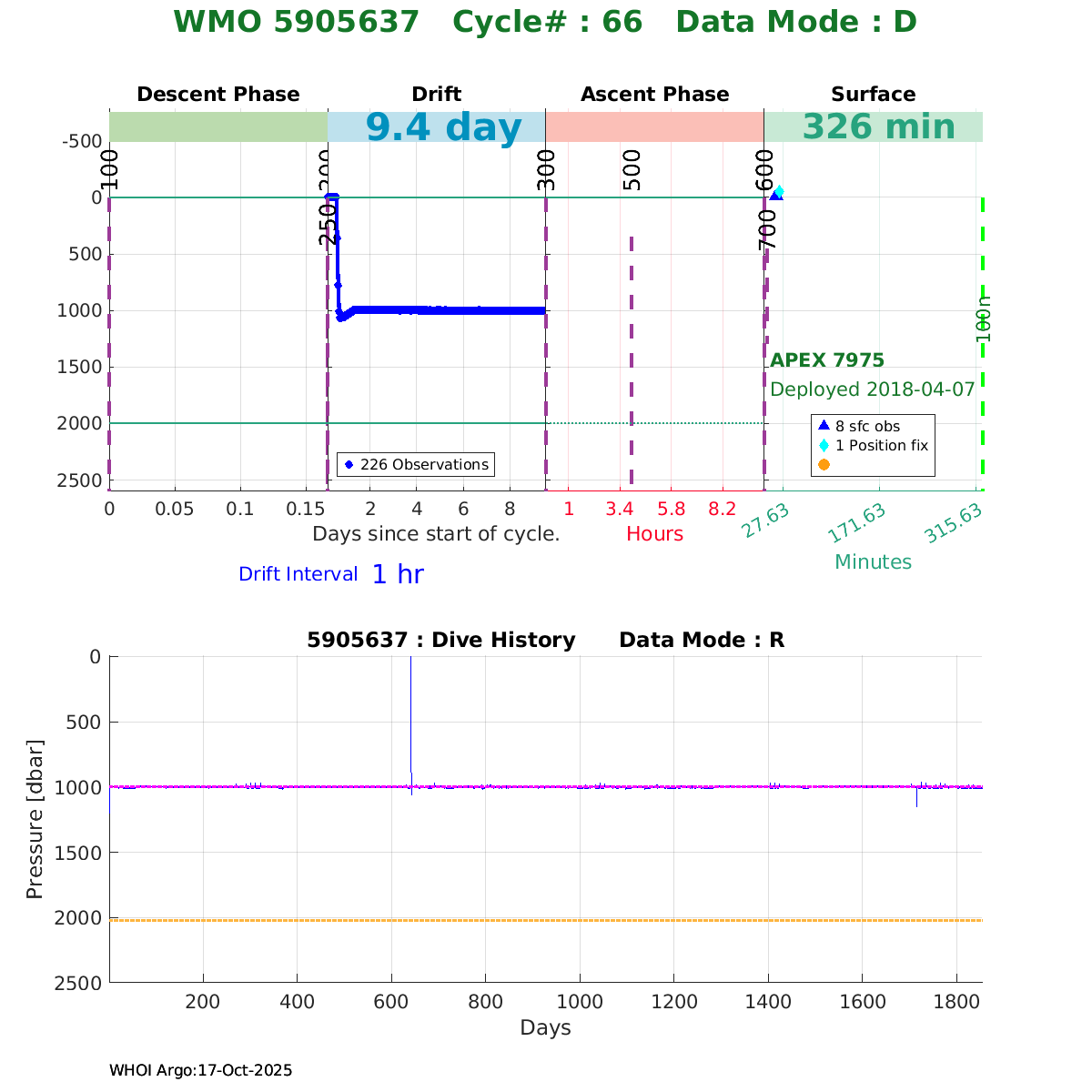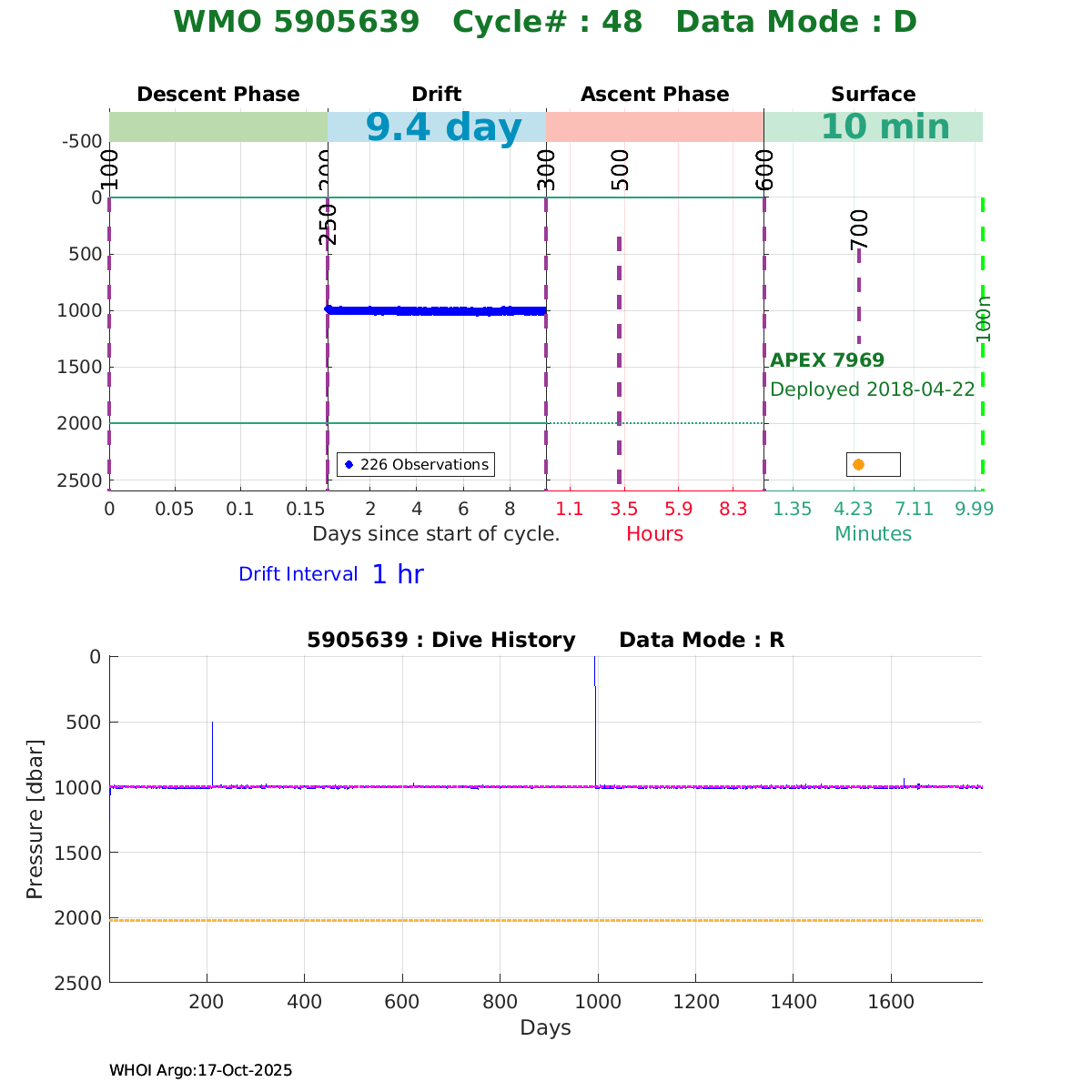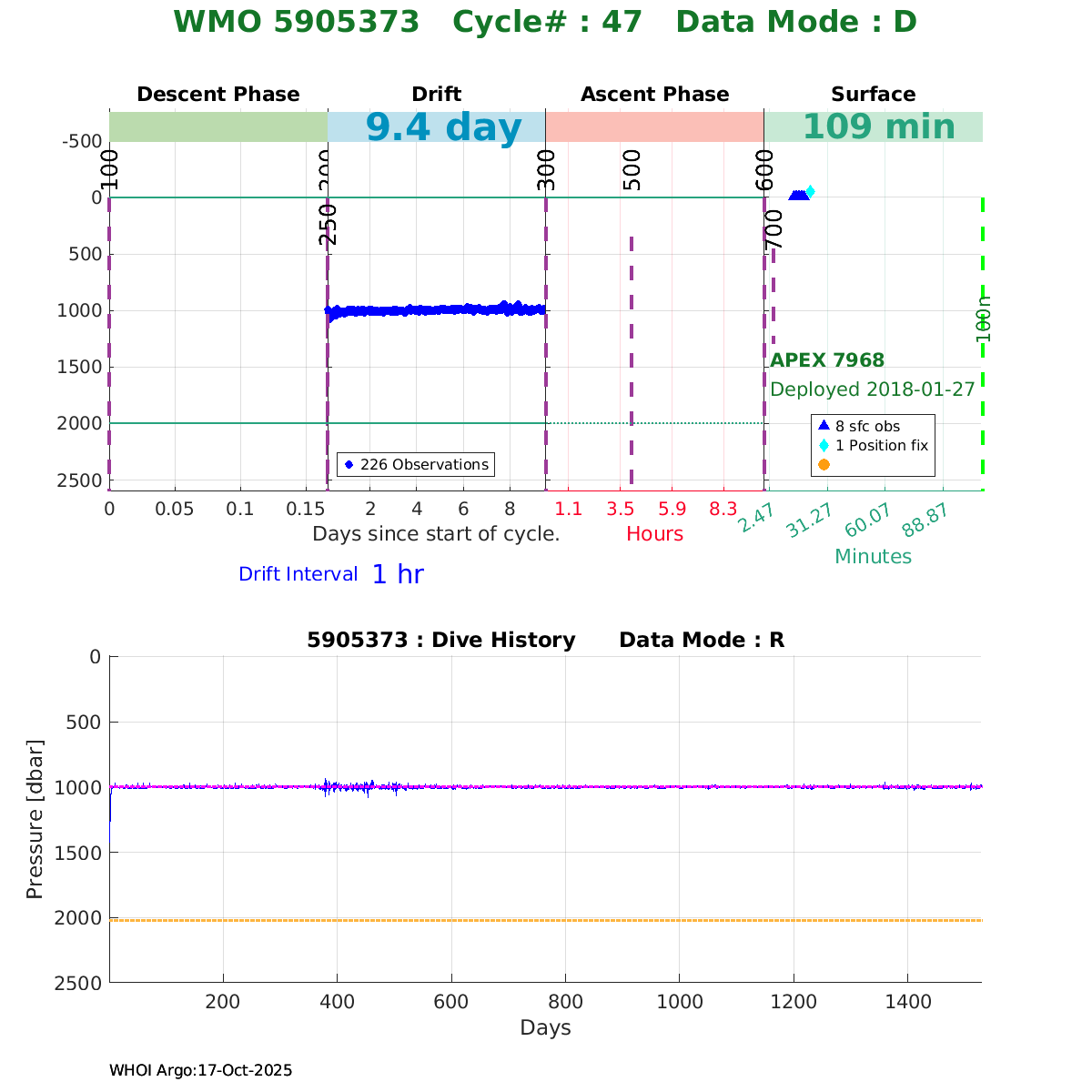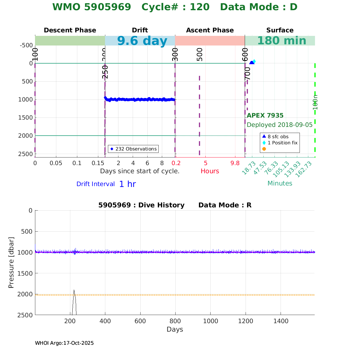| WMO: #5905637 DAC: aoml PI: STEPHEN RISER, KENNETH JOHNSON APEX: #7975 SBE41CP: #9026 DRUCK_2900PSIA: #10392252 AANDERAA_OPTODE_4330: #2711 ISUS: #0799 DURA: #0799 ECO_FLBB_AP2: #4421 Altimeter Comparison (IFREMER) EuroArgo Link | ![]() |