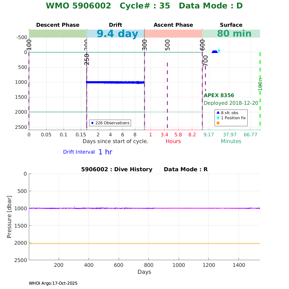 | WMO: #5906002 DAC: aoml PI: STEPHEN RISER, KENNETH JOHNSON APEX: #8356 SBE41CP: #10445 DRUCK_2900PSIA: #10820450 AANDERAA_OPTODE_4330: #2858 ISUS: #0814 DURA: #0814 ECO_FLBB_AP2: #4682 Altimeter Comparison (IFREMER) EuroArgo Link | ![]() |
