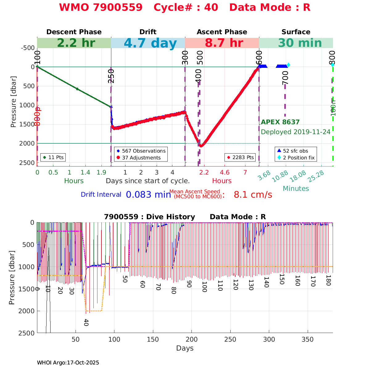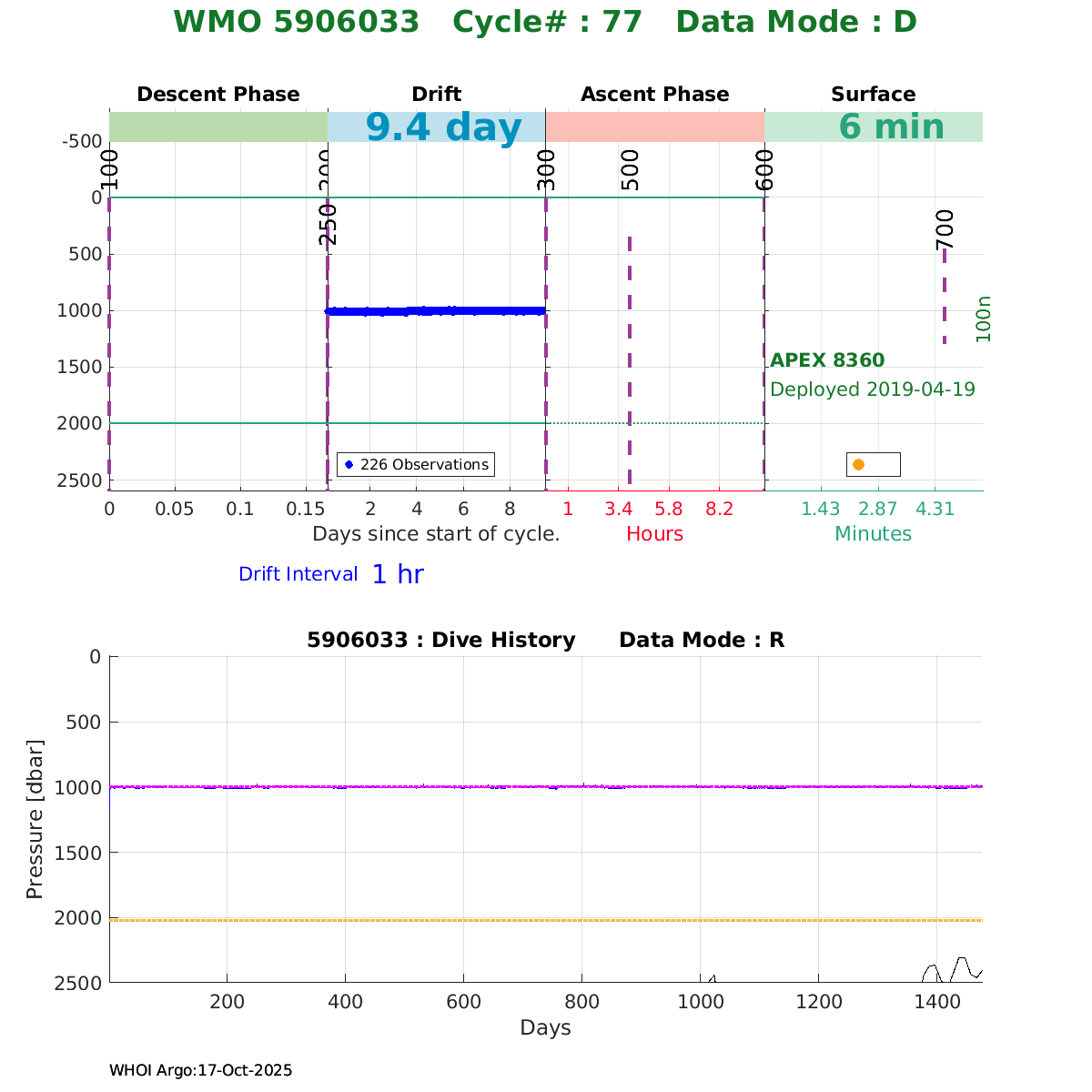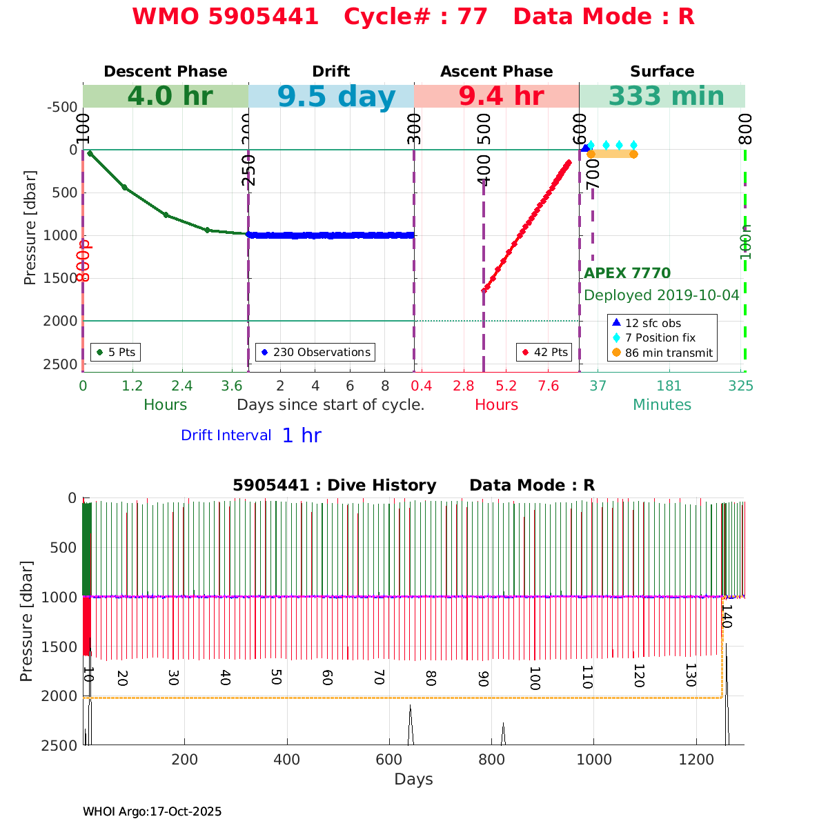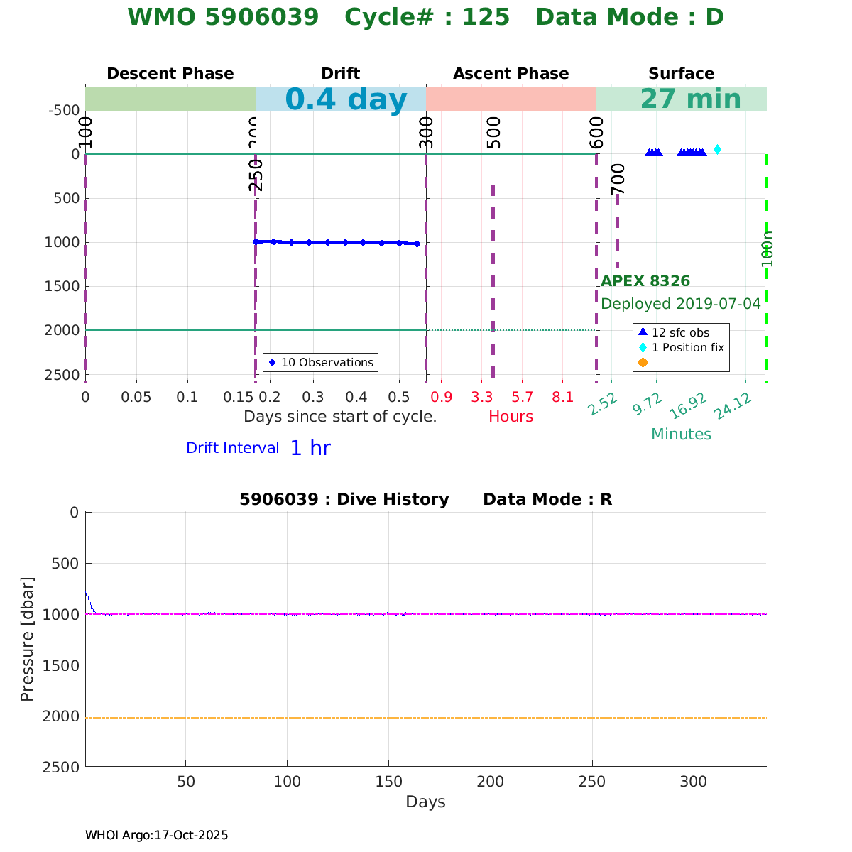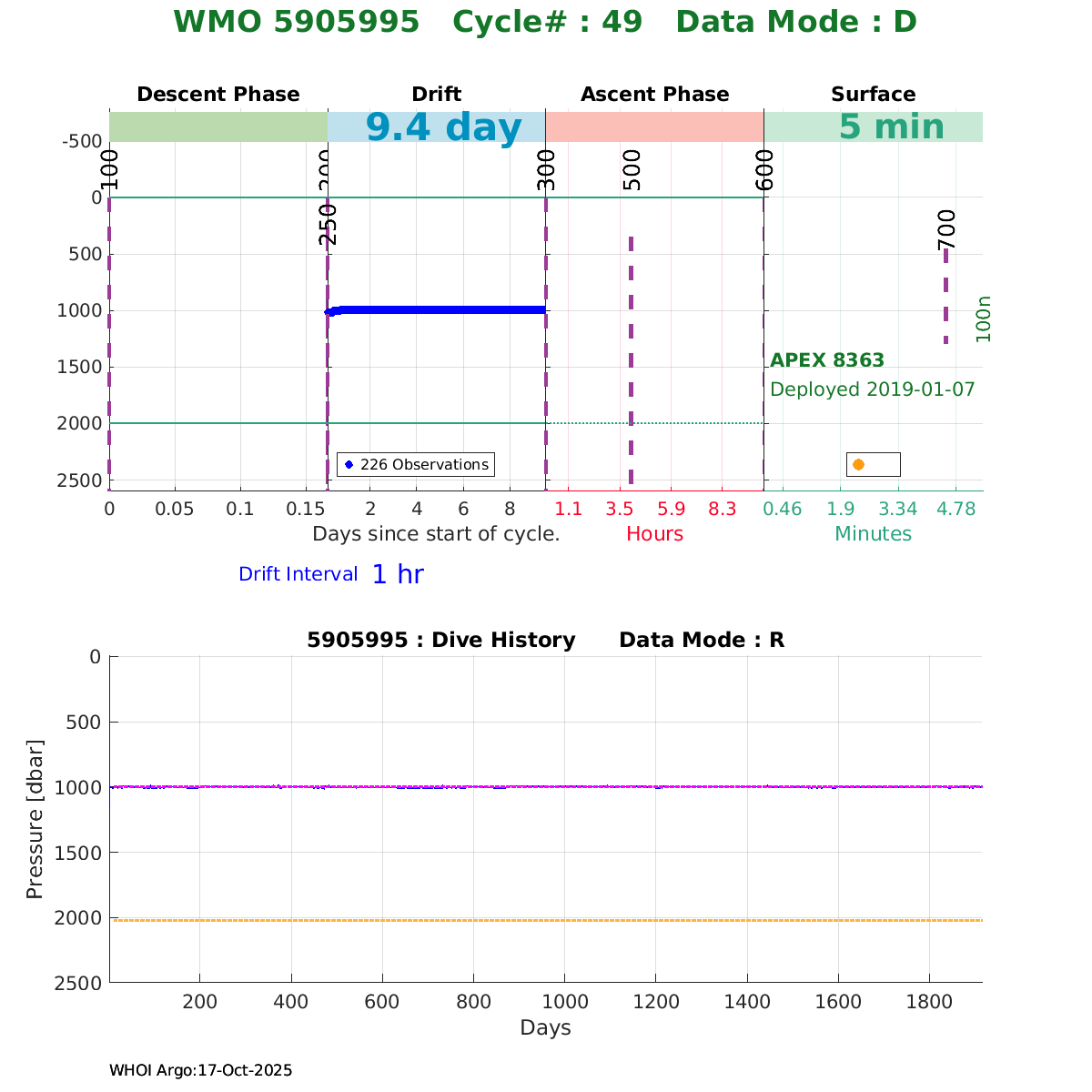 | WMO: #5906033 DAC: aoml PI: STEPHEN RISER, KENNETH JOHNSON APEX: #8360 SBE41CP: #10364 DRUCK_2900PSIA: #10783123 AANDERAA_OPTODE_4330: #2862 ISUS: #0817 DURA: #0817 ECO_FLBB_AP2: #4686 Altimeter Comparison (IFREMER) EuroArgo Link | ![]() |