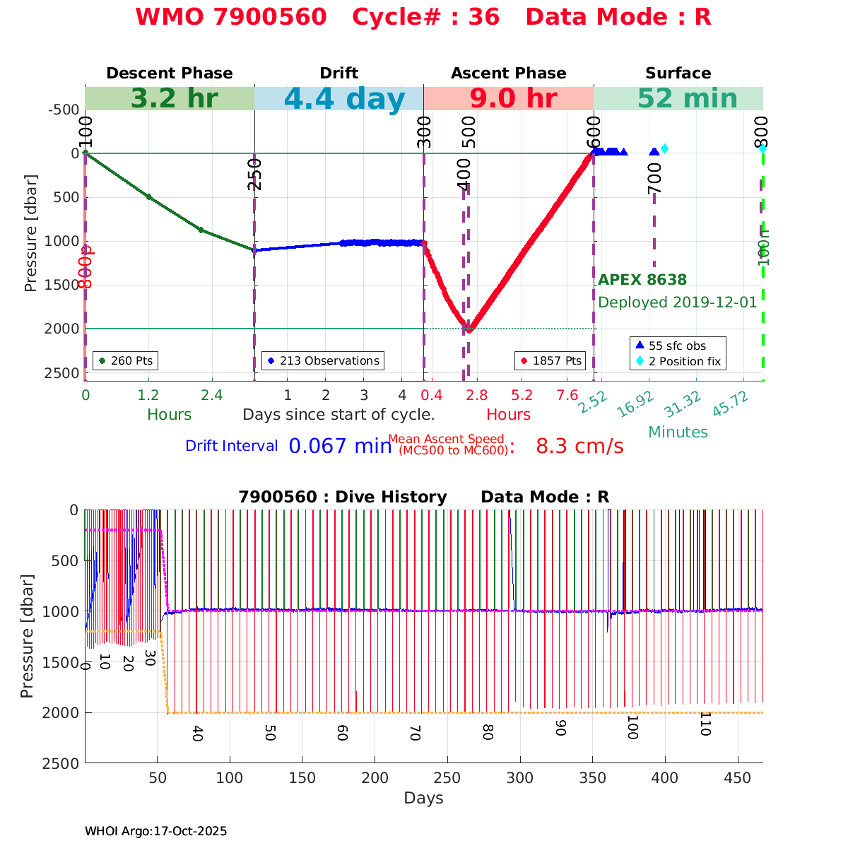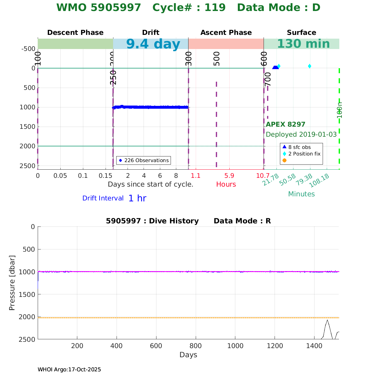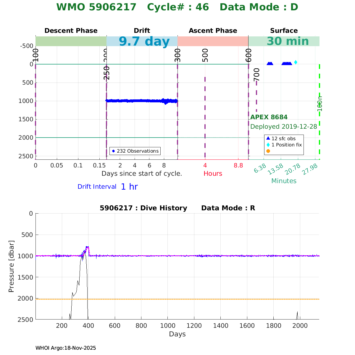 | WMO: #5906214 DAC: aoml PI: STEPHEN RISER/KEN JOHNSON APEX: #8721 SBE41CP: #11764 DRUCK_2900PSIA: #11073511 AANDERAA_OPTODE_4330: #3091 ISUS: #0853 DURA: #0853 ECO_FLBB_AP2: #5514 Altimeter Comparison (IFREMER) EuroArgo Link | ![]() |