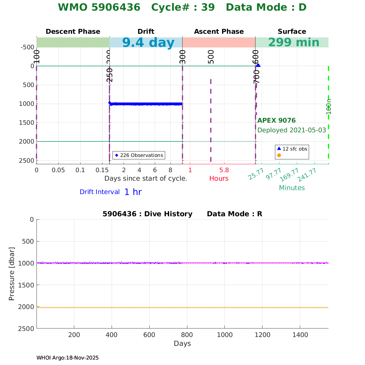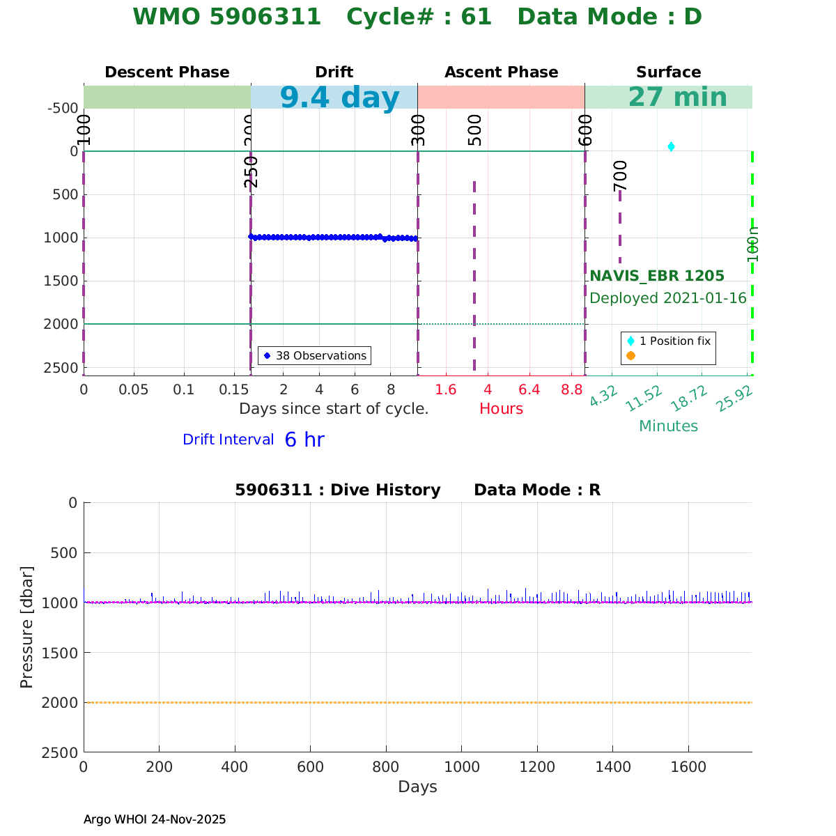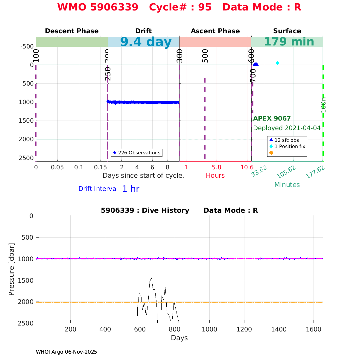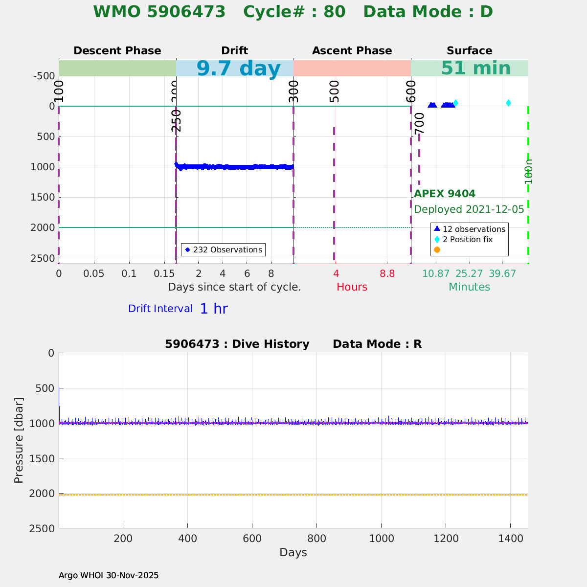 | WMO: #5906436 DAC: aoml PI: STEPHEN RISER/KEN JOHNSON APEX: #9076 SBE41CP: #12458 DRUCK_2900PSIA: #11405357 AANDERAA_OPTODE_4330: #3301 ISUS: #0911 SEAFET: #0911 ECO_FLBB_AP2: #6155 Altimeter Comparison (IFREMER) EuroArgo Link | ![]() |
