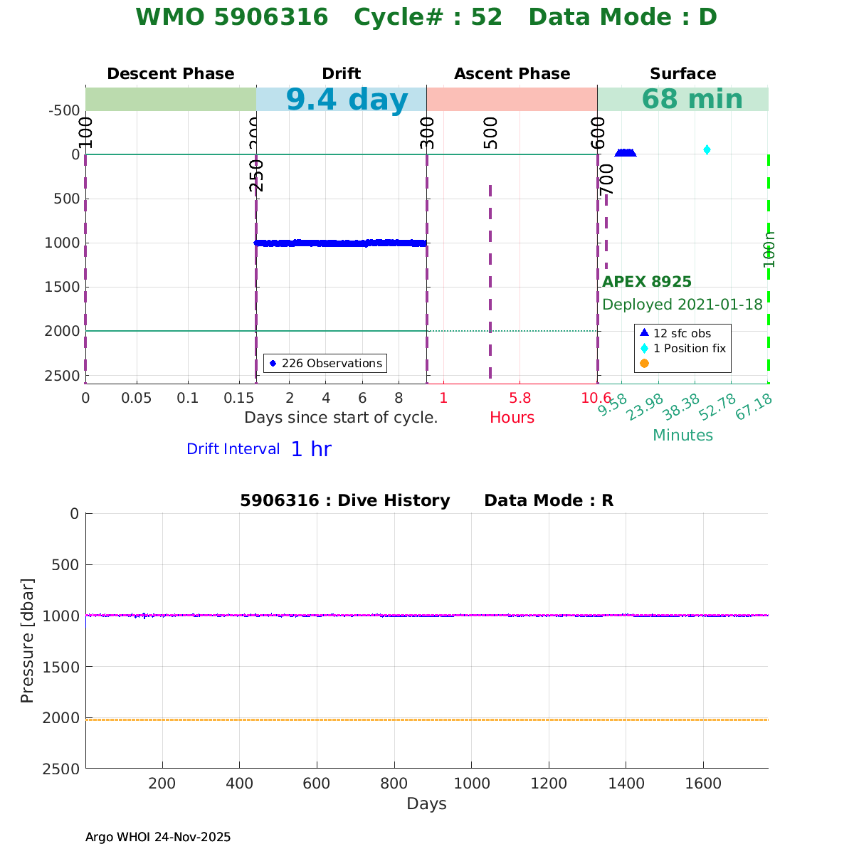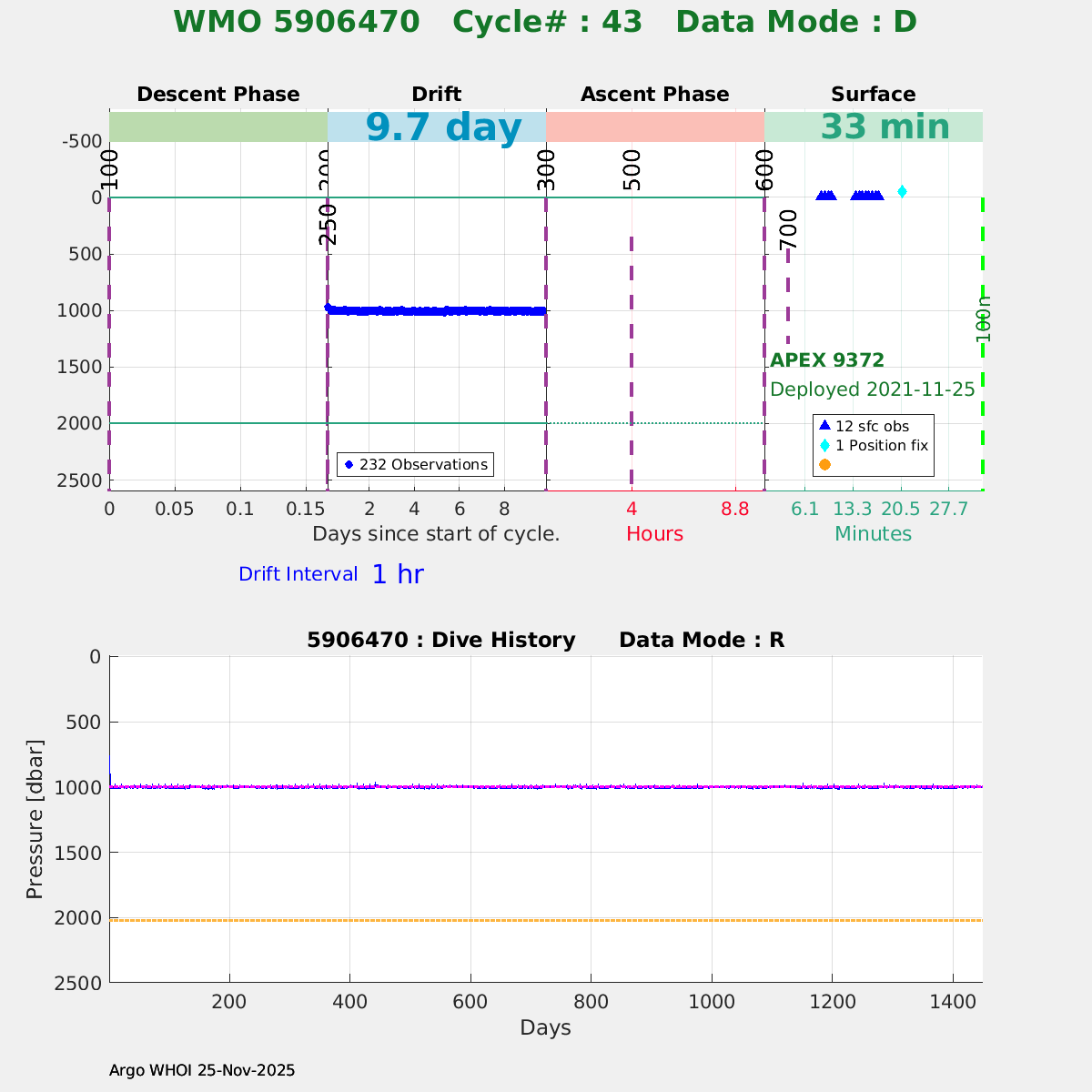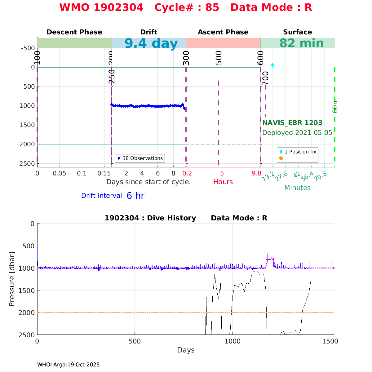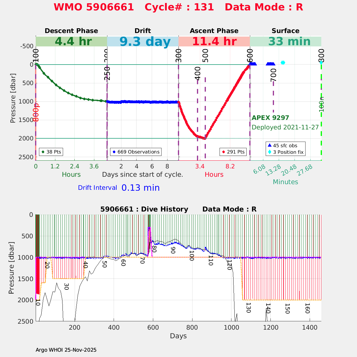 | WMO: #5906436 DAC: aoml PI: STEPHEN RISER/KEN JOHNSON APEX: #9076 SBE41CP: #12458 DRUCK_2900PSIA: #11405357 AANDERAA_OPTODE_4330: #3301 ISUS: #0911 SEAFET: #0911 ECO_FLBB_AP2: #6155 Altimeter Comparison (IFREMER) EuroArgo Link | ![]() |