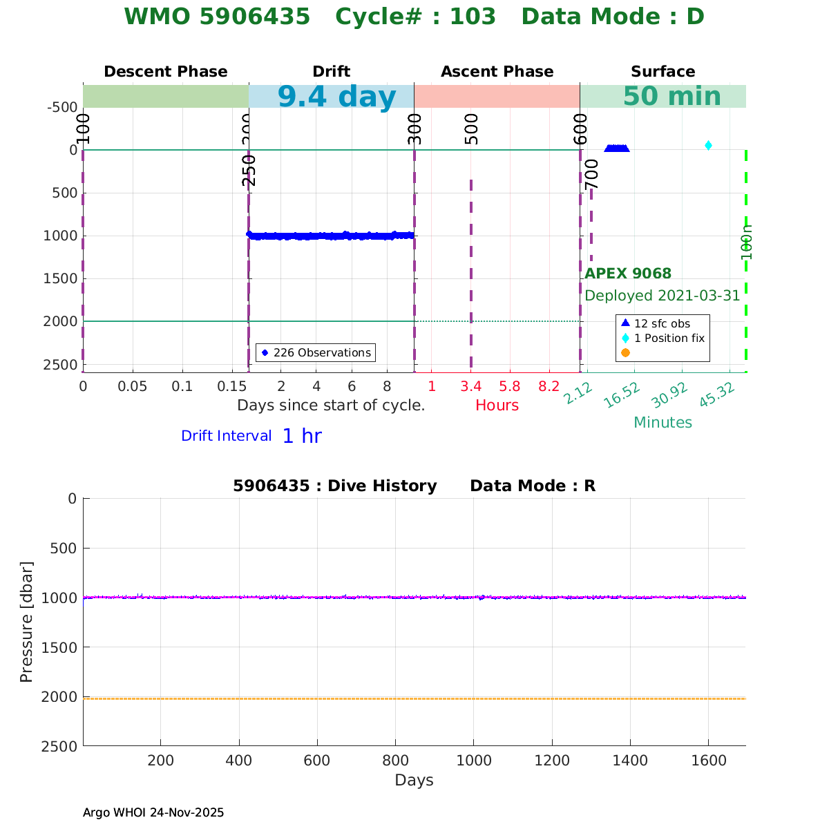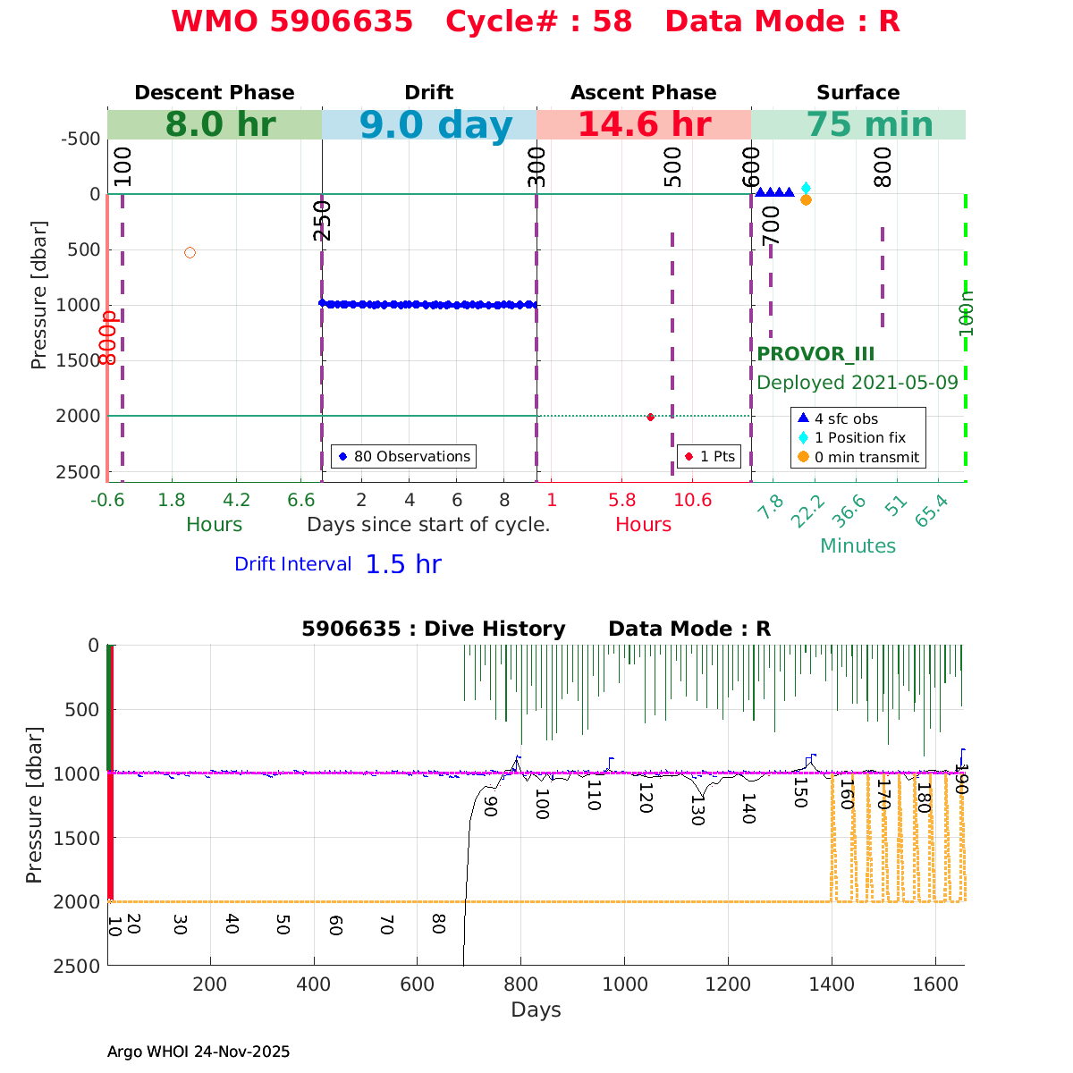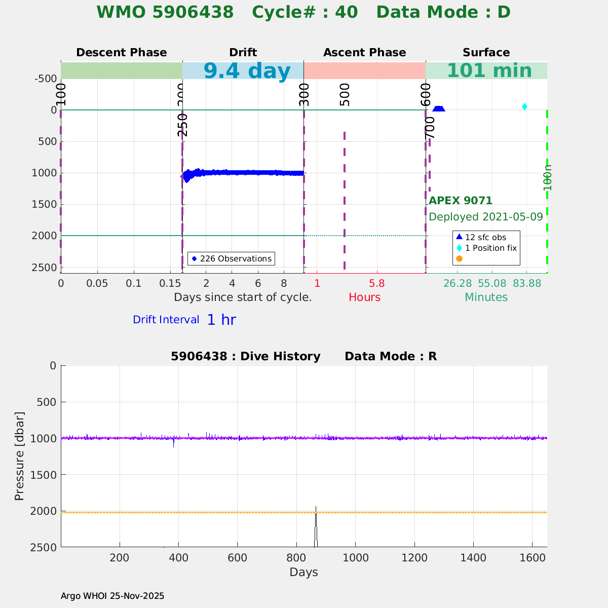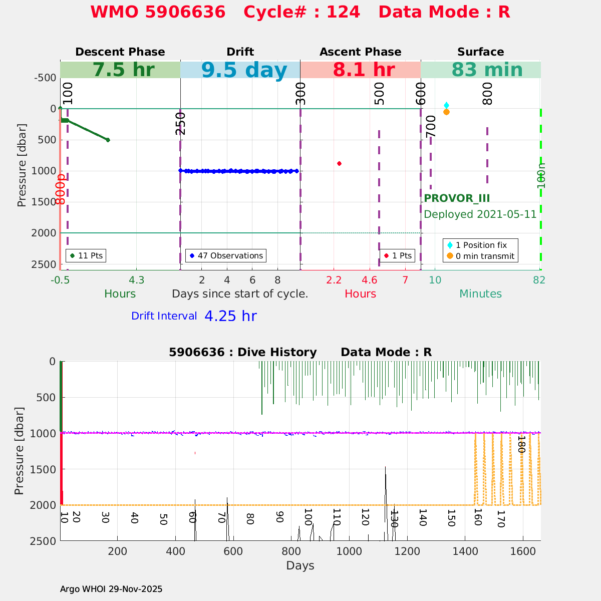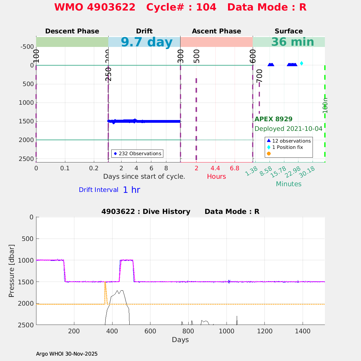 | WMO: #5906436 DAC: aoml PI: STEPHEN RISER/KEN JOHNSON APEX: #9076 SBE41CP: #12458 DRUCK_2900PSIA: #11405357 AANDERAA_OPTODE_4330: #3301 ISUS: #0911 SEAFET: #0911 ECO_FLBB_AP2: #6155 Altimeter Comparison (IFREMER) EuroArgo Link | ![]() |
