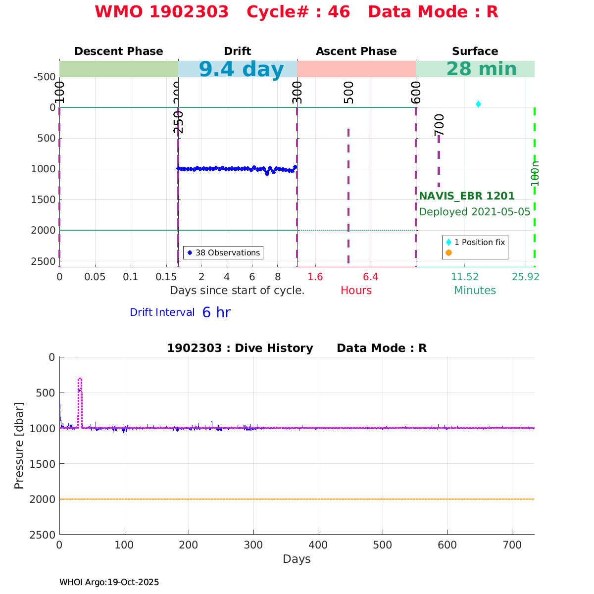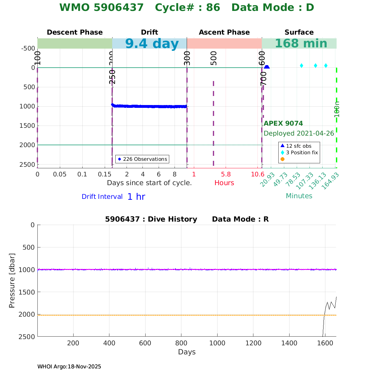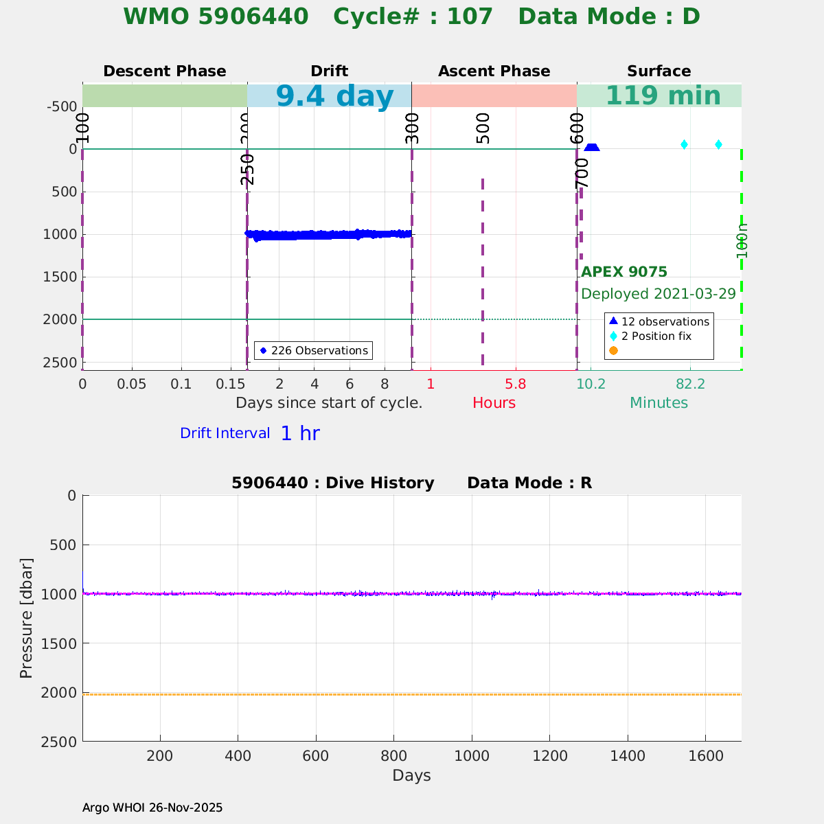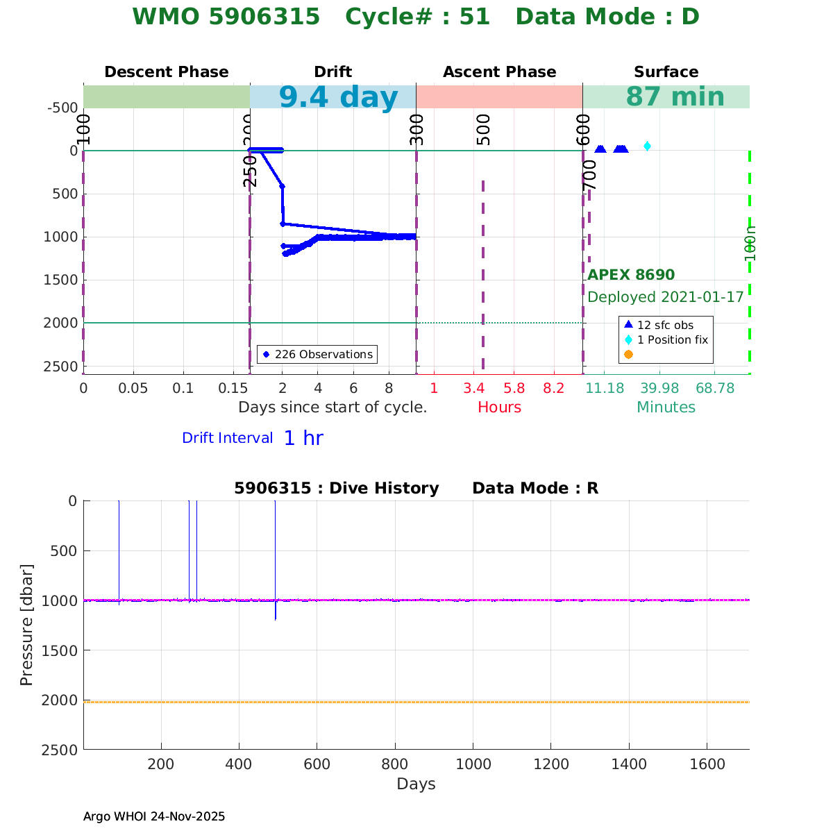 | WMO: #5906436 DAC: aoml PI: STEPHEN RISER/KEN JOHNSON APEX: #9076 SBE41CP: #12458 DRUCK_2900PSIA: #11405357 AANDERAA_OPTODE_4330: #3301 ISUS: #0911 SEAFET: #0911 ECO_FLBB_AP2: #6155 Altimeter Comparison (IFREMER) EuroArgo Link | ![]() |