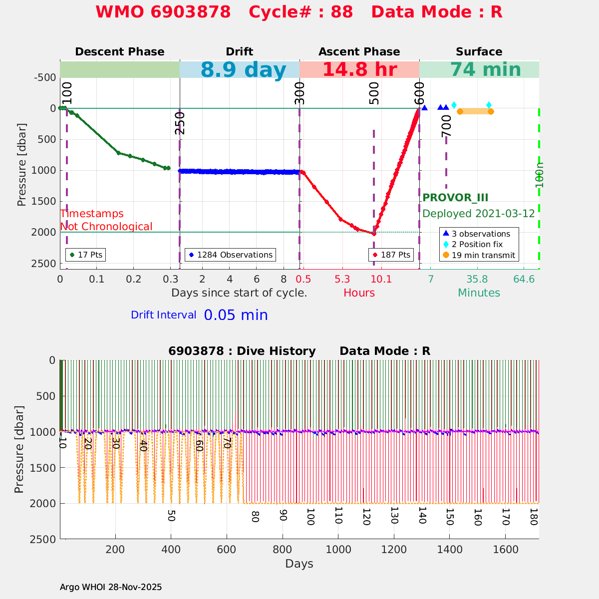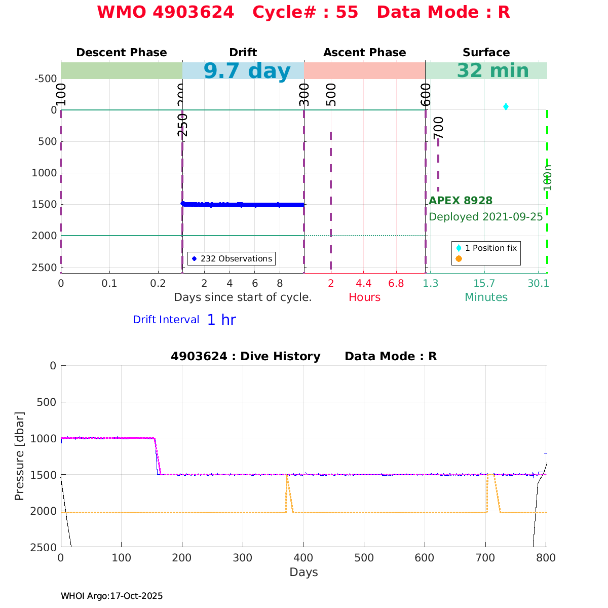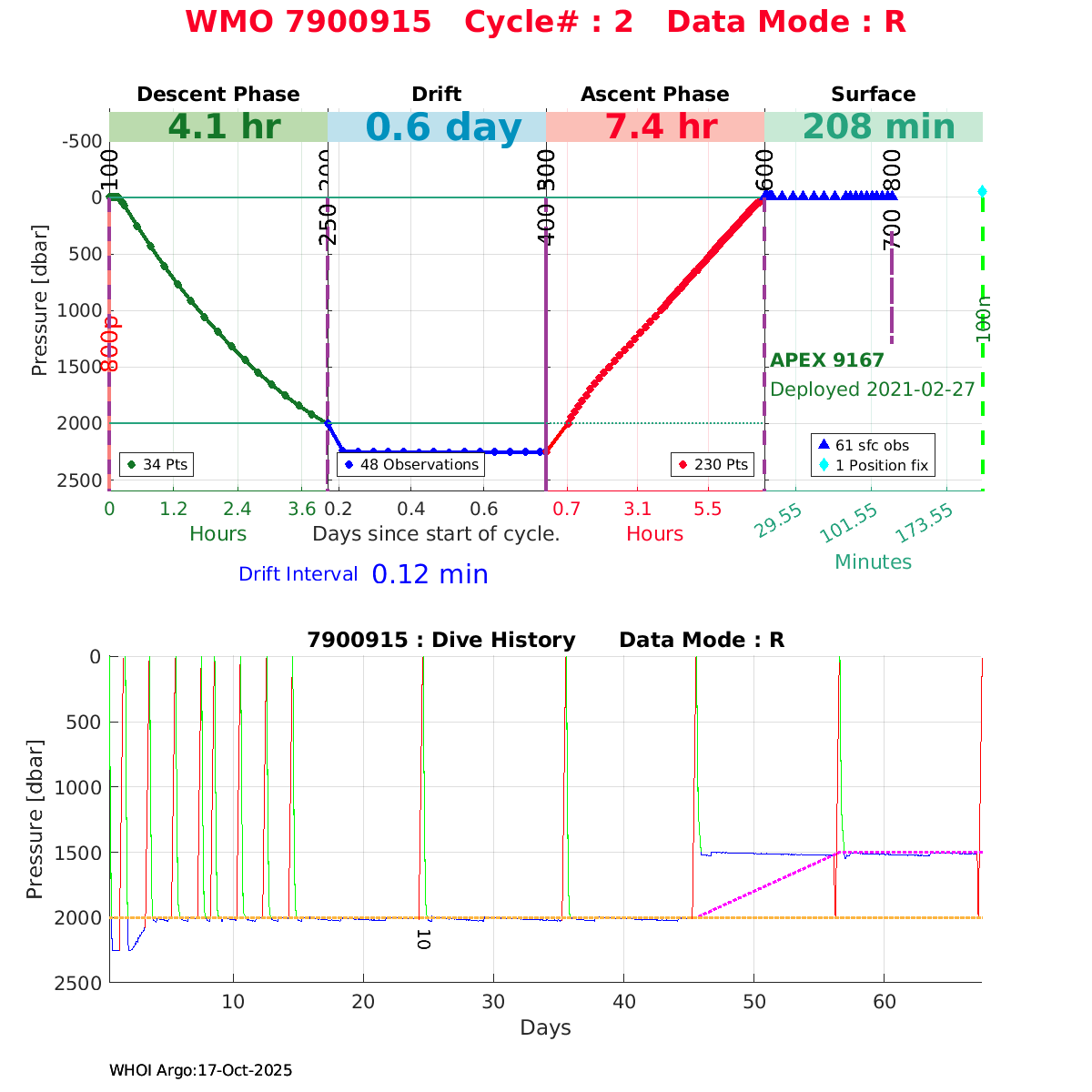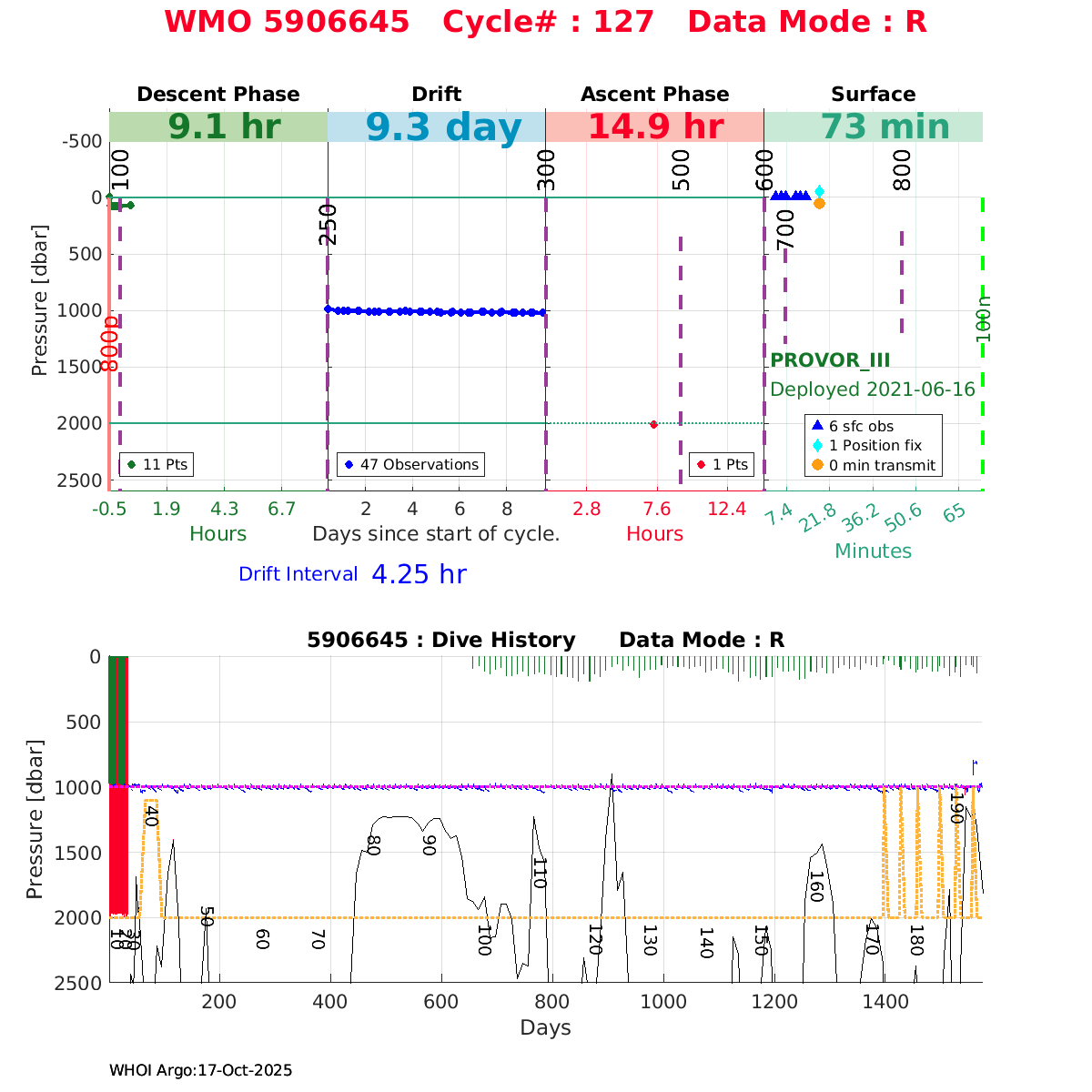 | WMO: #5906436 DAC: aoml PI: STEPHEN RISER/KEN JOHNSON APEX: #9076 SBE41CP: #12458 DRUCK_2900PSIA: #11405357 AANDERAA_OPTODE_4330: #3301 ISUS: #0911 SEAFET: #0911 ECO_FLBB_AP2: #6155 Altimeter Comparison (IFREMER) EuroArgo Link | ![]() |