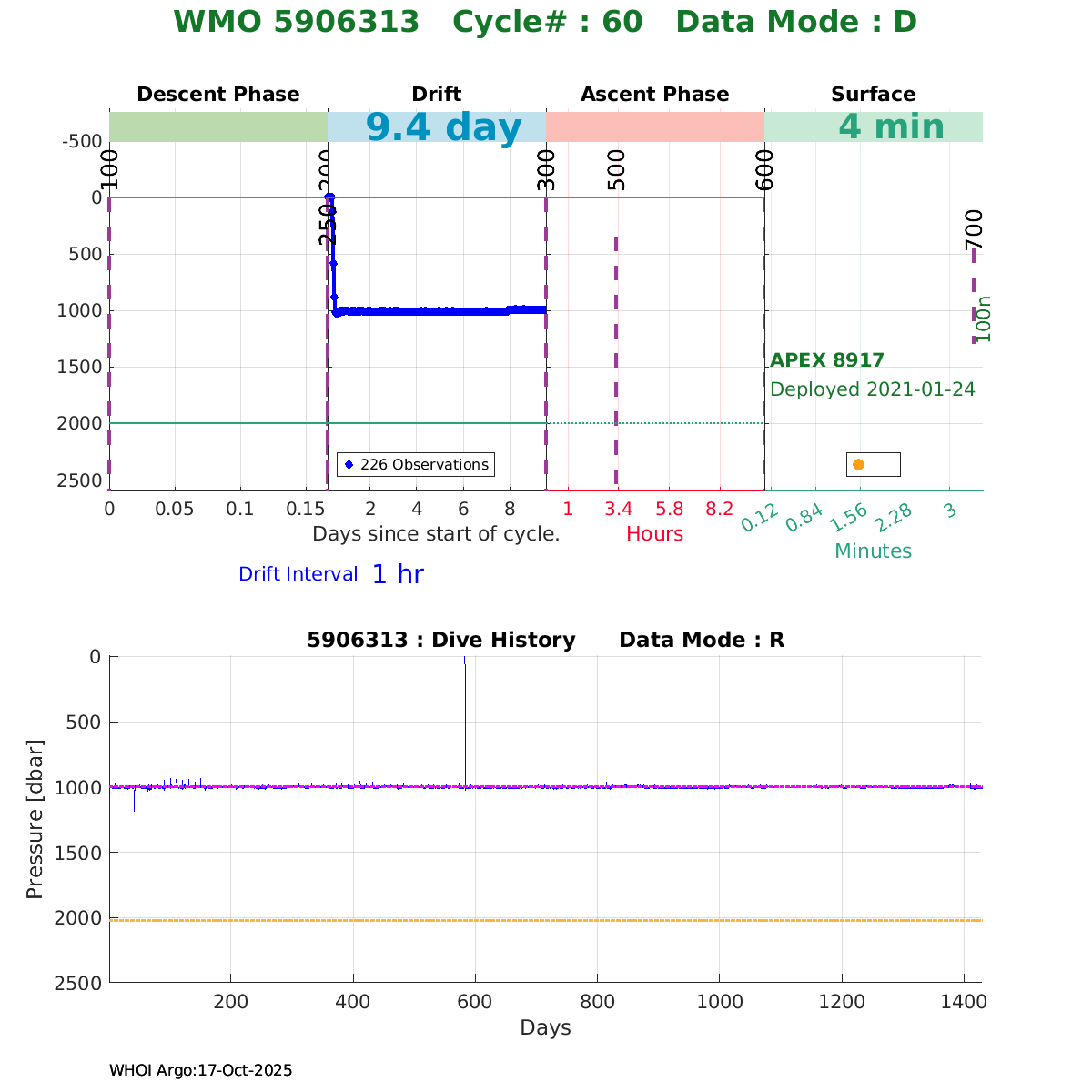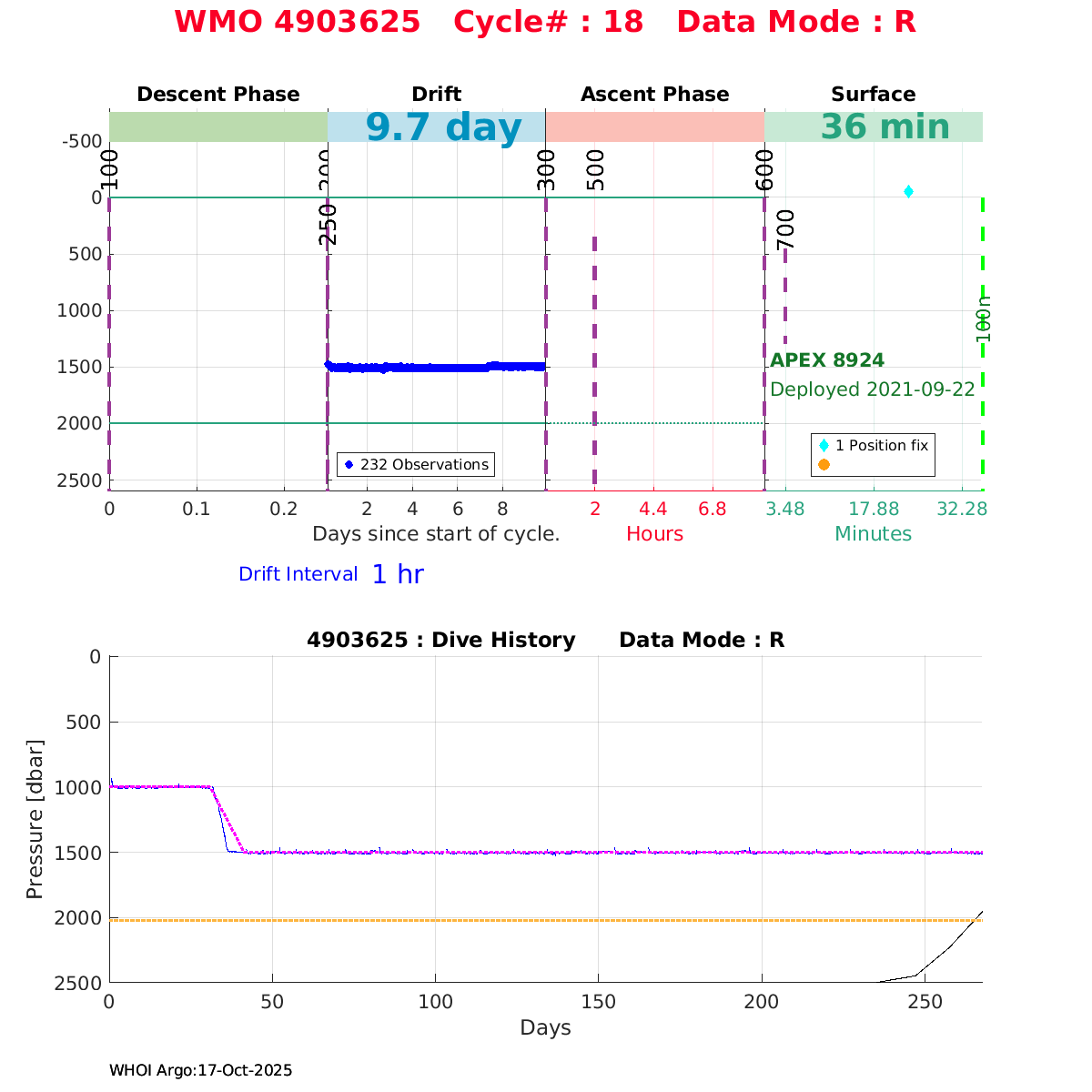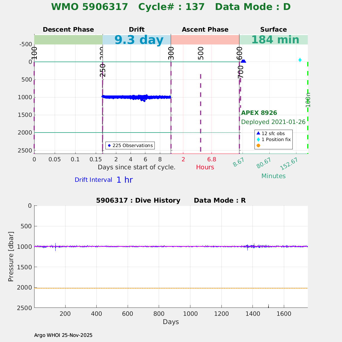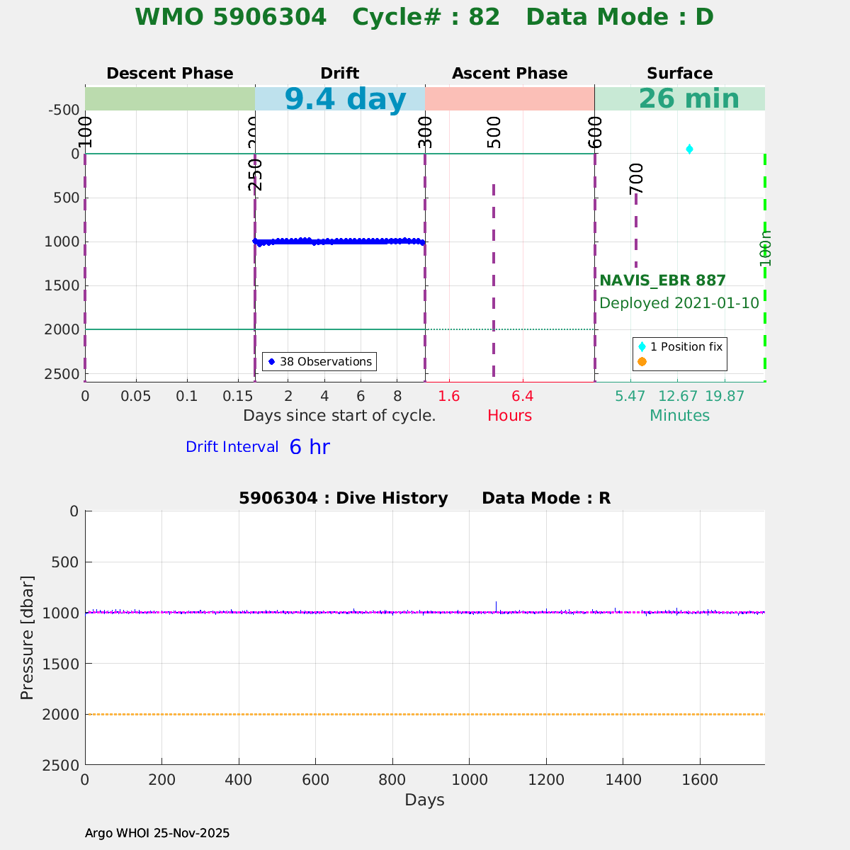 | WMO: #5906316 DAC: aoml PI: STEPHEN RISER/KEN JOHNSON APEX: #8925 SBE41CP: #12463 DRUCK_2900PSIA: #11405434 AANDERAA_OPTODE_4330: #3276 ISUS: #0895 SEAFET: #0895 ECO_FLBB_AP2: #5510 Altimeter Comparison (IFREMER) EuroArgo Link | ![]() |