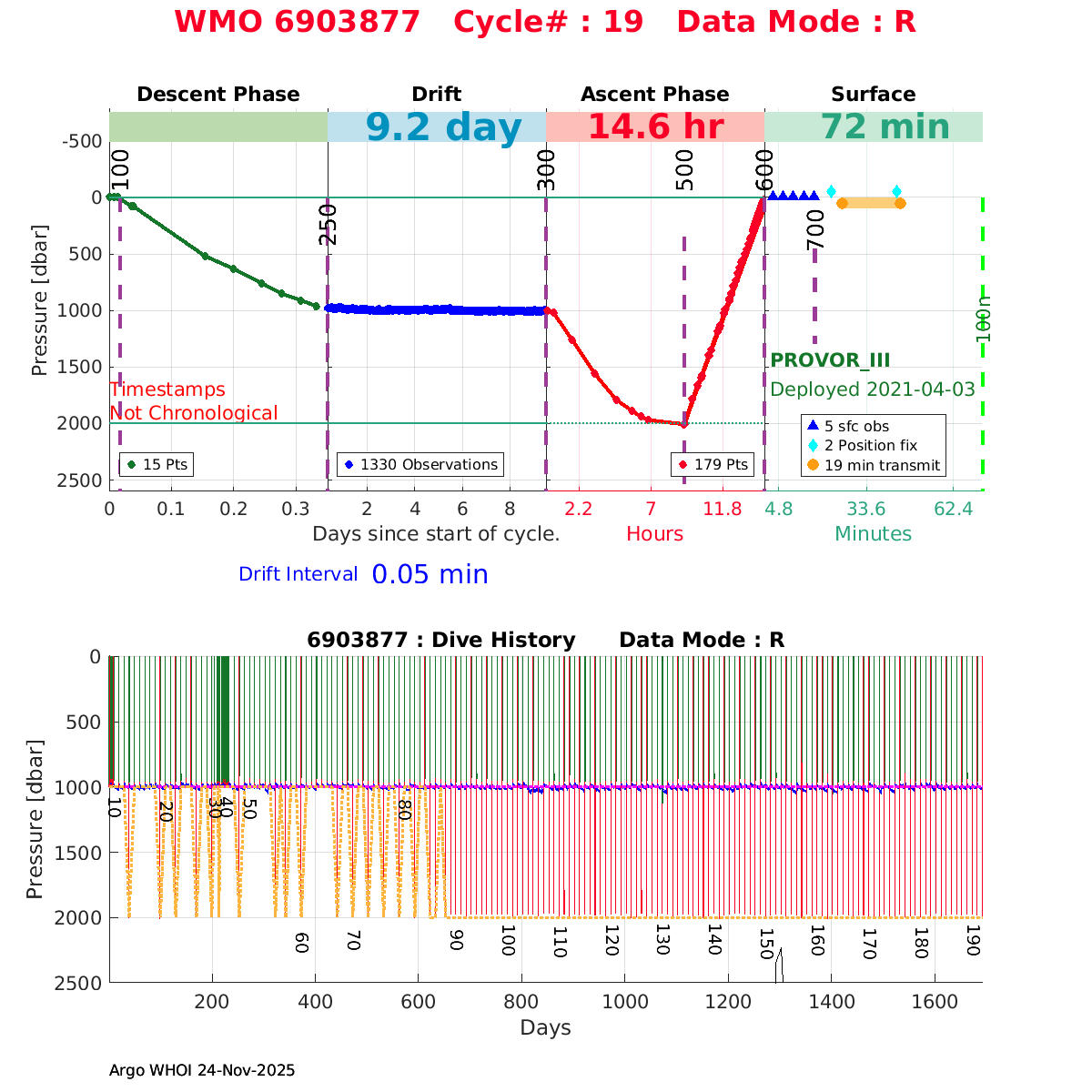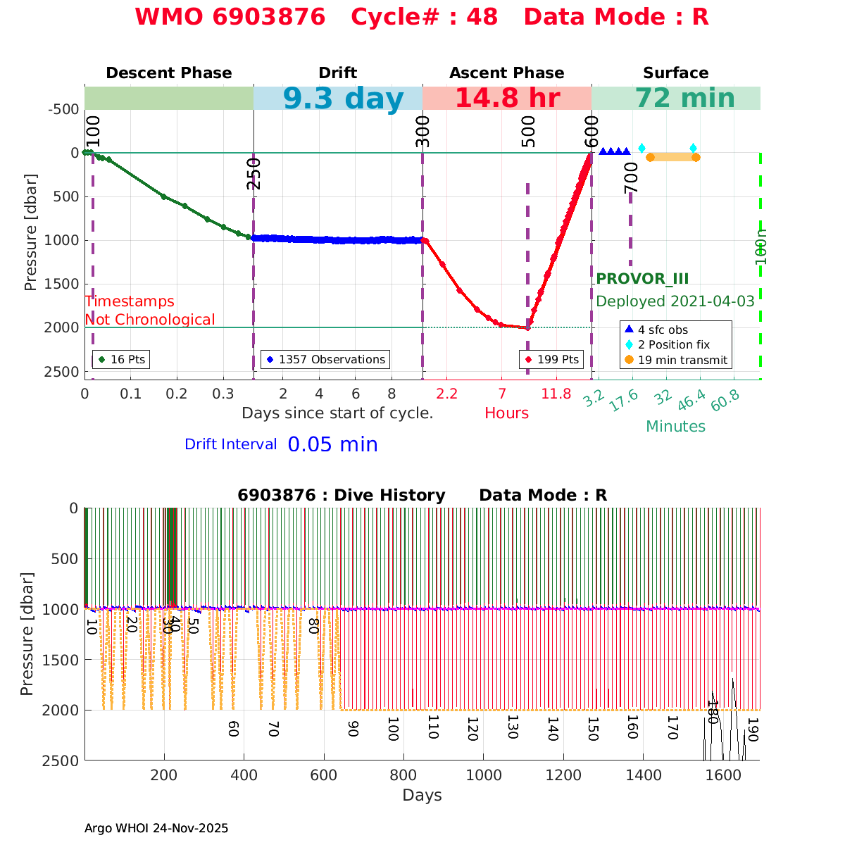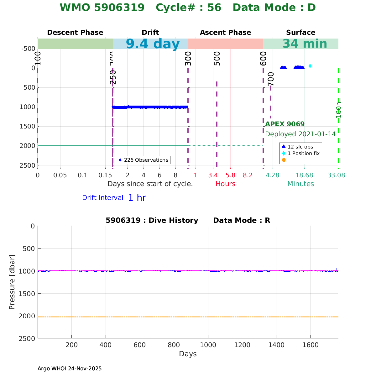 | WMO: #5906319 DAC: aoml PI: STEPHEN RISER/KEN JOHNSON APEX: #9069 SBE41CP: #12451 DRUCK_2900PSIA: #11405547 AANDERAA_OPTODE_4330: #3293 ISUS: #0903 SEAFET: #0903 ECO_FLBB_AP2: #6333 Altimeter Comparison (IFREMER) EuroArgo Link | ![]() |