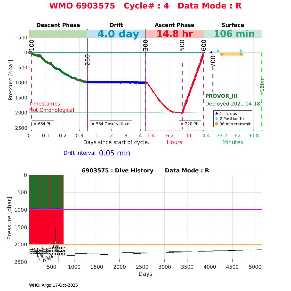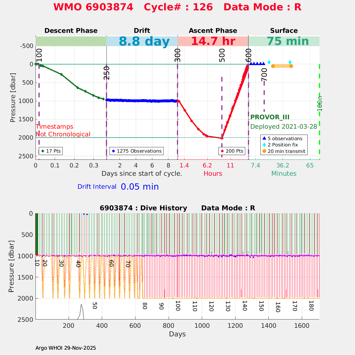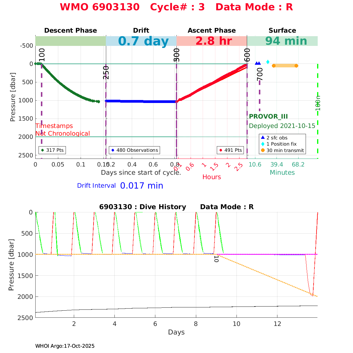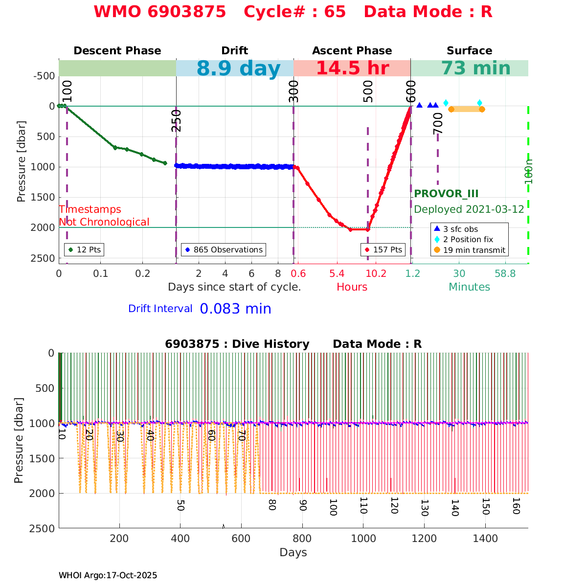 | WMO: #6903805 DAC: coriolis PI: Elena MAURI PROVOR_III: # DRUCK_2900PSIA: #11496676 SBE41CP: #12944 AANDERAA_OPTODE_4330: #3237 SATLANTIC_OCR504_ICSW: #2050 ECO_FLBBCD: #6089 SUNA_V2: #NTR-1446 SEAFET: #10581 Altimeter Comparison (IFREMER) EuroArgo Link | ![]() |